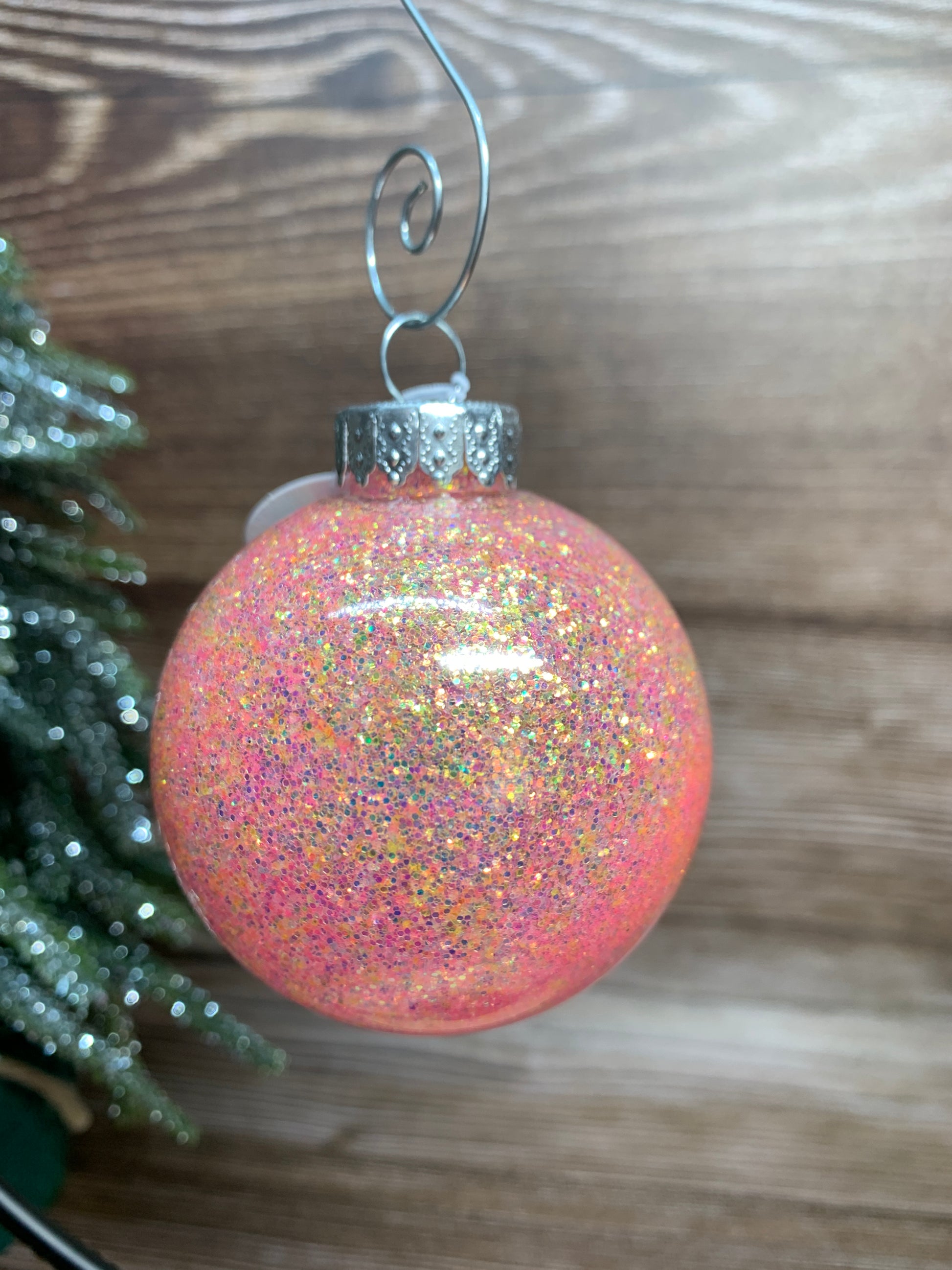 I coated the inside of this Small Round Ornament with a Fine Pink Based Glitter then painted the ornament with Aqua, Pink and Yellow Acrylic Paint