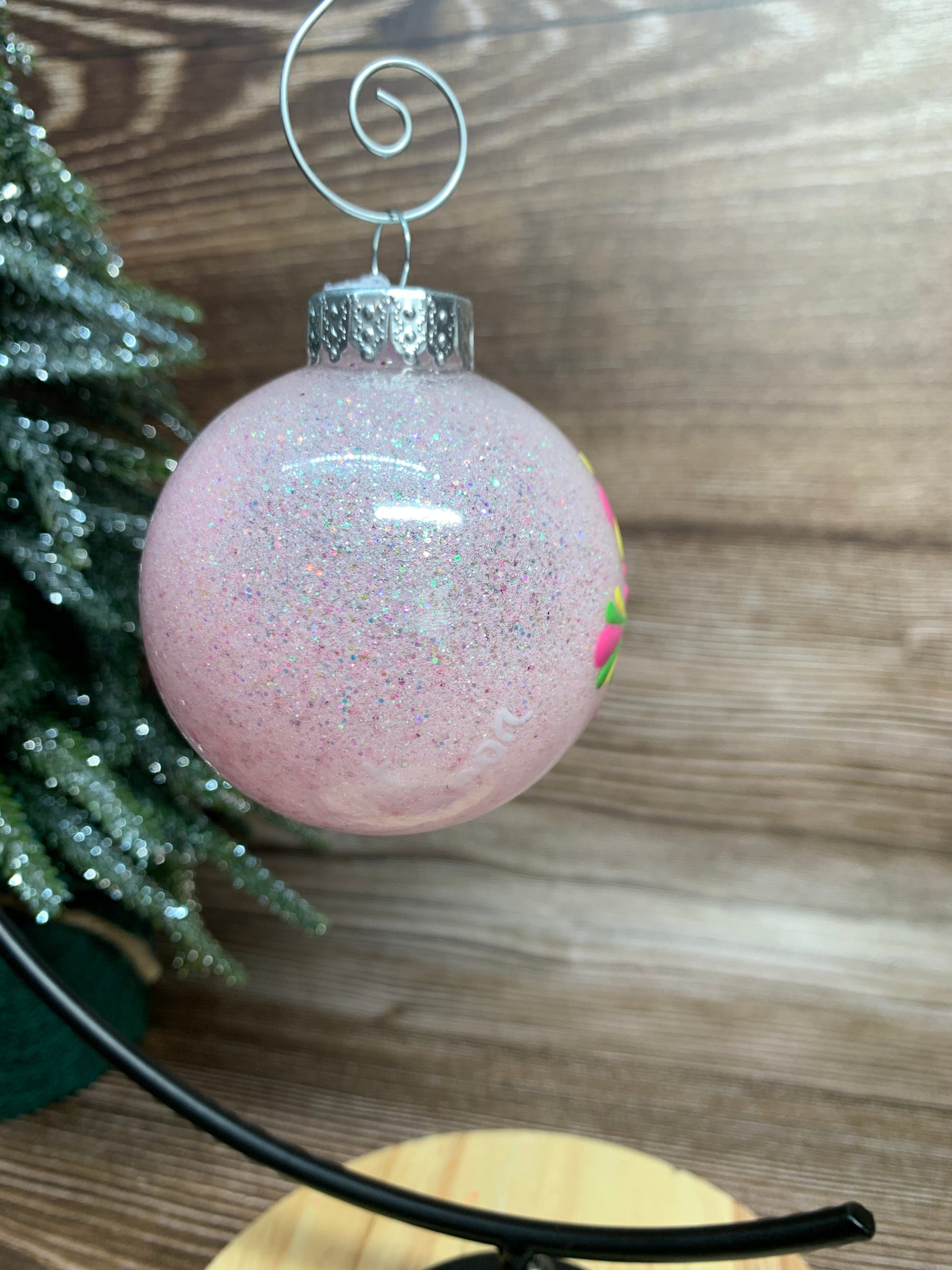 I coated the inside of this Small Round Ornament with a Fine Pink Glitter then painted the ornament with Apple Green, Fuscia Pink and Yellow Acrylic Paint