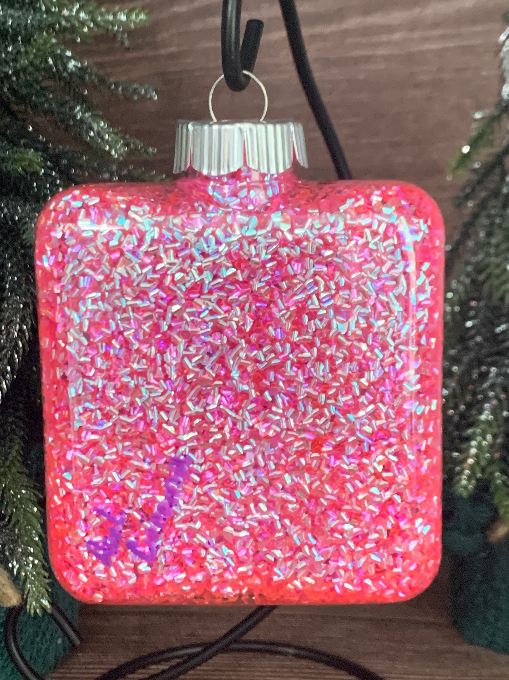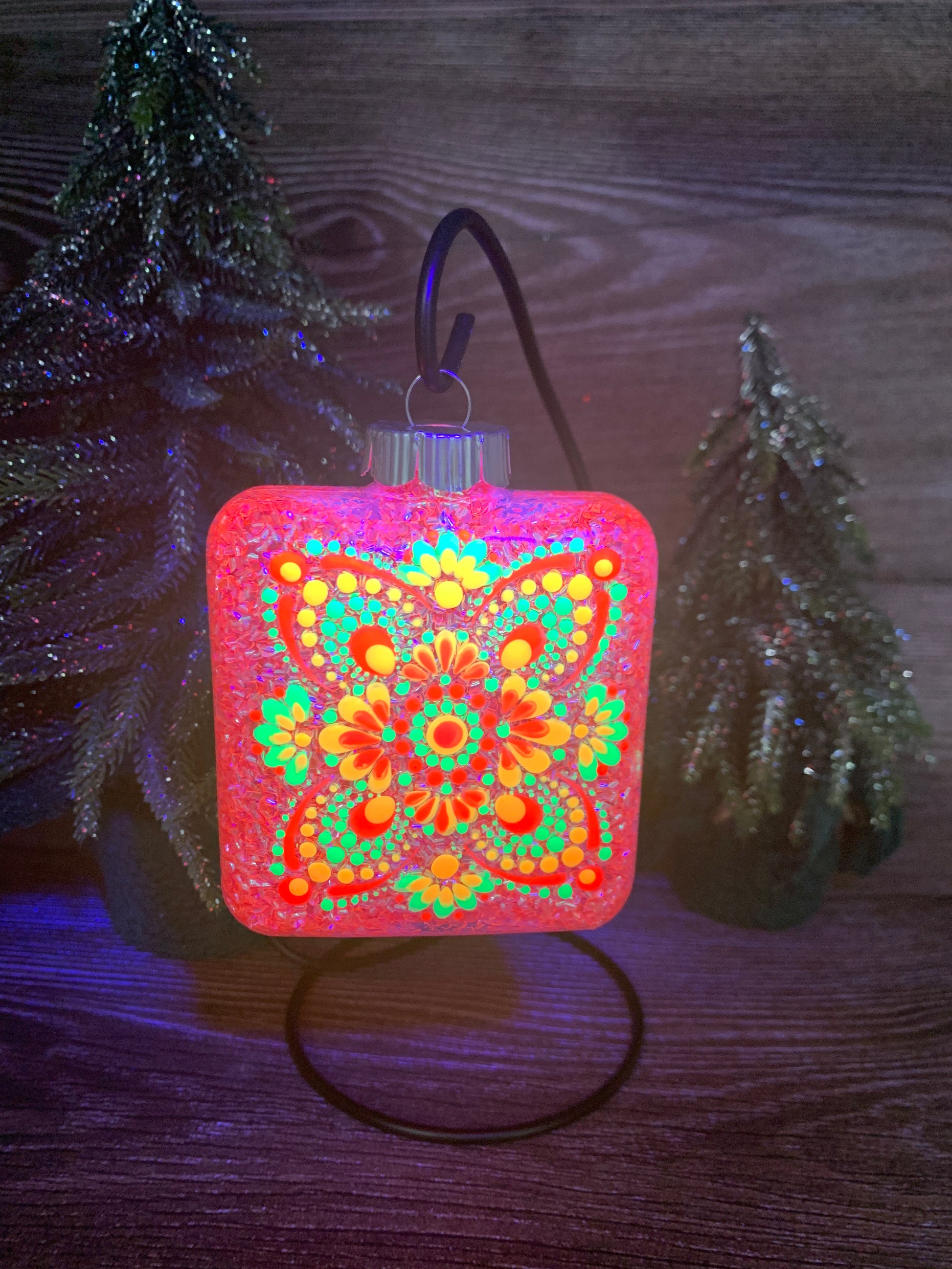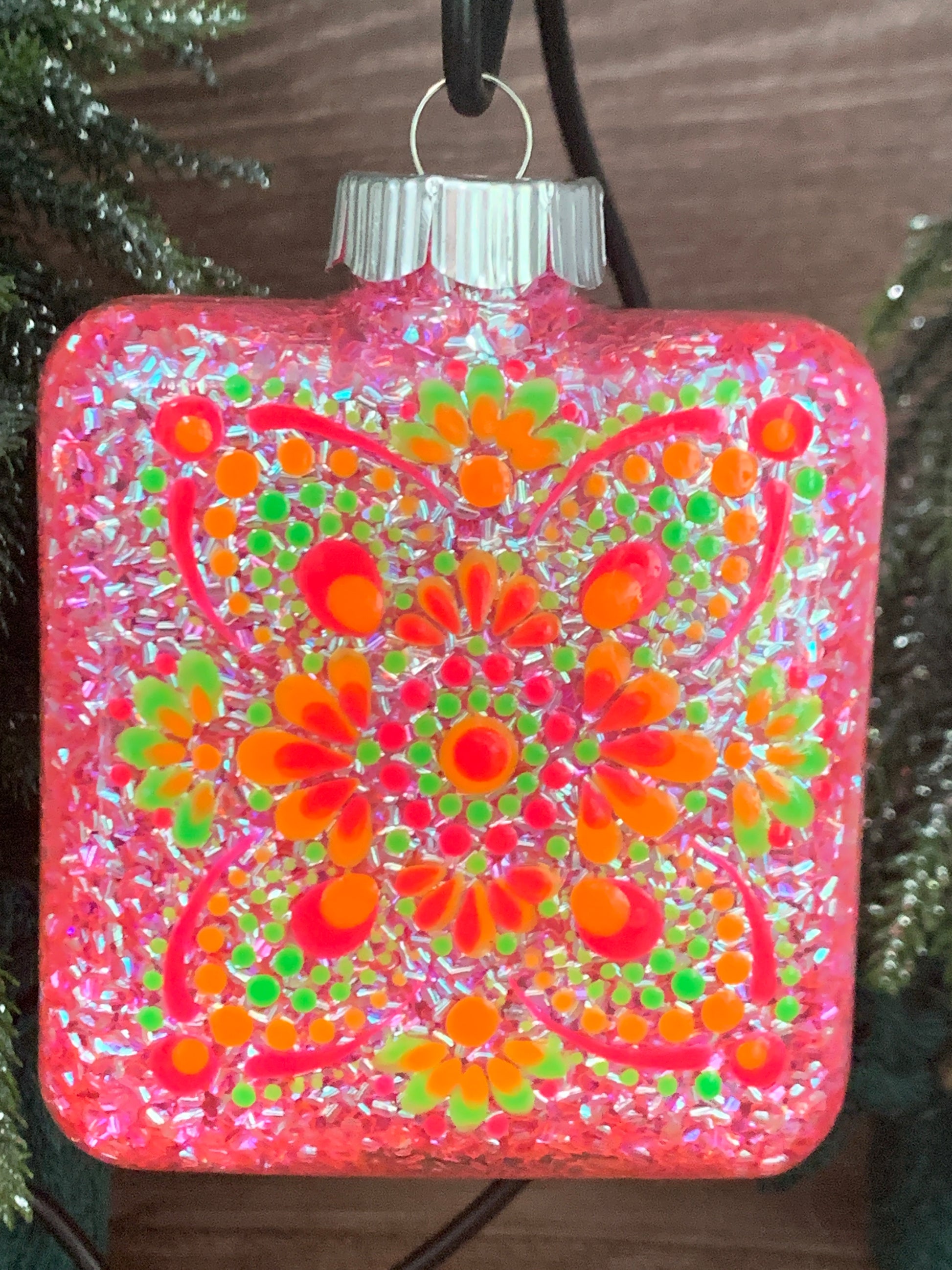This Square Ornament was treated with aVibrant pink Raindrop Glitter coating on the inside and back light reactive Pink, Green & Orange Acrylic Paint on the exterior to create the dotted mandala design.
