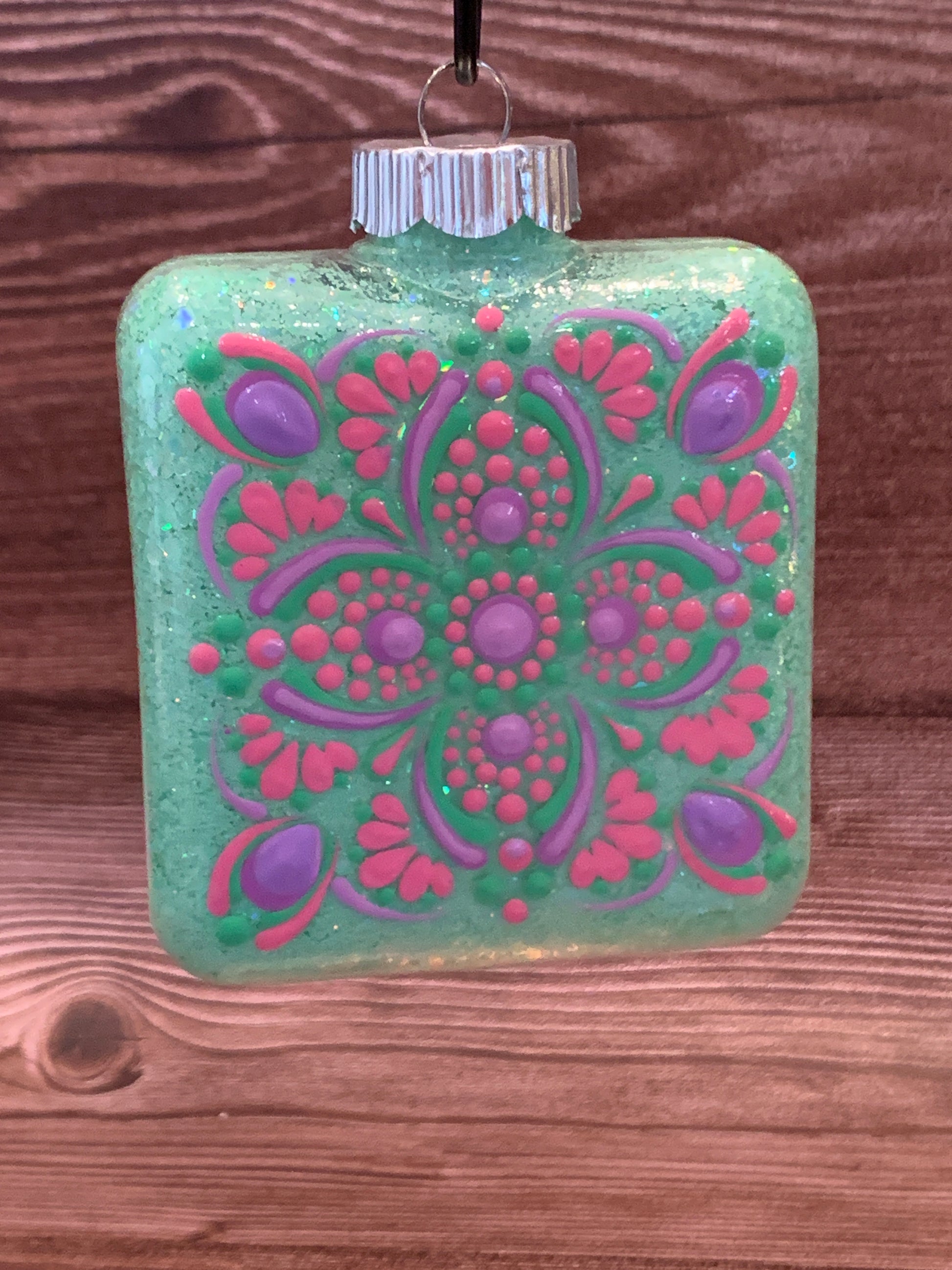 This Square Ornament was treated with aVibrant pink Raindrop Glitter coating on the inside and back light reactive Pink, Green & Orange Acrylic Paint on the exterior to create the dotted mandala design.