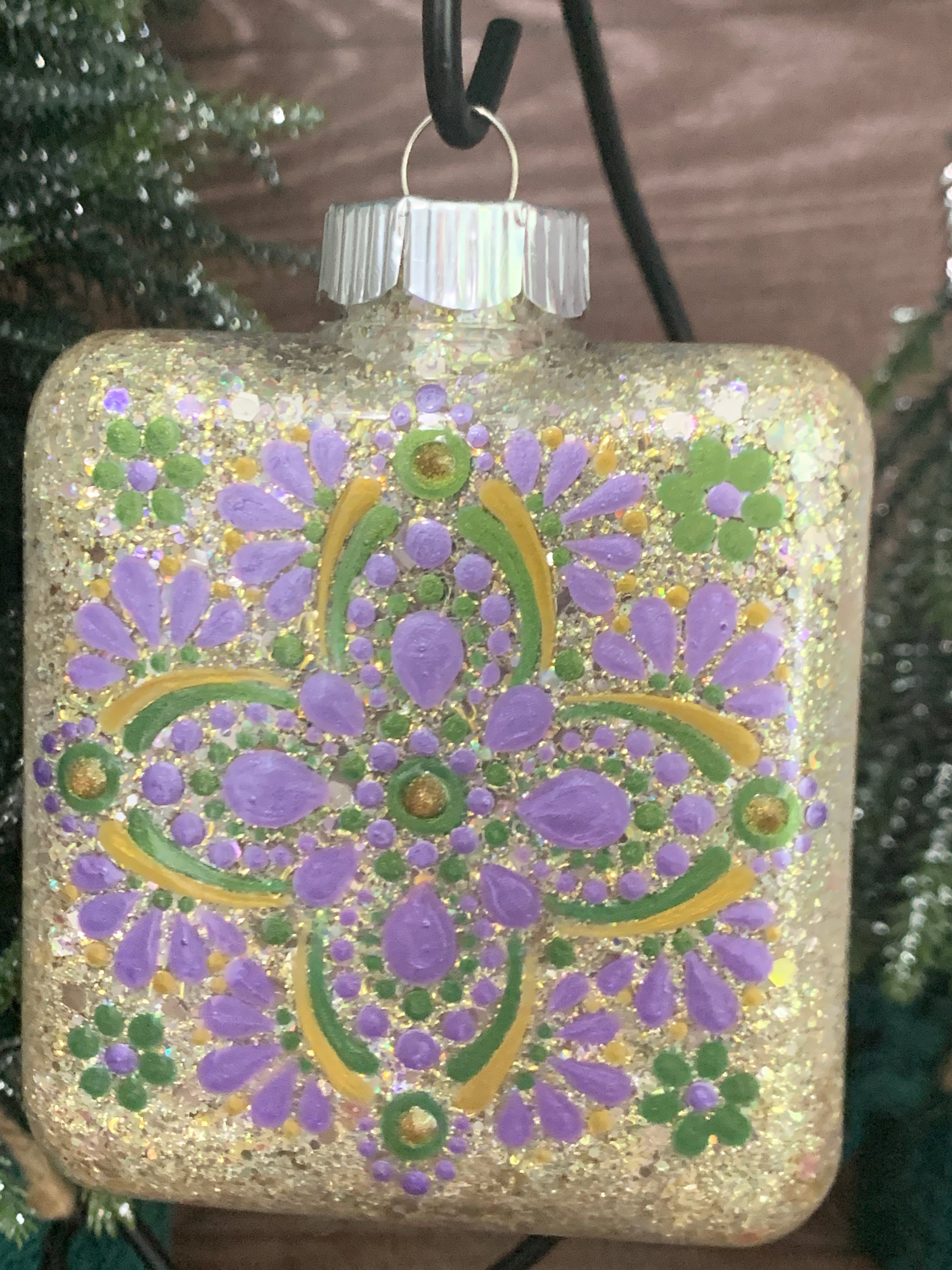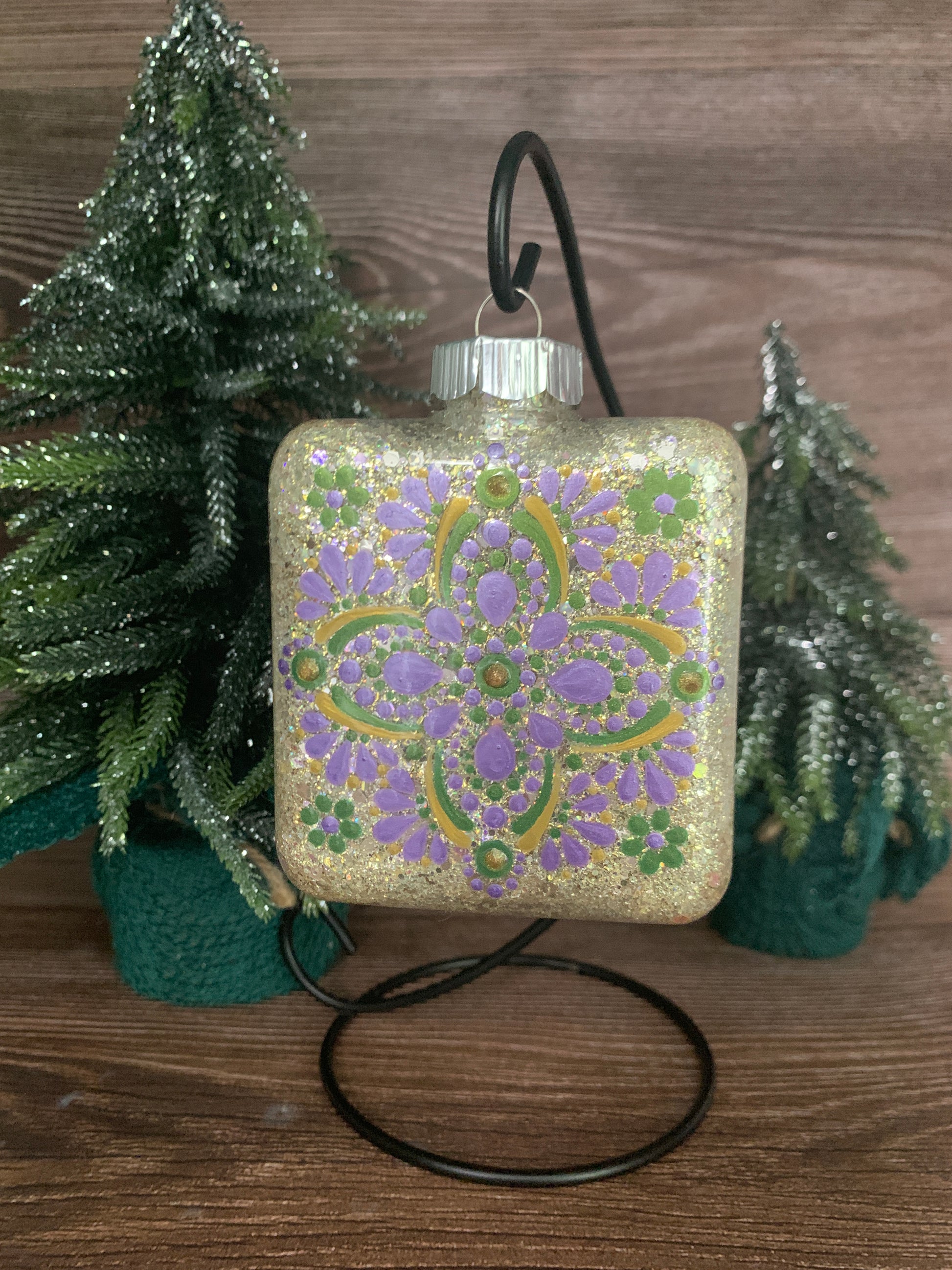 This Square Ornament was treated with a Gold Custom Mix Glitter coating on the inside and Purple, Gold & Green Acrylic Paint on the exterior to create the dotted mandala design.
