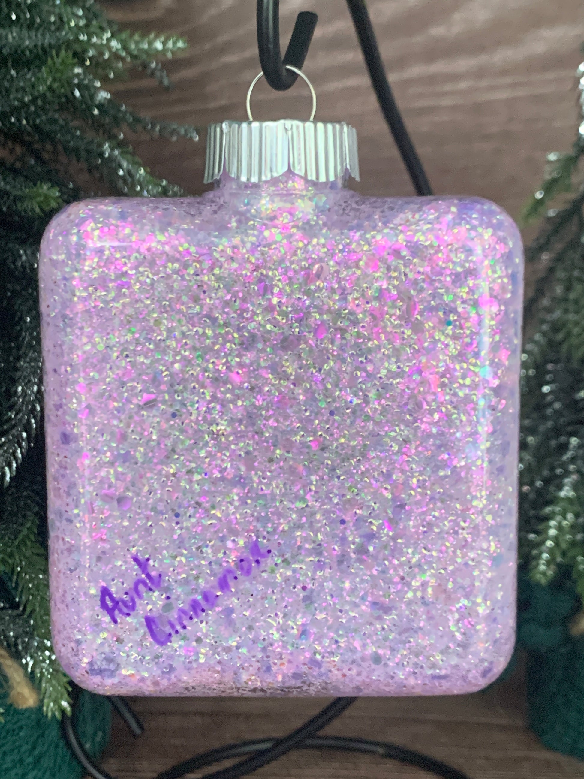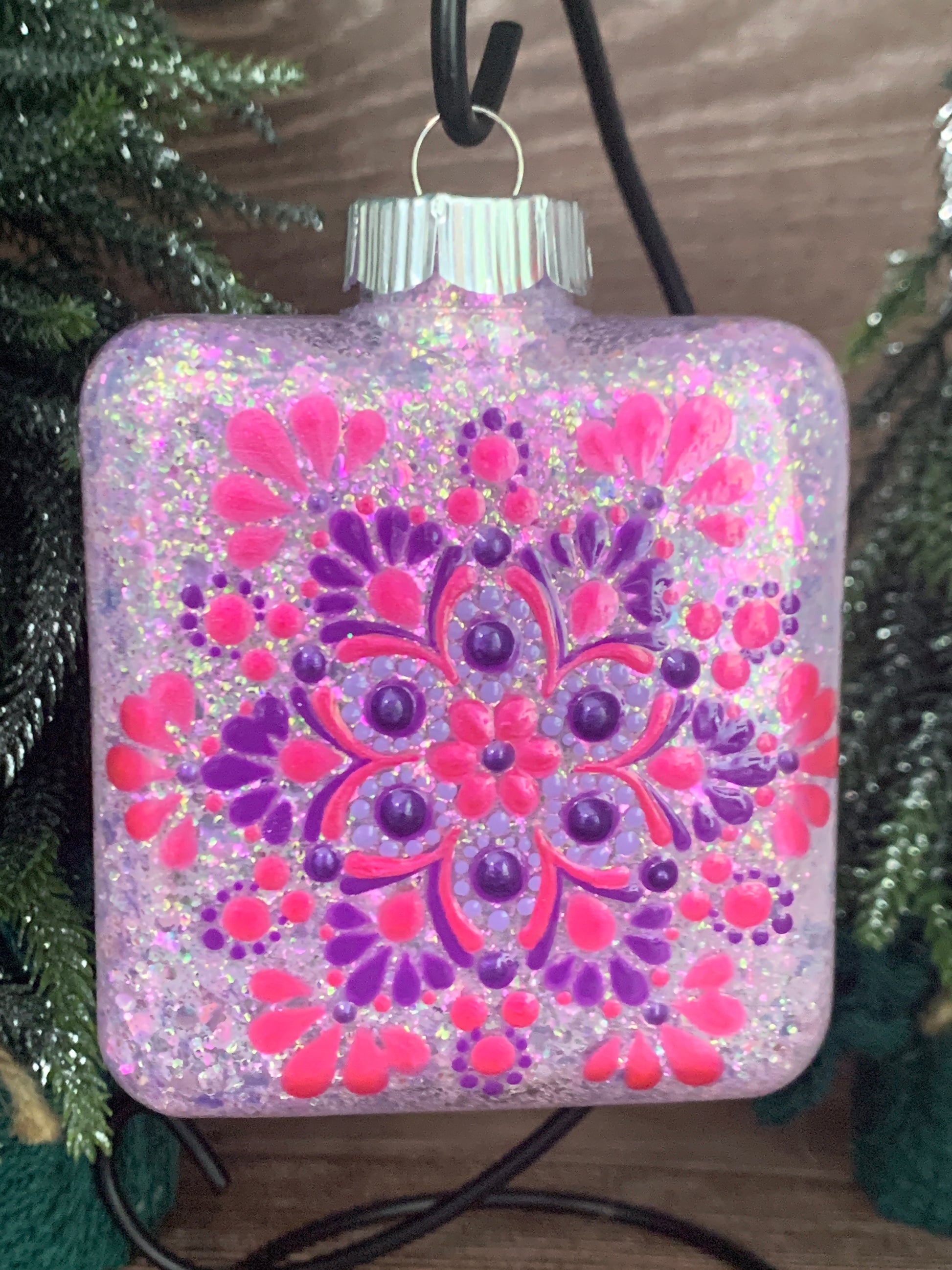 This Square Ornament was treated with a Pale Purple Custom Mix Glitter coating on the inside and Purple, Pink & Pale Purple Acrylic Paint on the exterior to create the dotted mandala design.