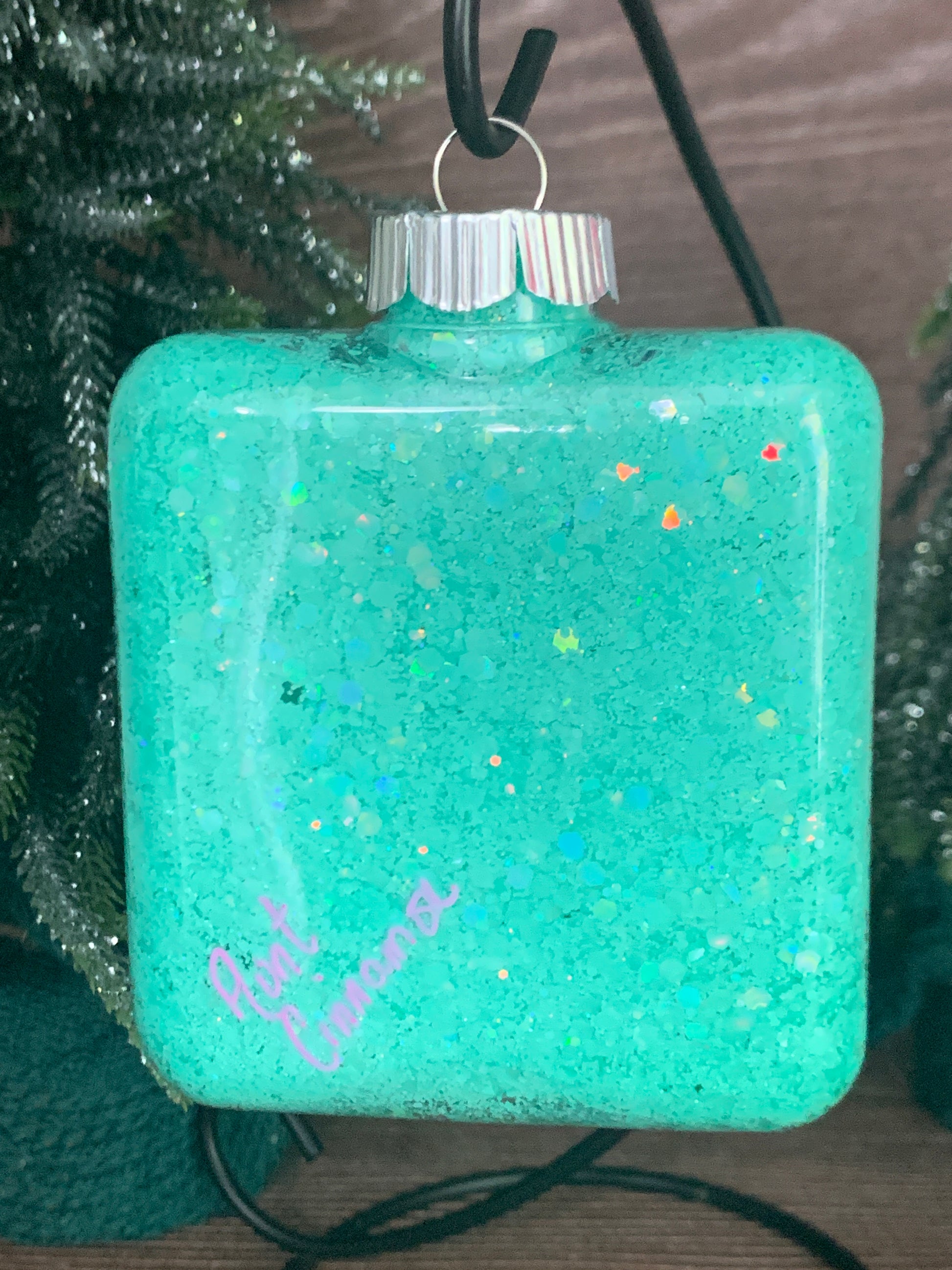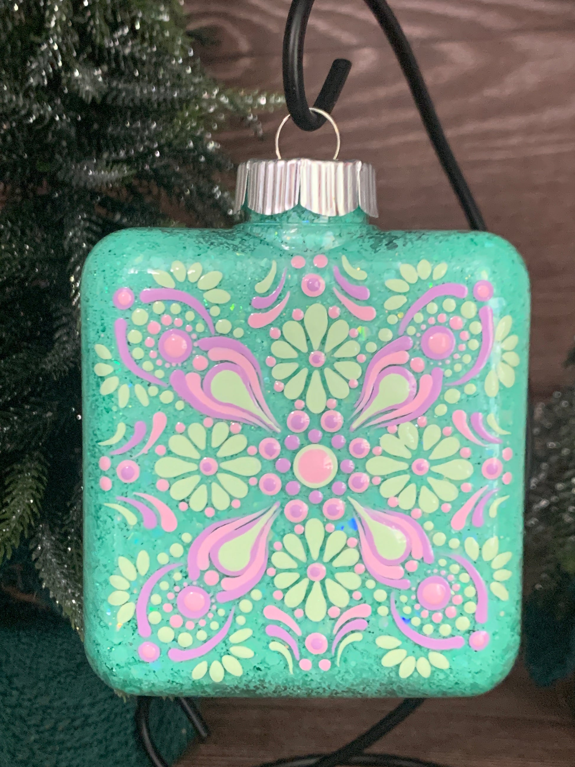 This Square Ornament was treated with Drunk Bunny Glitter coating on the inside and Purple, Pink & Pale Green Acrylic Paint on the exterior to create the dotted mandala design.