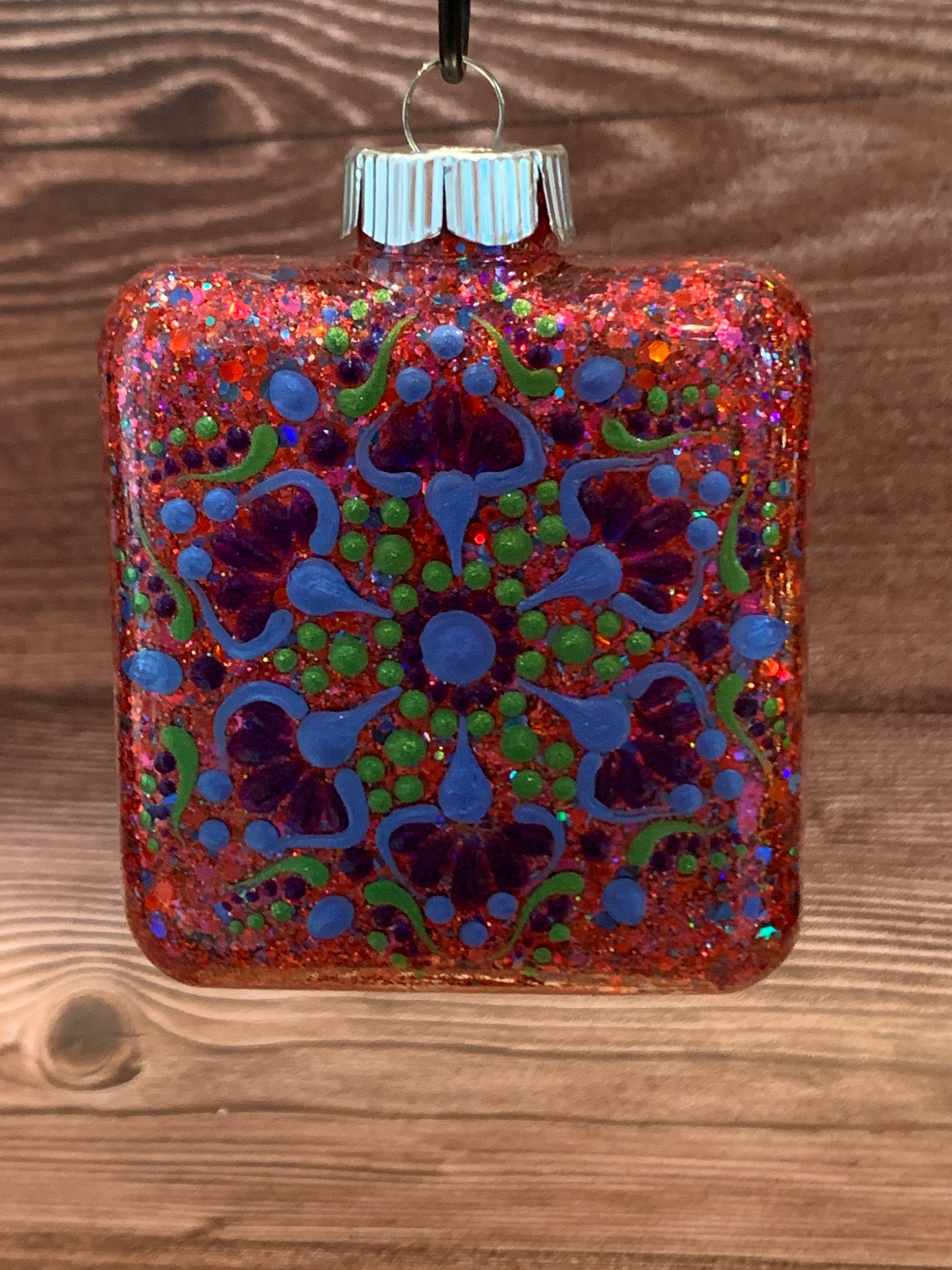 This Square Ornament was treated with Deep Red Glitter coating on the inside and Purple, Blue & Green Acrylic Paint on the exterior to create the dotted mandala design.