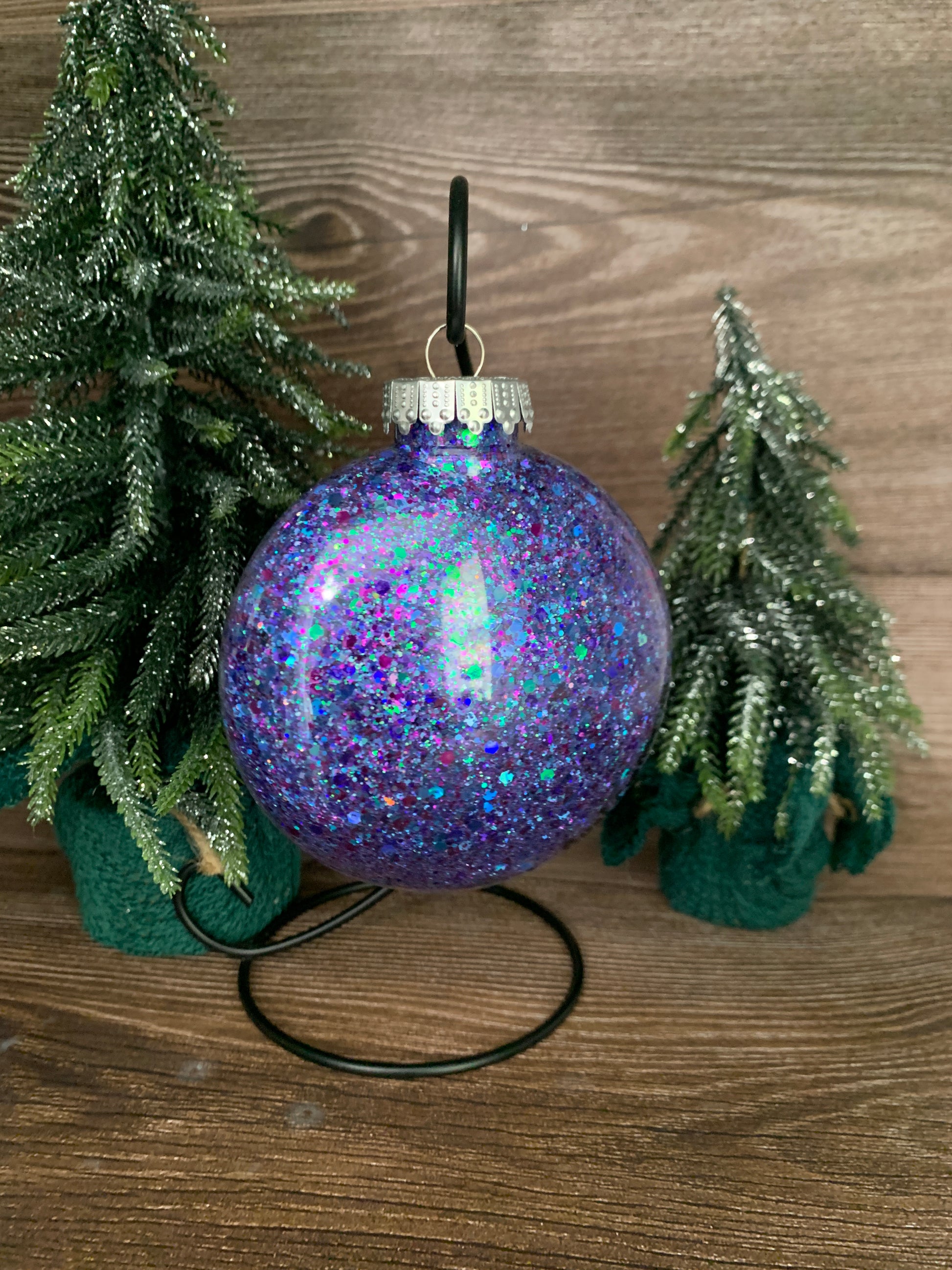 This Disc Ornament was treated with a Chunky mix Dark Purple Glitter coating on the inside and Metallic Turquoise, Purple, Green & Silver Acrylic Paint on the exterior to create the dotted mandala design.