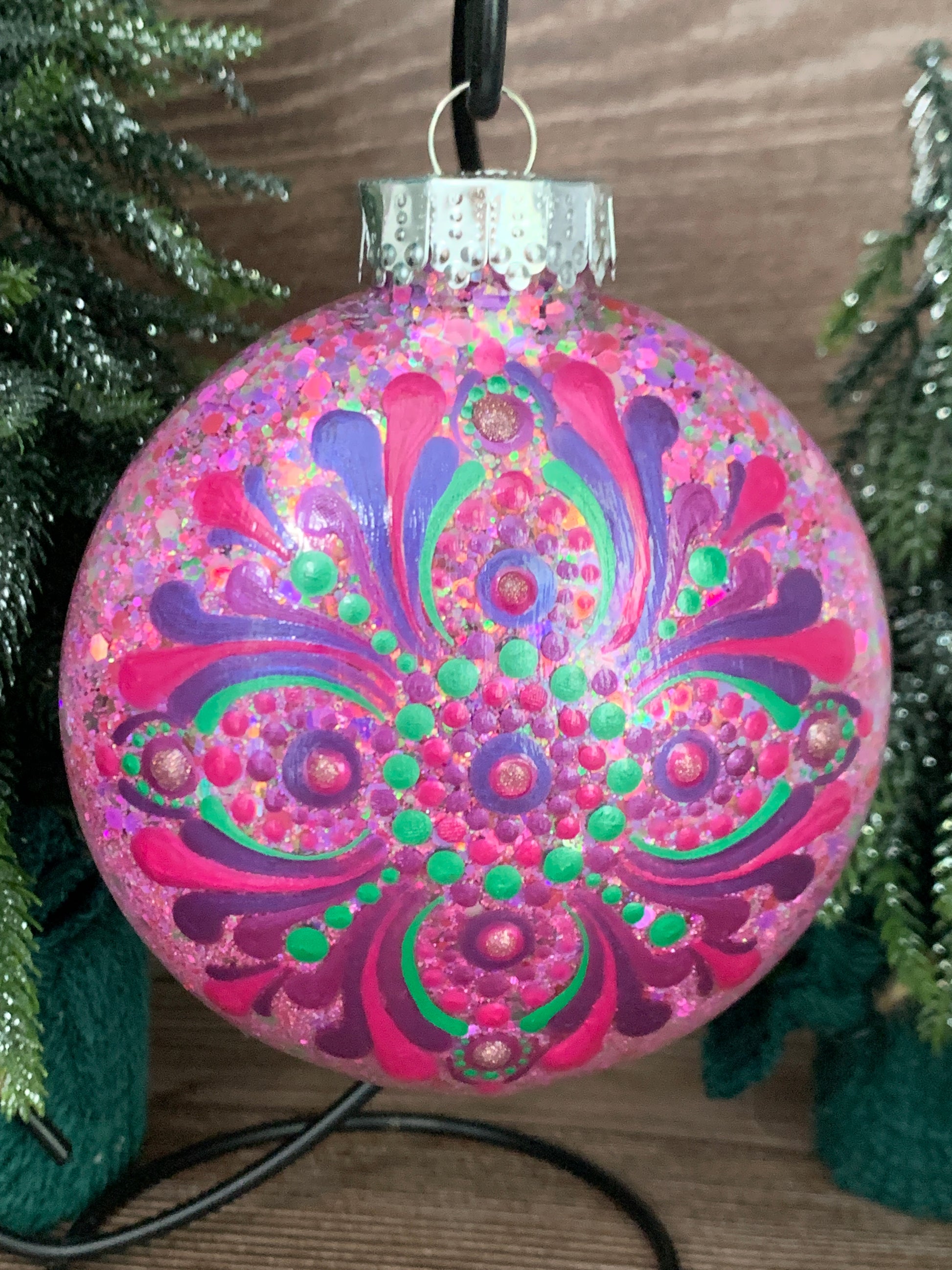 This Disc Ornament was treated with a Chunky mix Dark Pink Holographic Glitter coating on the inside and Metallic Green, Blue & Pink Acrylic Paint on the exterior to create the dotted mandala design.