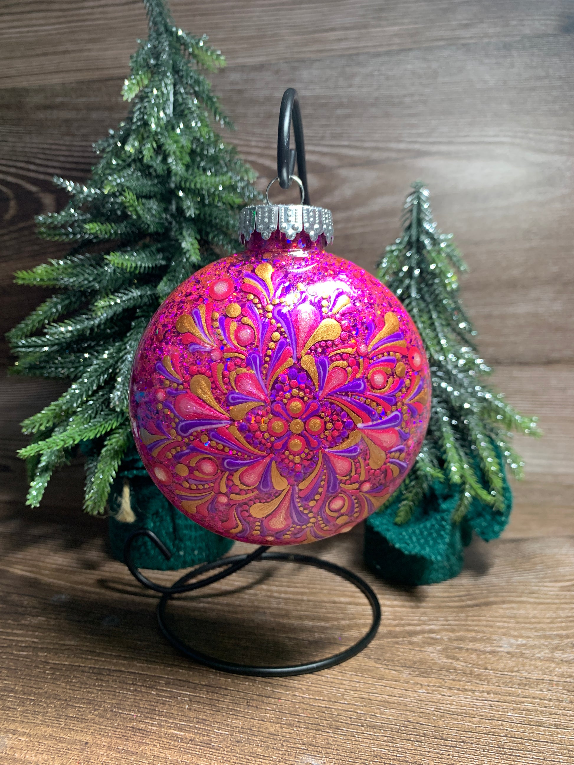 This Disc Ornament was treated with a Fuscia Glitter coating on the inside and Pink, Purple & Gold Glitter Acrylic Paint on the exterior to create the dotted mandala design.