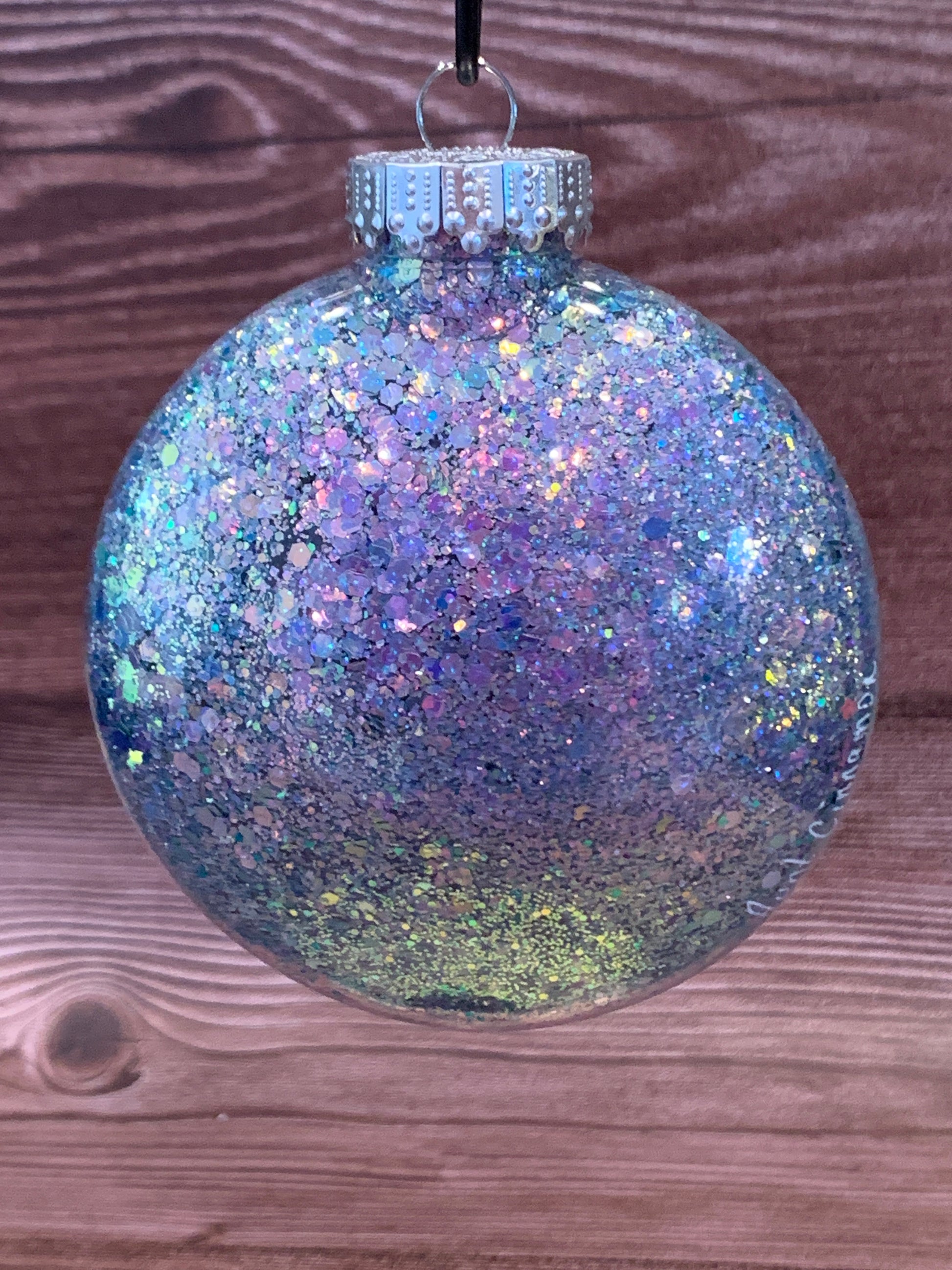 This Disc Ornament was treated with a Purpley/Blue Glitter coating on the inside, Metallic Blue, Purple & Gold Acrylic Paint on the exterior to create the dotted mandala design.