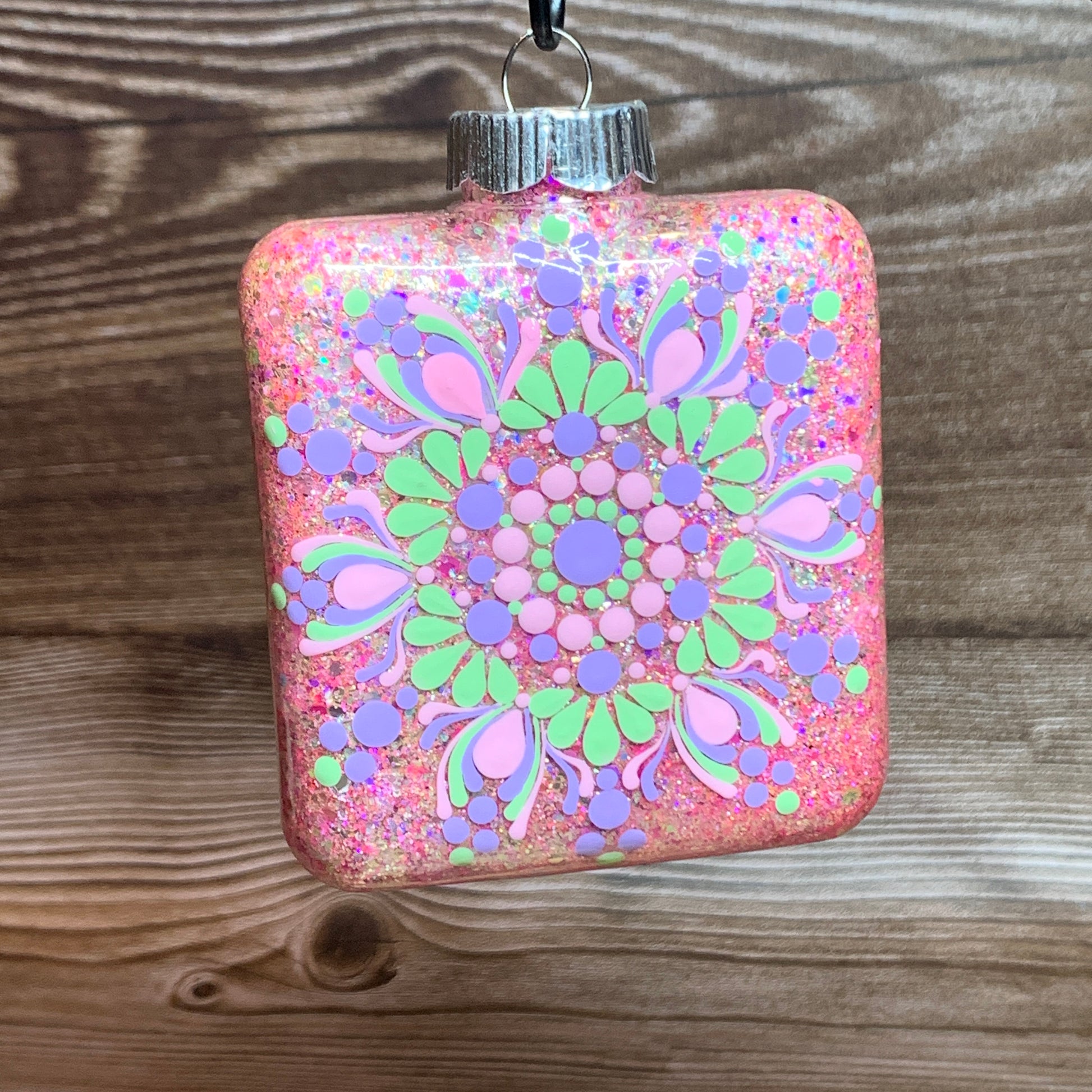 The Square Ornament was treated with a pink Glitter coating on the inside, green, pink & purple Acrylic Paint on the exterior to create the dotted mandala design.