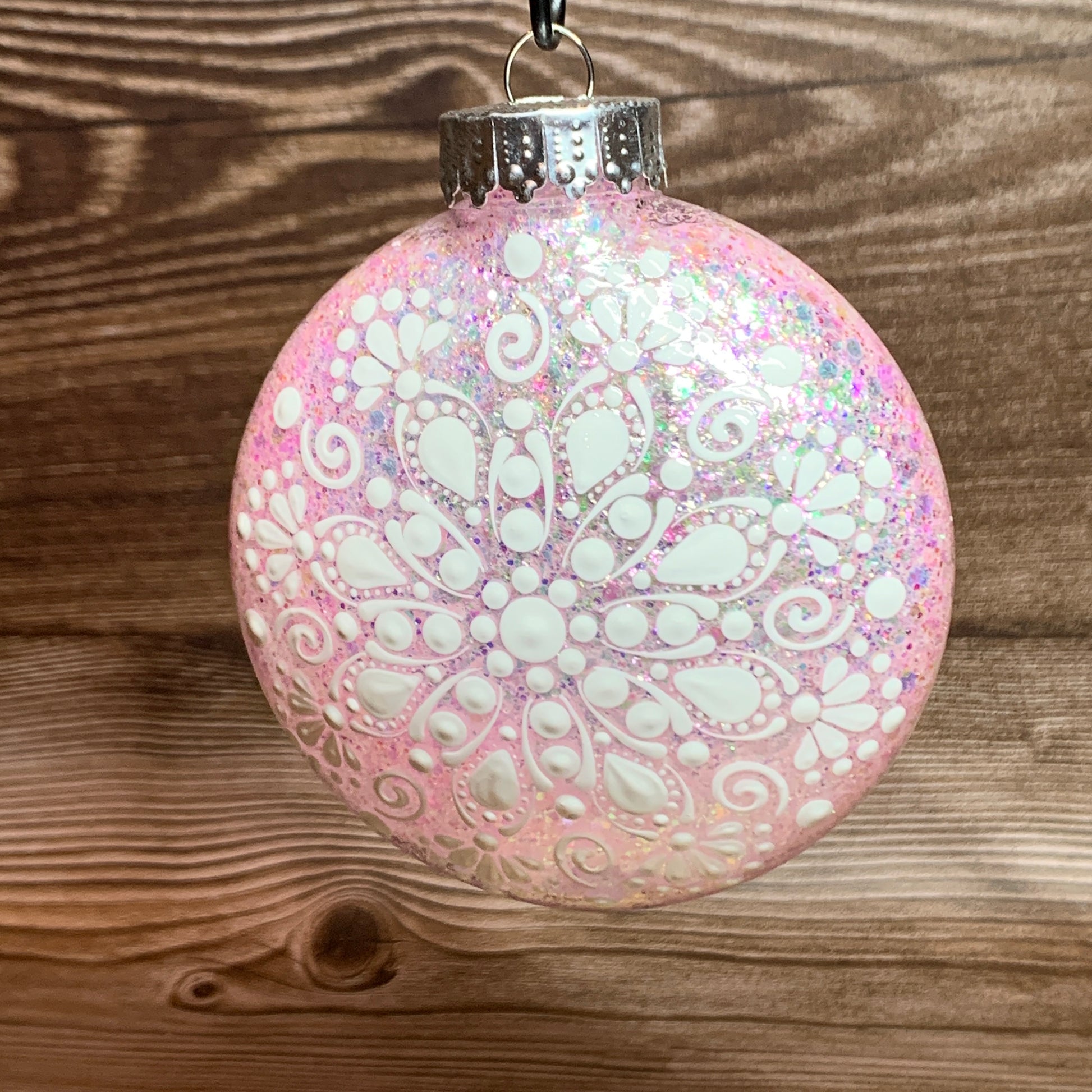 This Disc Ornament was treated with a pale pink Glitter coating on the inside, White Acrylic Paint on the exterior to create the dotted mandala design.