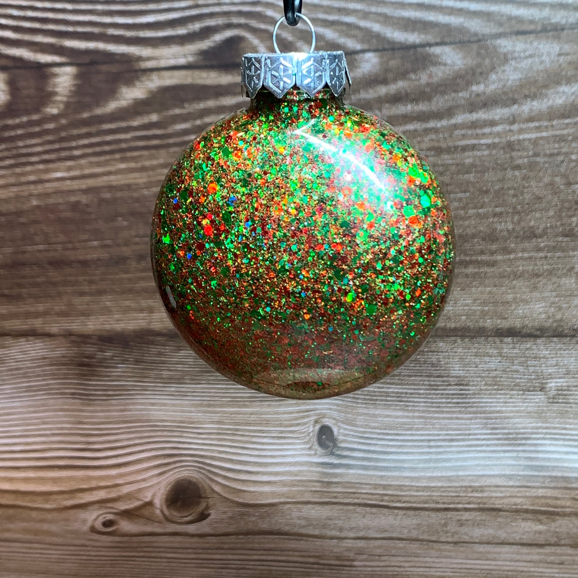 I coated the inside of this Small Disc Ornament with a chunky red & green Glitter mix then painted the ornament with white and red Acrylic Paint