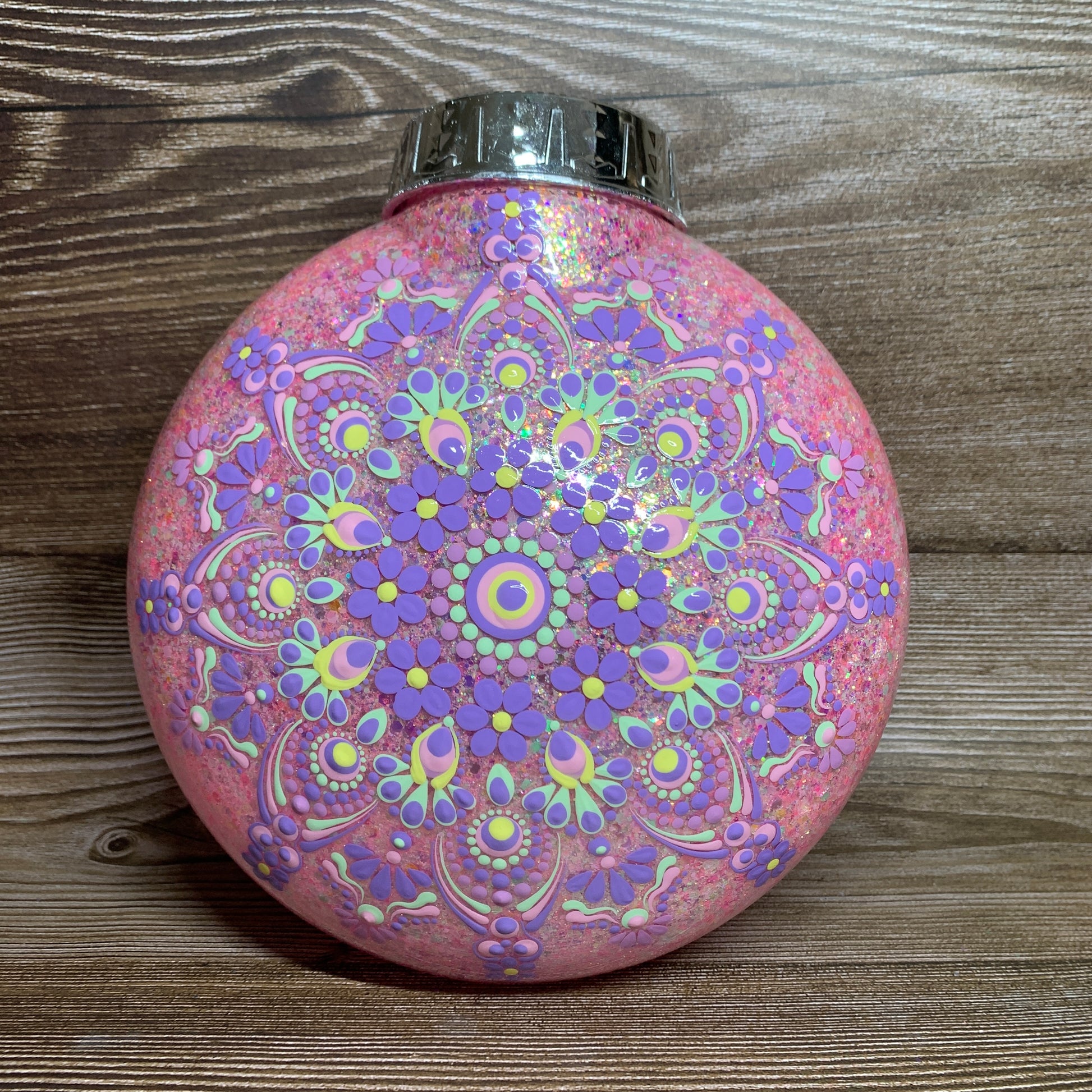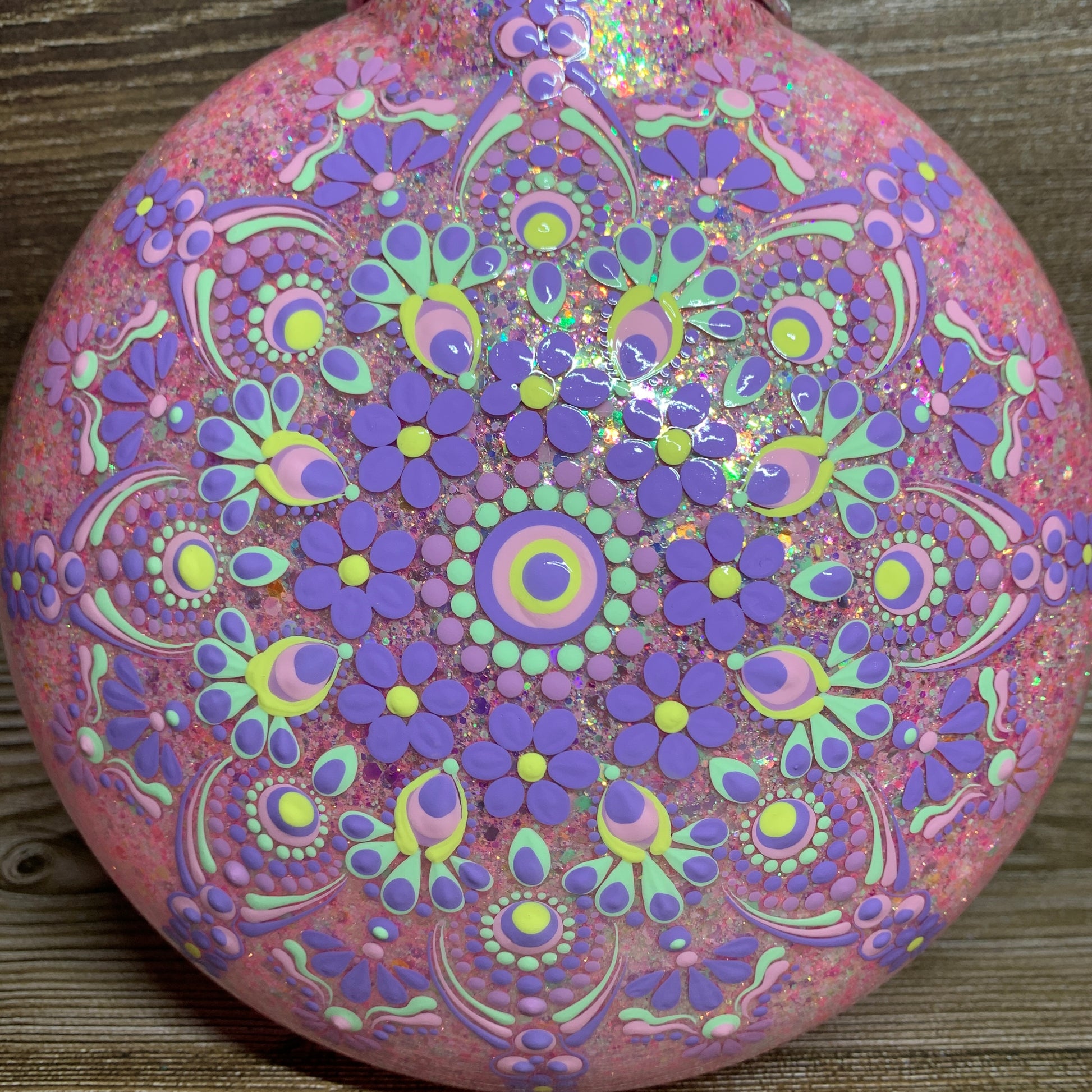 Get ready for some supersized fun with this 9" acrylic dot art masterpiece featuring a glittery pink coating on the inside and a playful mix of pink, yellow, green, and lavender paint - perfect for any candy themed tree. Your tree will be the talk of the town with this quirky and unique addition. (Limit 2 exclamation points. Wink.)