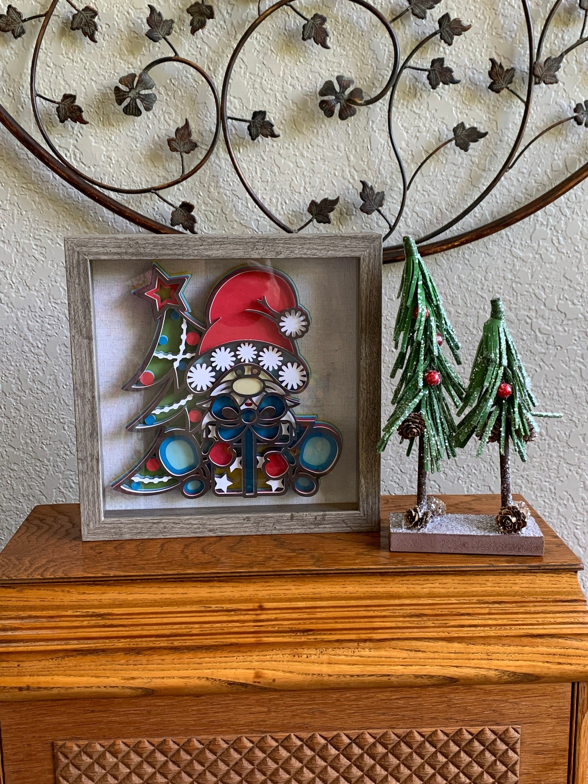 This 10" x 10" grey wood look frame Features an adorable 3 Dimensional Gnome sitting with his Christmas Tree