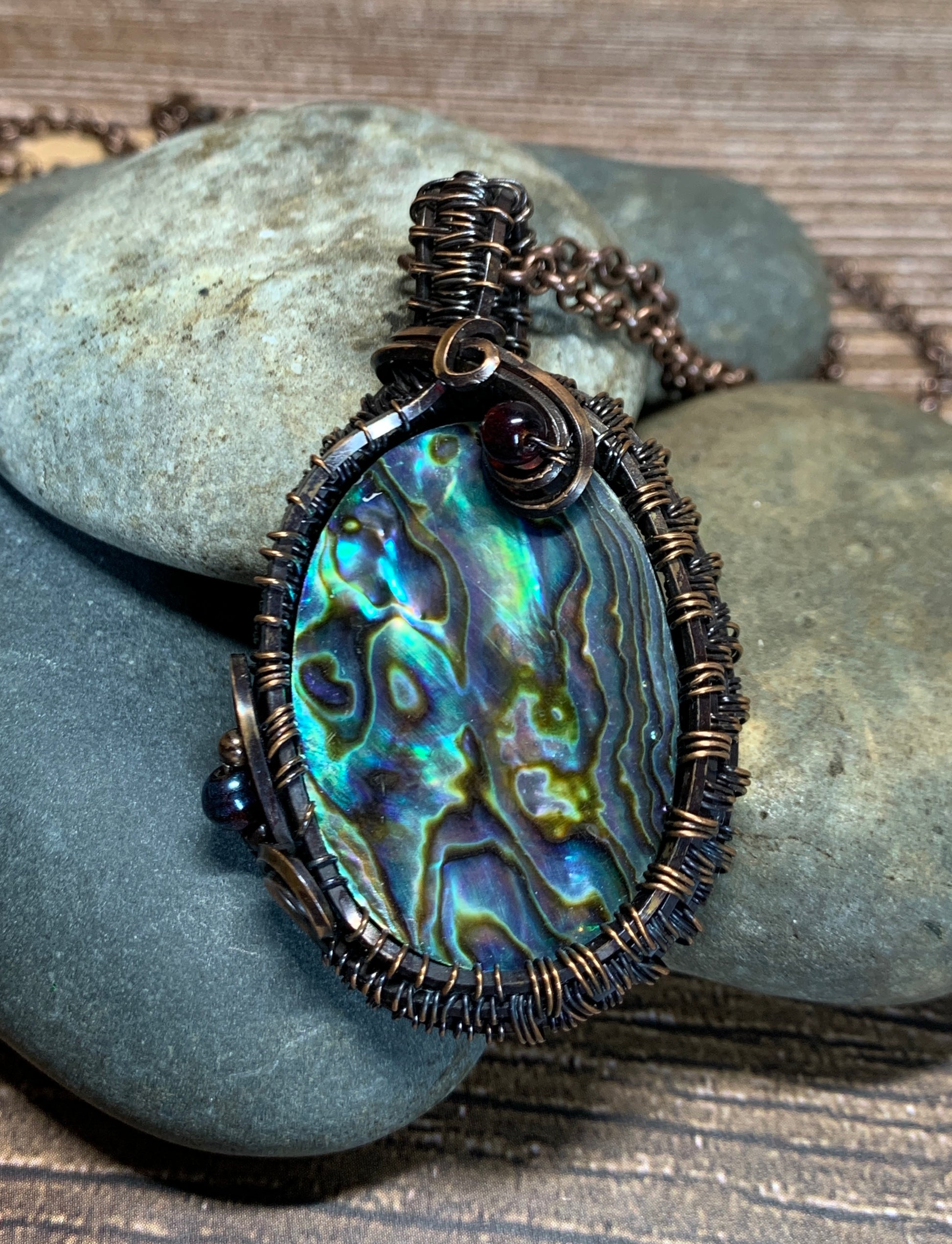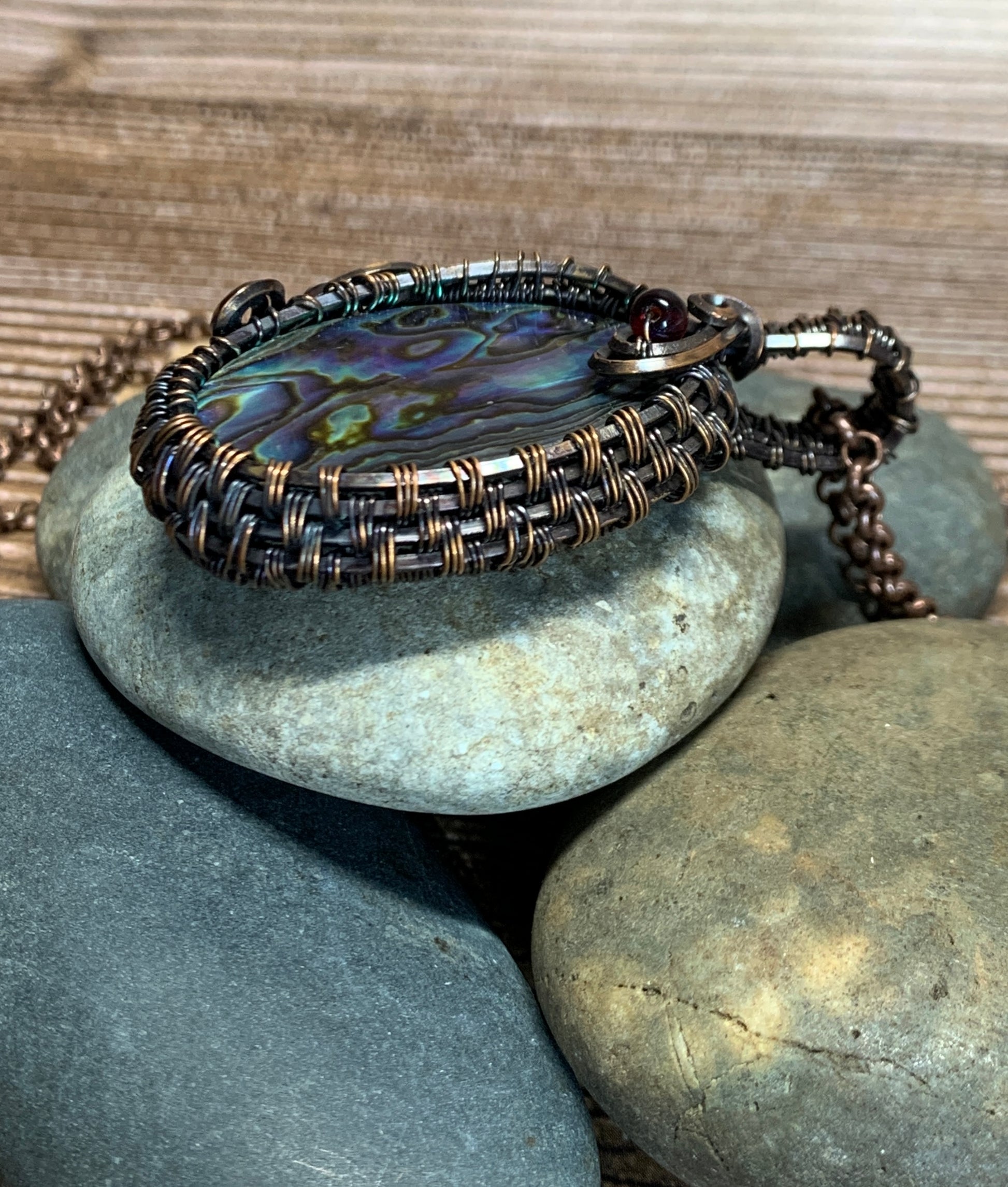 This super flashy abalone has been wrapped in woven copper with two genuine Garnet Accent beads. The pendant has been patina’d to add warmth and depth to the copper and accentuate the beautiful colors of the Stone.
