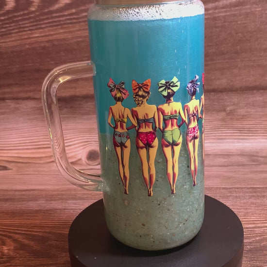 "Quench your thirst with the Beach Sand Tumbler! This unique16 oz tumbler is filled with real sand and blue water, creating a mini beach scene. The UVDTF design features 5 vintage bikini clad girls, making every sip feel like a getaway. Say goodbye to boring tumblers and hello to fun in the sun!"