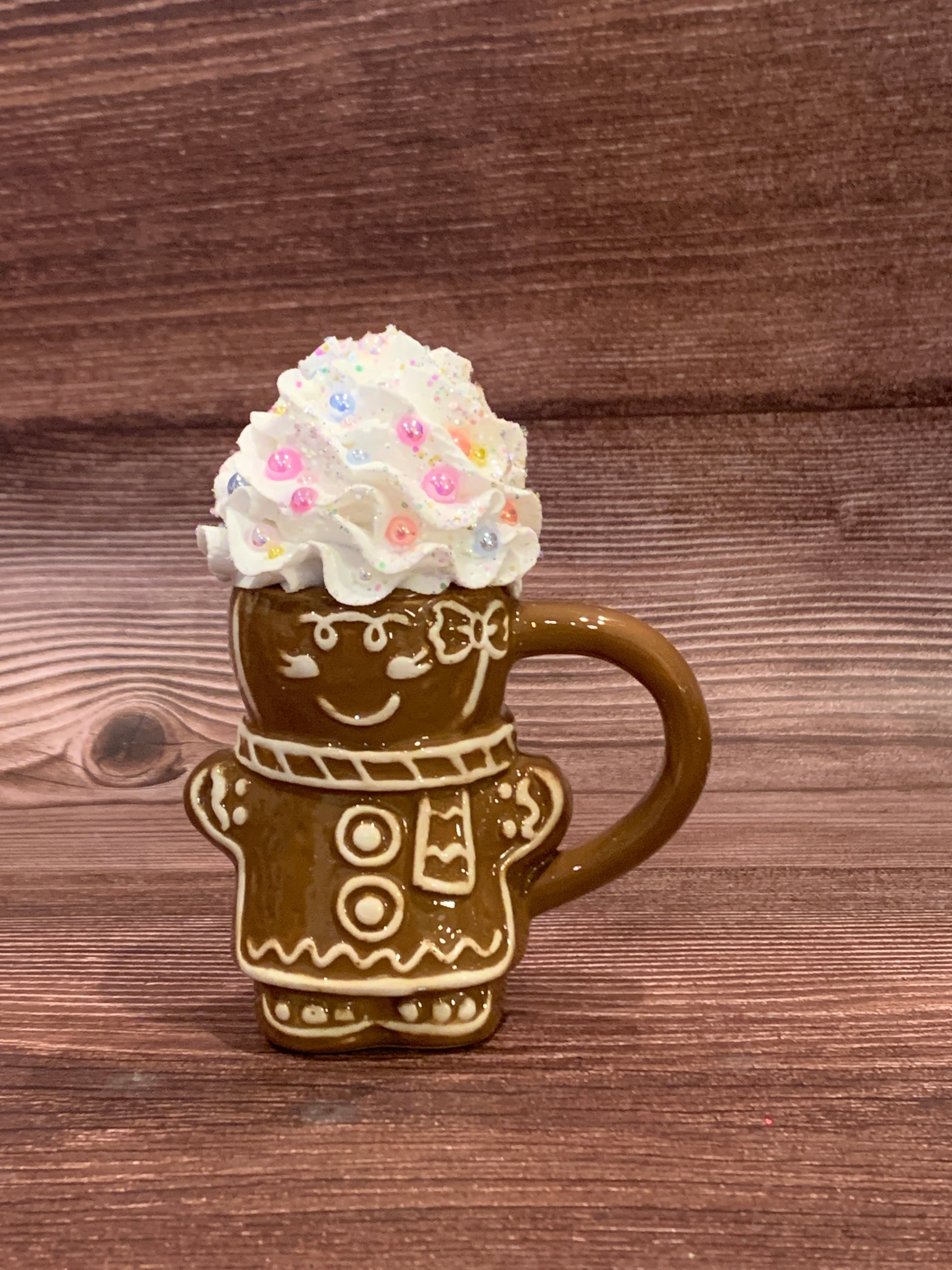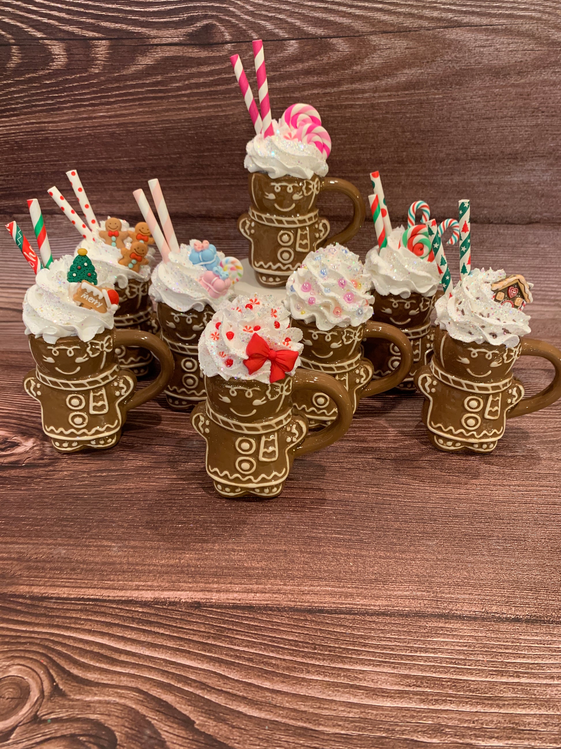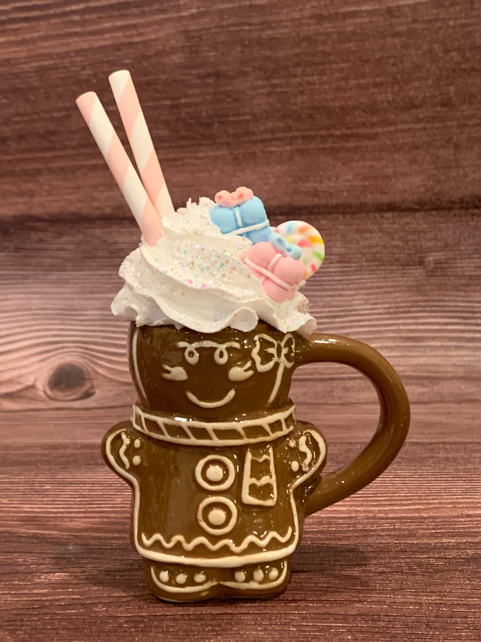 Add a festive touch to your tier tray decor or hot chocolate bar with these quirky ceramic Gingerbread Girl mini mugs. Overflowing with faux whipped cream, sprinkled with glitter, and decorated with polymer clay pieces and paper straws, these mini mugs are sure to bring a smile to your face. (Note: Not for actual use.)