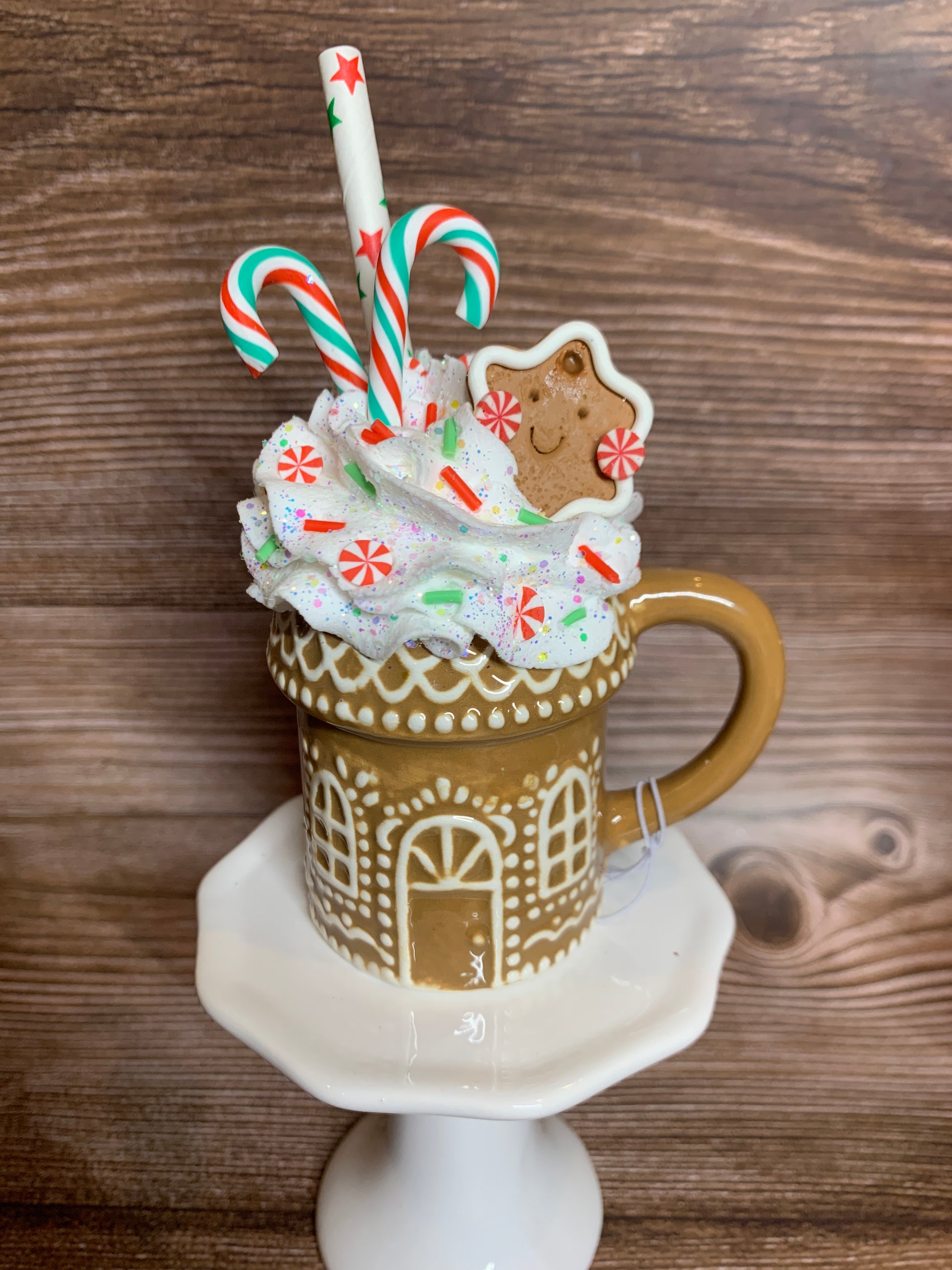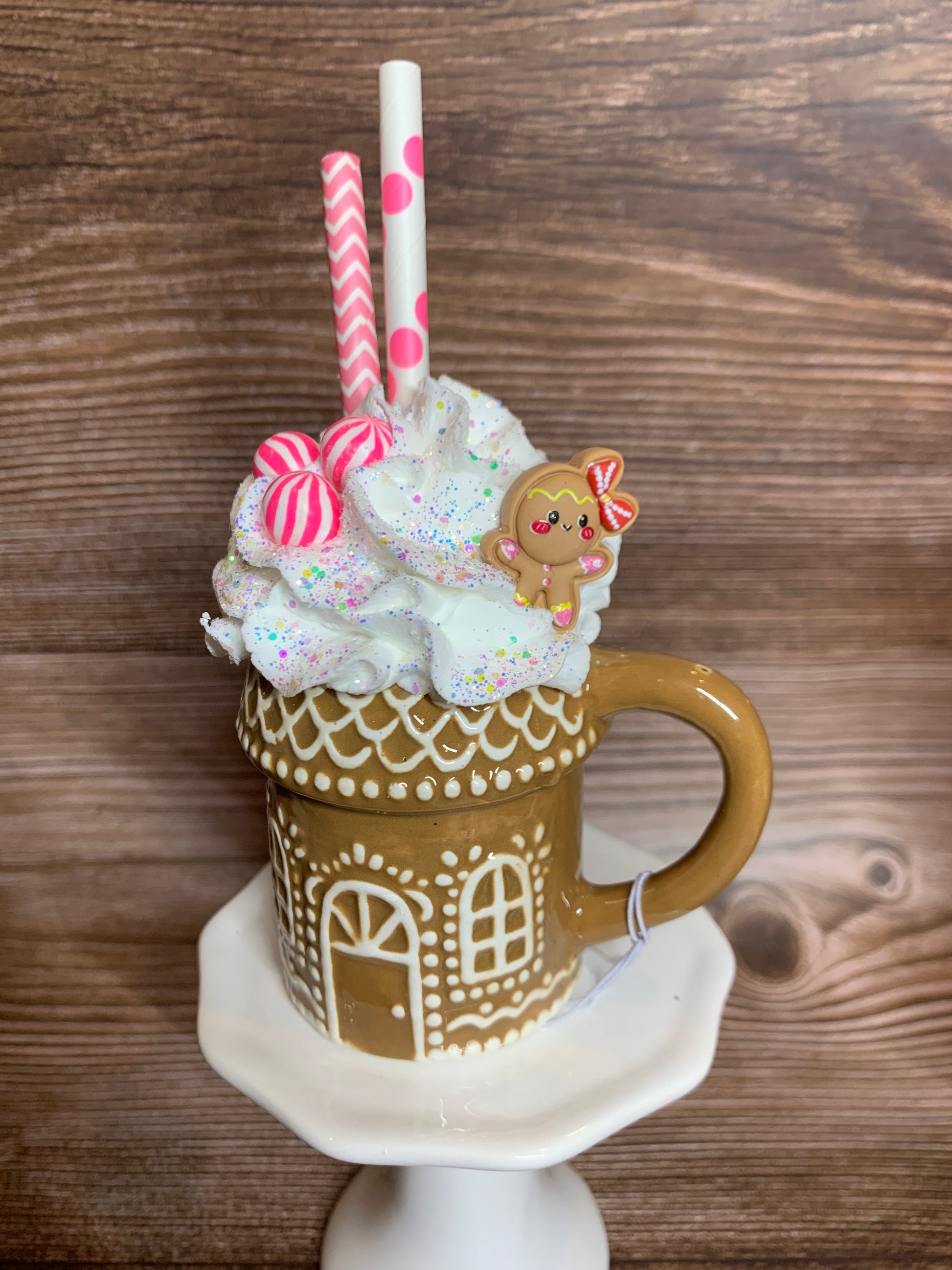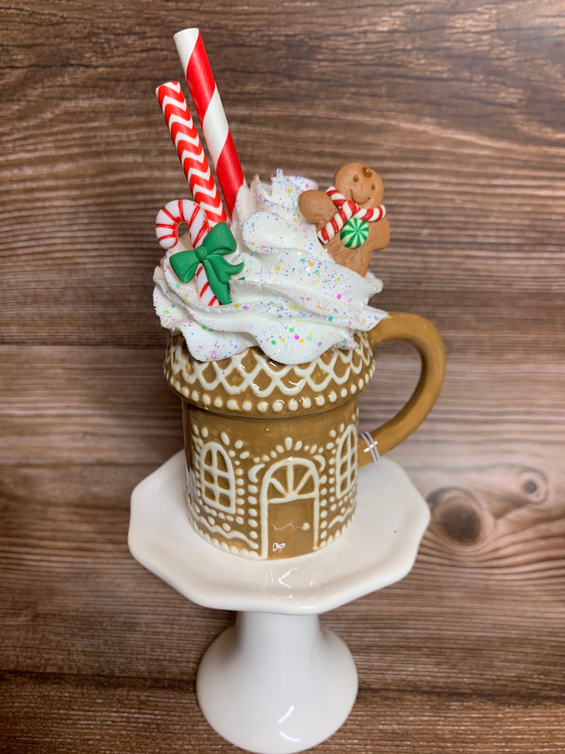 Add a festive touch to your tier tray decor or hot chocolate bar with these quirky ceramic Gingerbread House mini mugs. Overflowing with faux whipped cream, sprinkled with glitter, and decorated with polymer clay pieces and paper straws, these mini mugs are sure to bring a smile to your face. (Note: Not for actual use.)