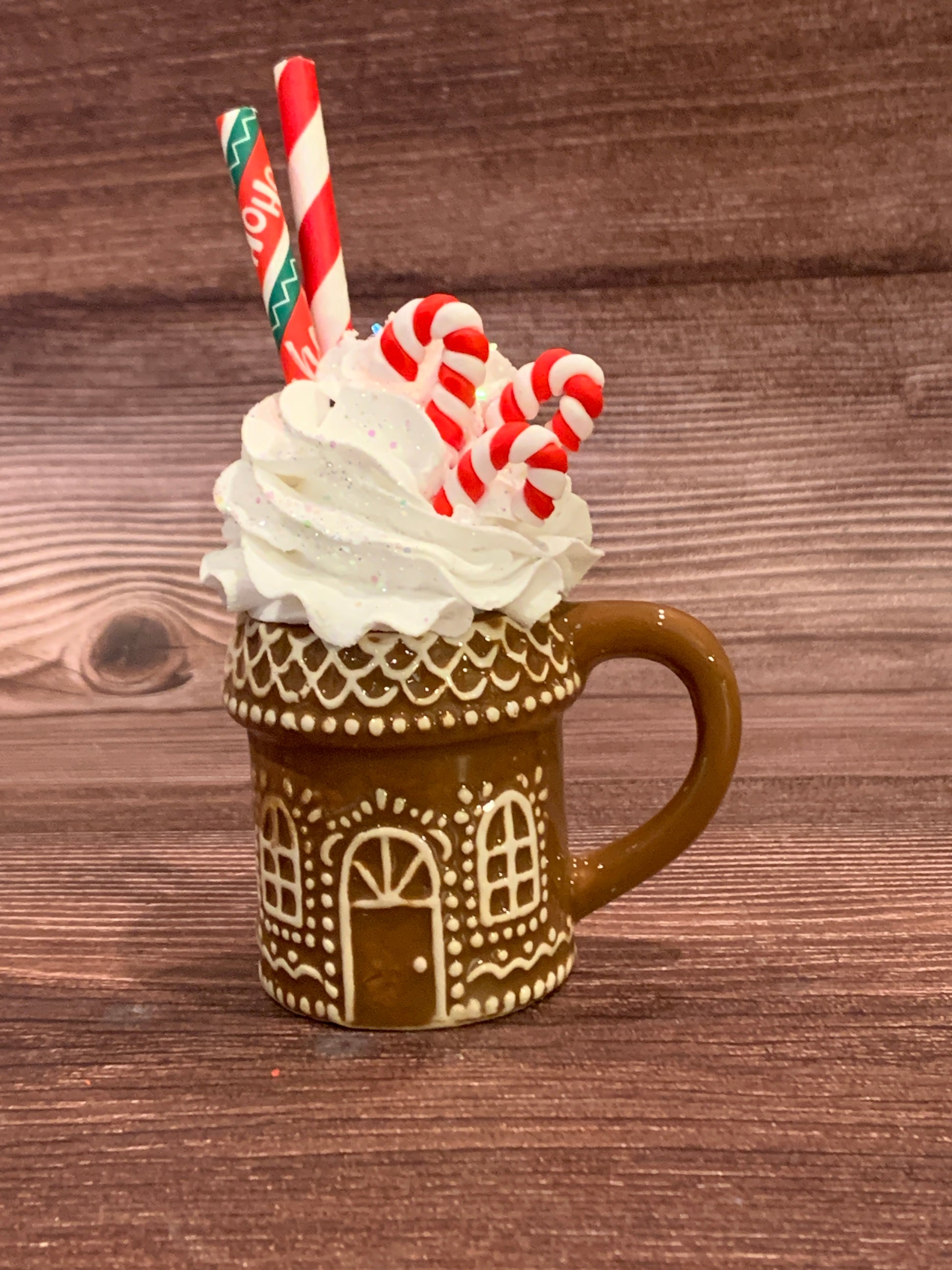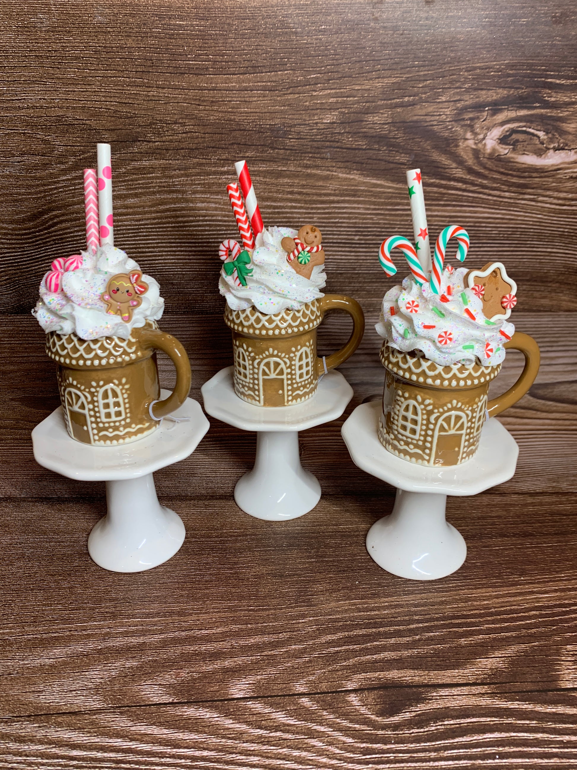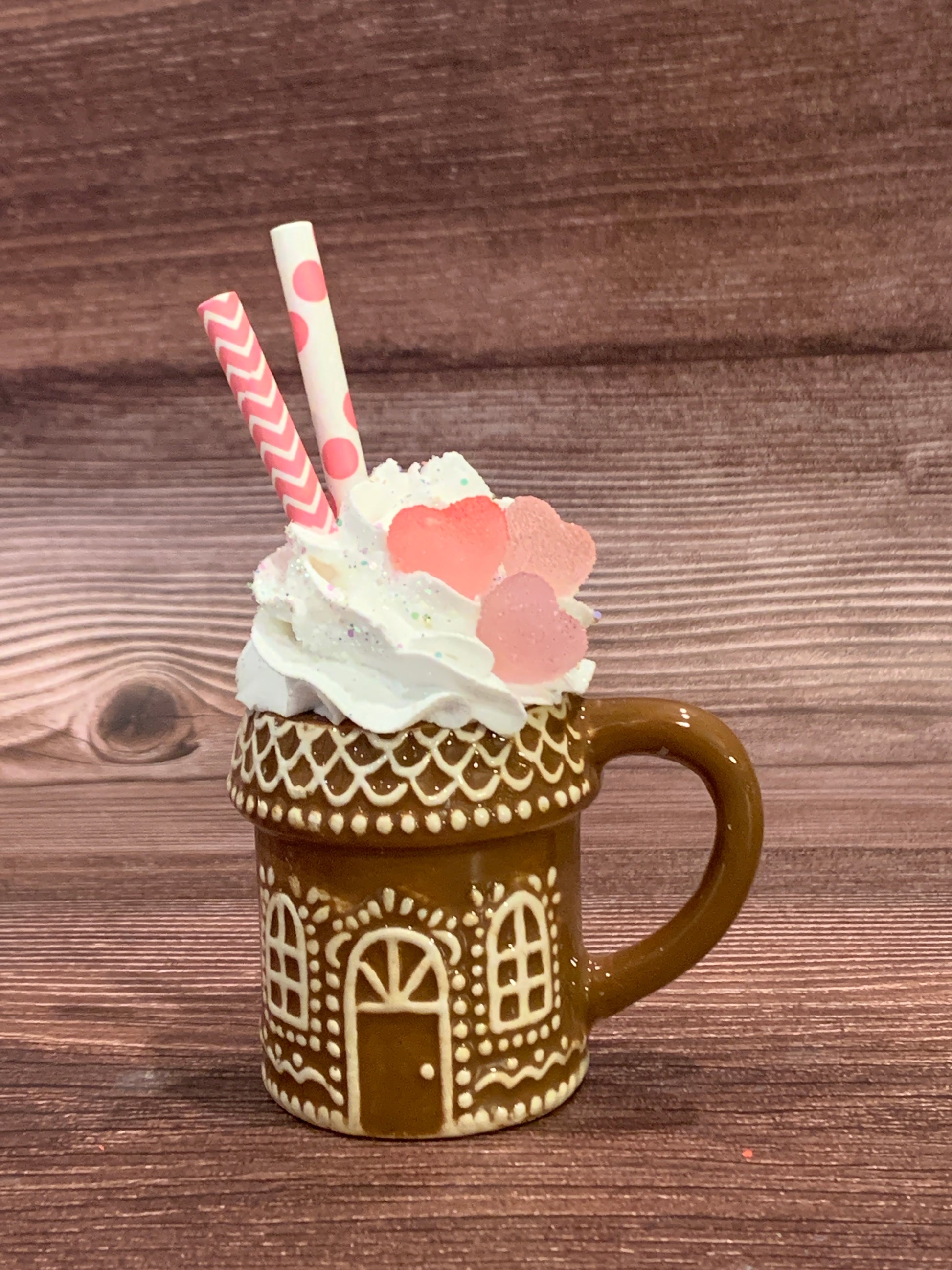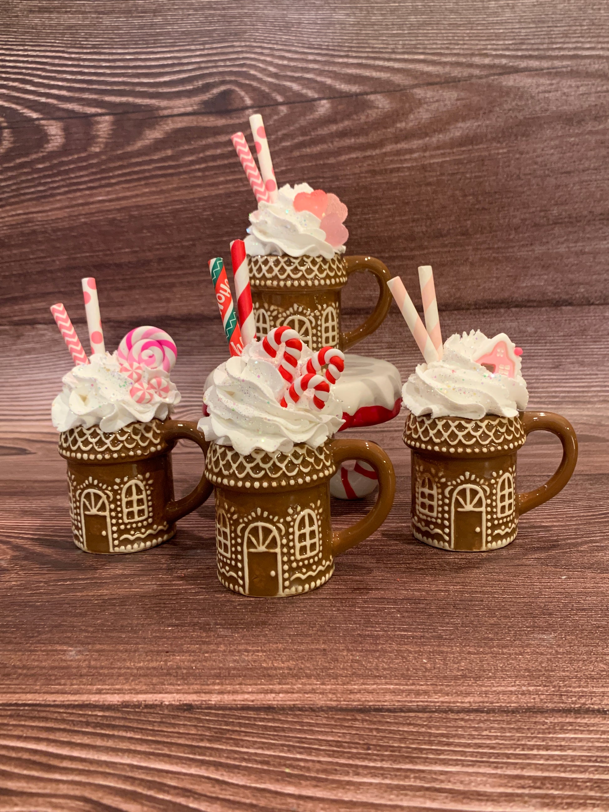 Add a festive touch to your tier tray decor or hot chocolate bar with these quirky ceramic Gingerbread House mini mugs. Overflowing with faux whipped cream, sprinkled with glitter, and decorated with polymer clay pieces and paper straws, these mini mugs are sure to bring a smile to your face. (Note: Not for actual use.)