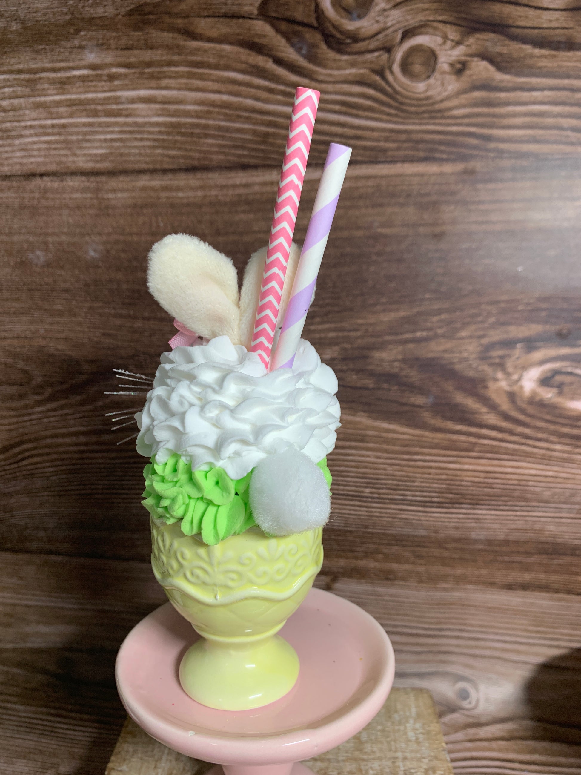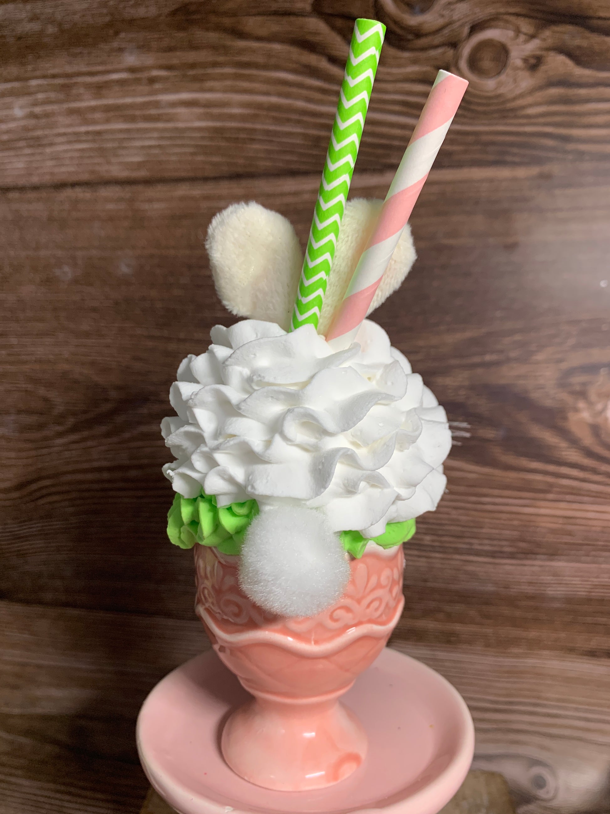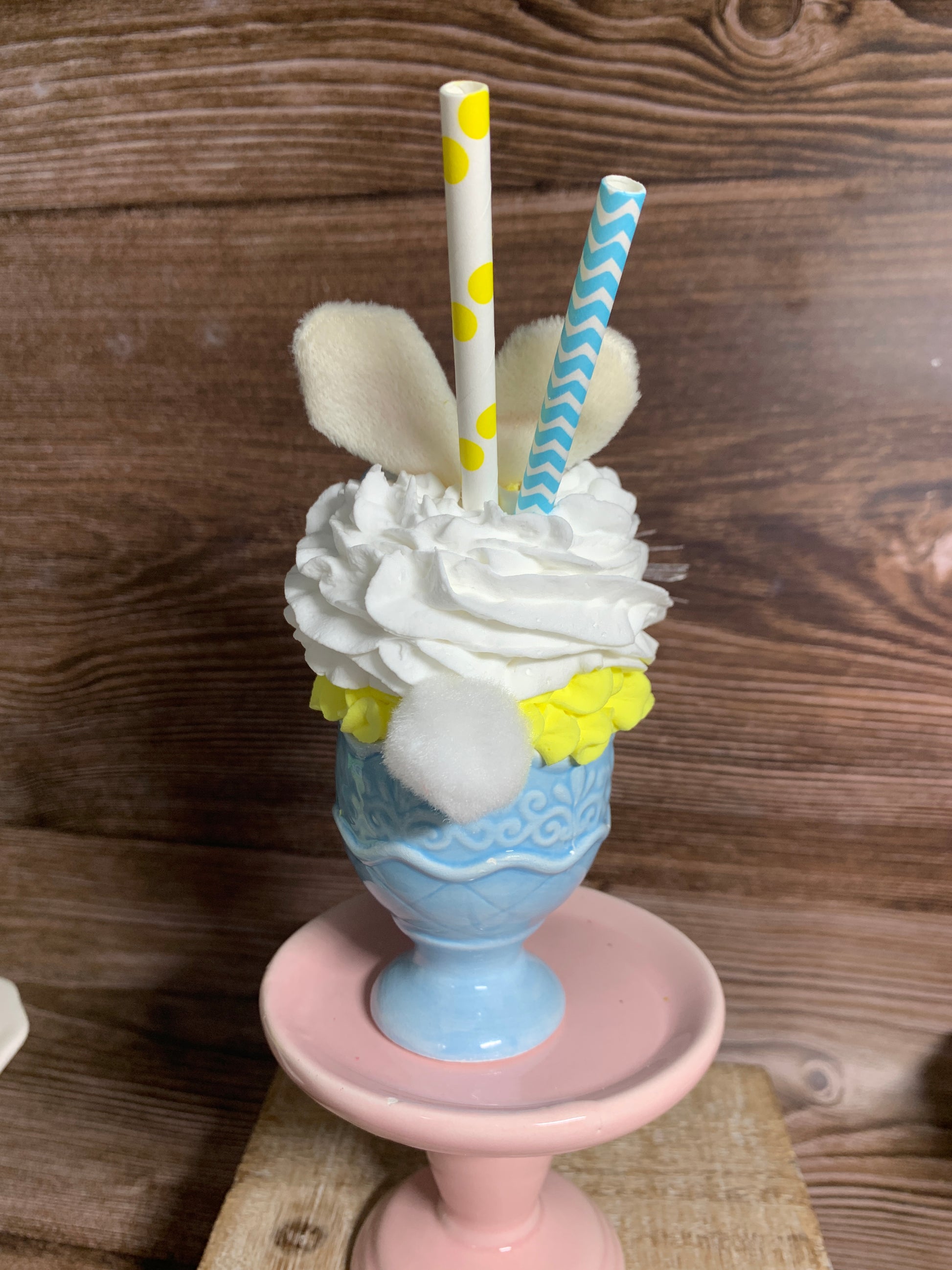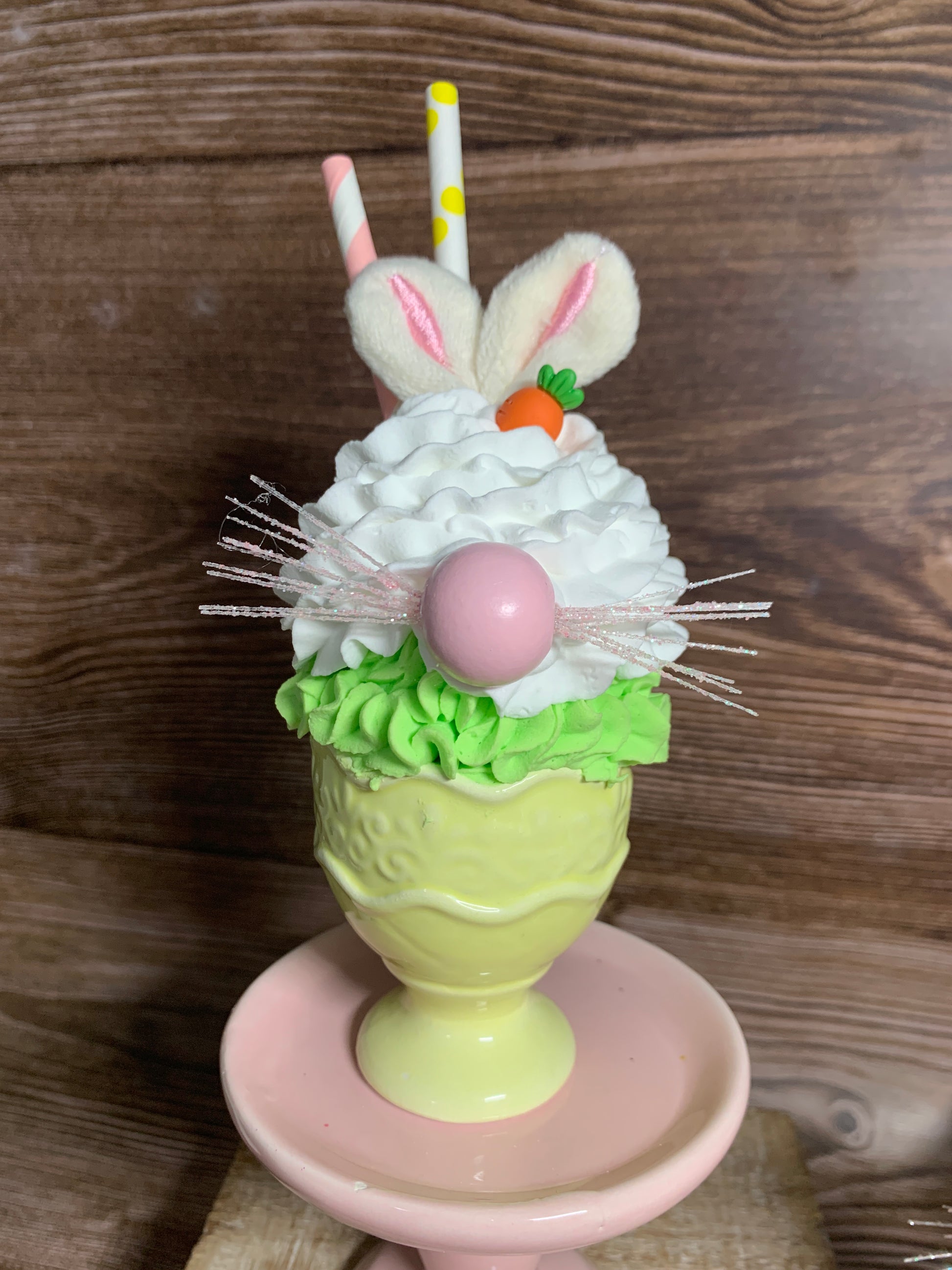 This Easter Bunny Tier Tray Decor is a playful addition to any room! I used a Ceramic Egg Cup and filled it with faux whipped cream, this adorable bunny features cute ears and whiskers. Add a touch of whimsy to your space with this quirky decor.