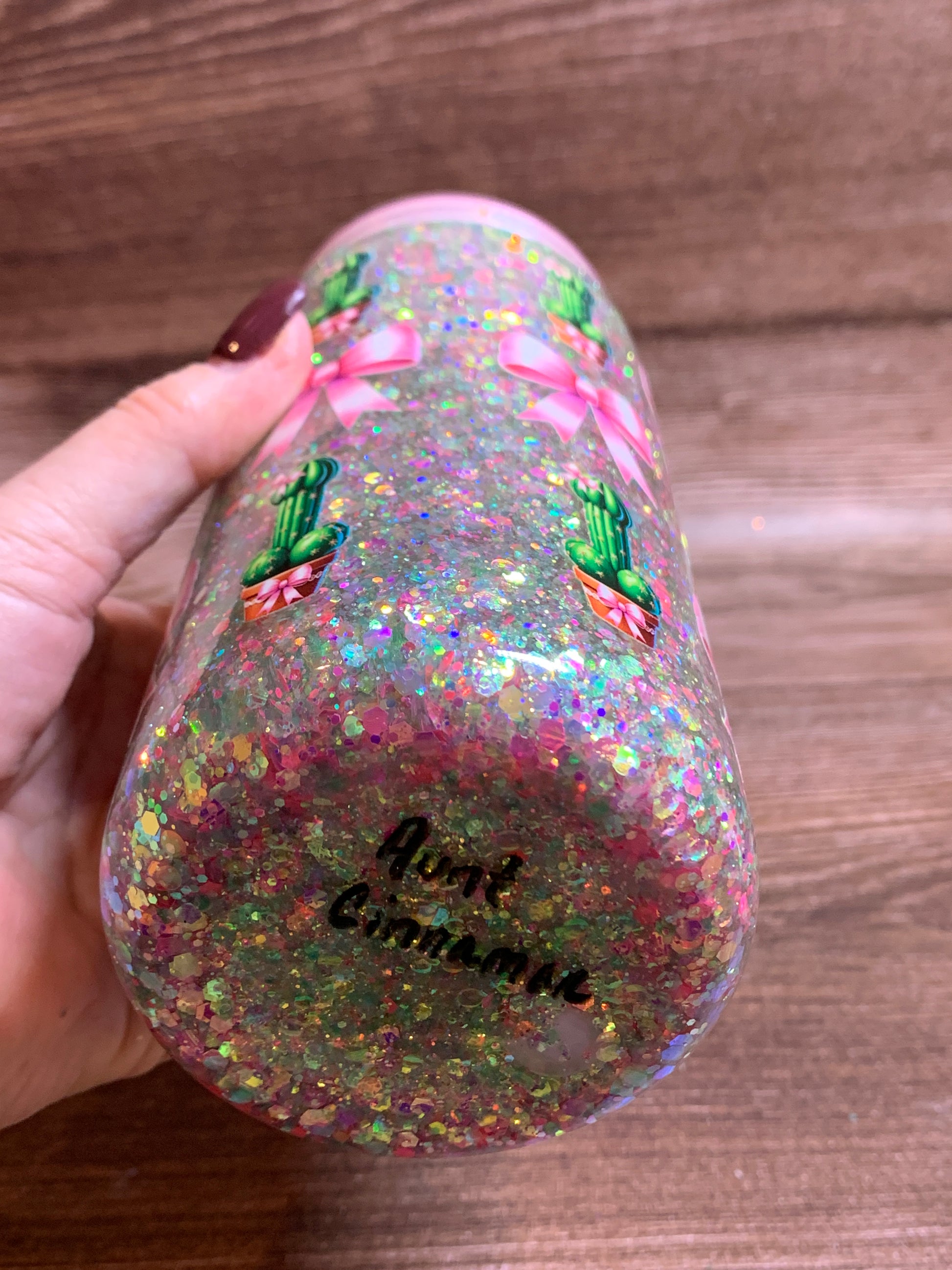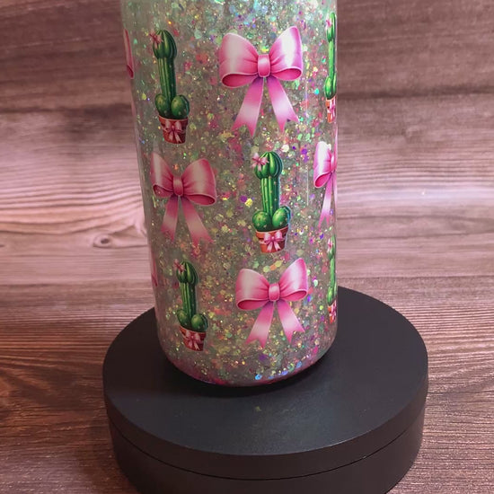 Sip with joy and keep cool with our Cactipeen Snowglobe Tumbler! With a 20 ounce capacity and a unique UVDTF design featuring bows and potted cactipeens, this tumbler is sure to make a statement. Stay hydrated and have some fun (ðŸ¤) with this one-of-a-kind tumbler. 🌵