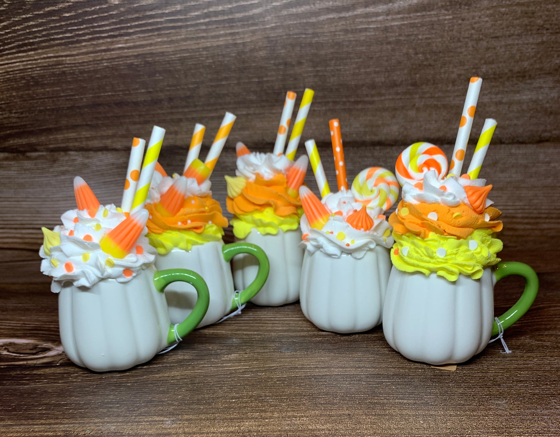 "Get your seasonal fix with our Candy Corn Mini Mug! This mini white ceramic pumpkin mug comes filled with faux whipped cream and candy corn. Perfect for decorating your Halloween or fall tier tray, it's a sweet and playful addition to your home decor."