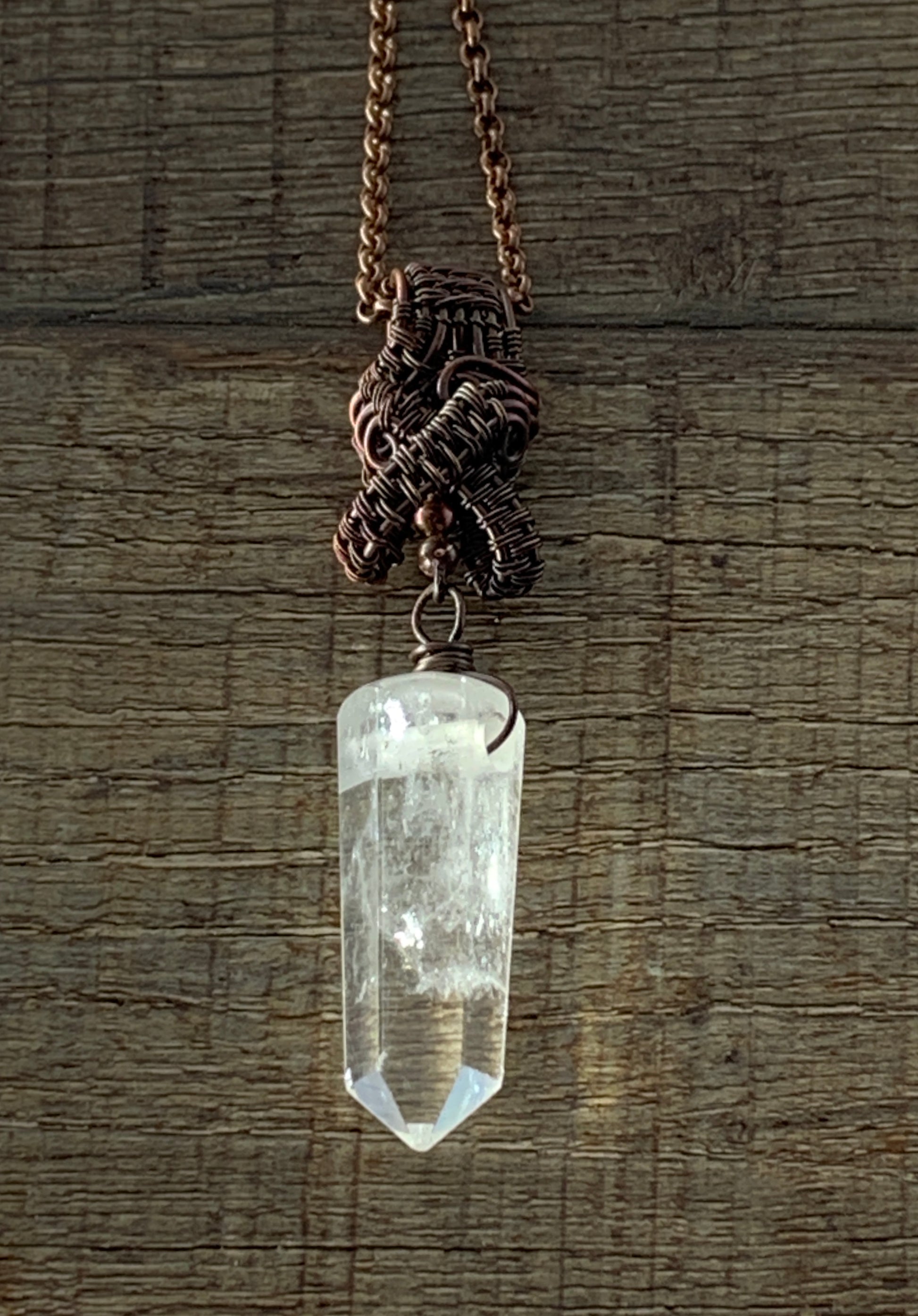 The clear quartz moves freely dangling from the copper weaving that has been patina’d to add warmth and depth to the copper.