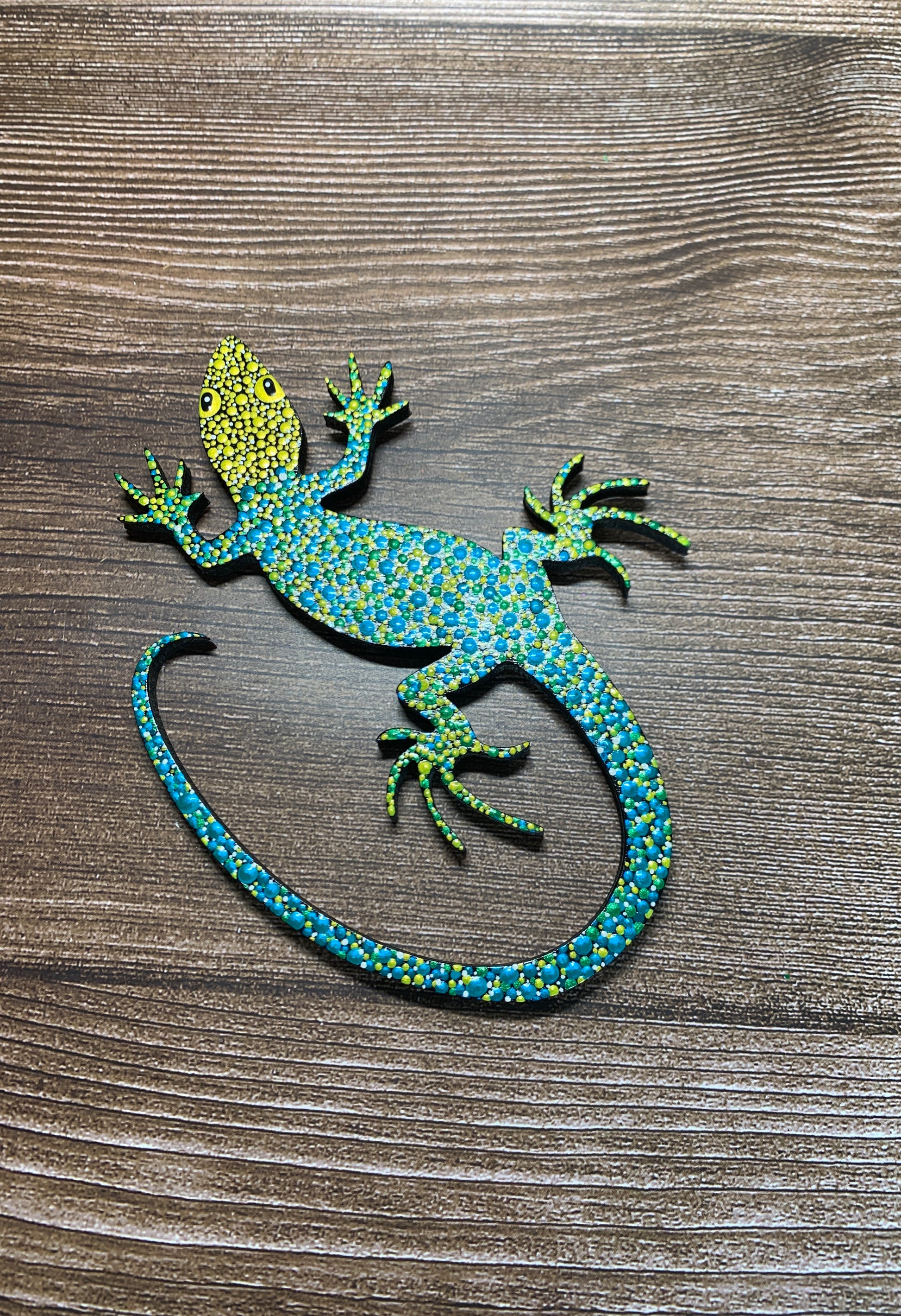 Loosely replicating a collared Lizard this magnet has been cut out of 1/4” Baltic birch plywood that I have painted black.