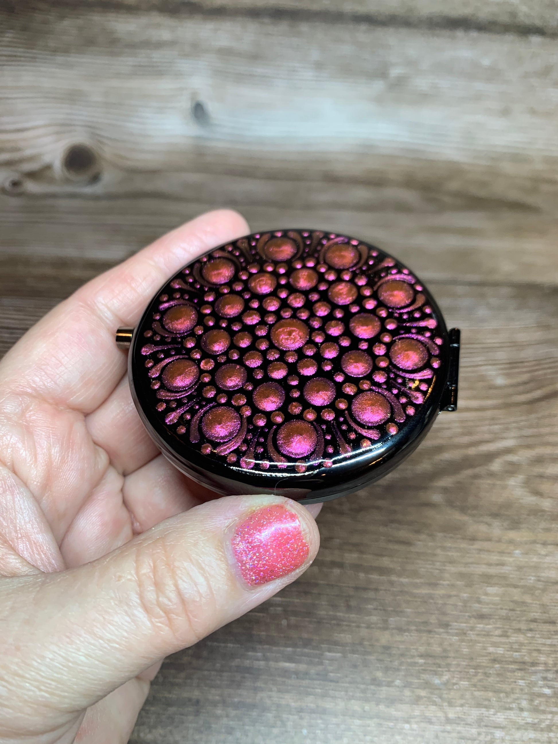 Take a peek at this compact mirror, adorned with a playful dot art design created using color-shifting enamel paint and coated with UV resin for added protection. Don't miss its handy 2 1/2" x 2 1/2" x 1/2" size!