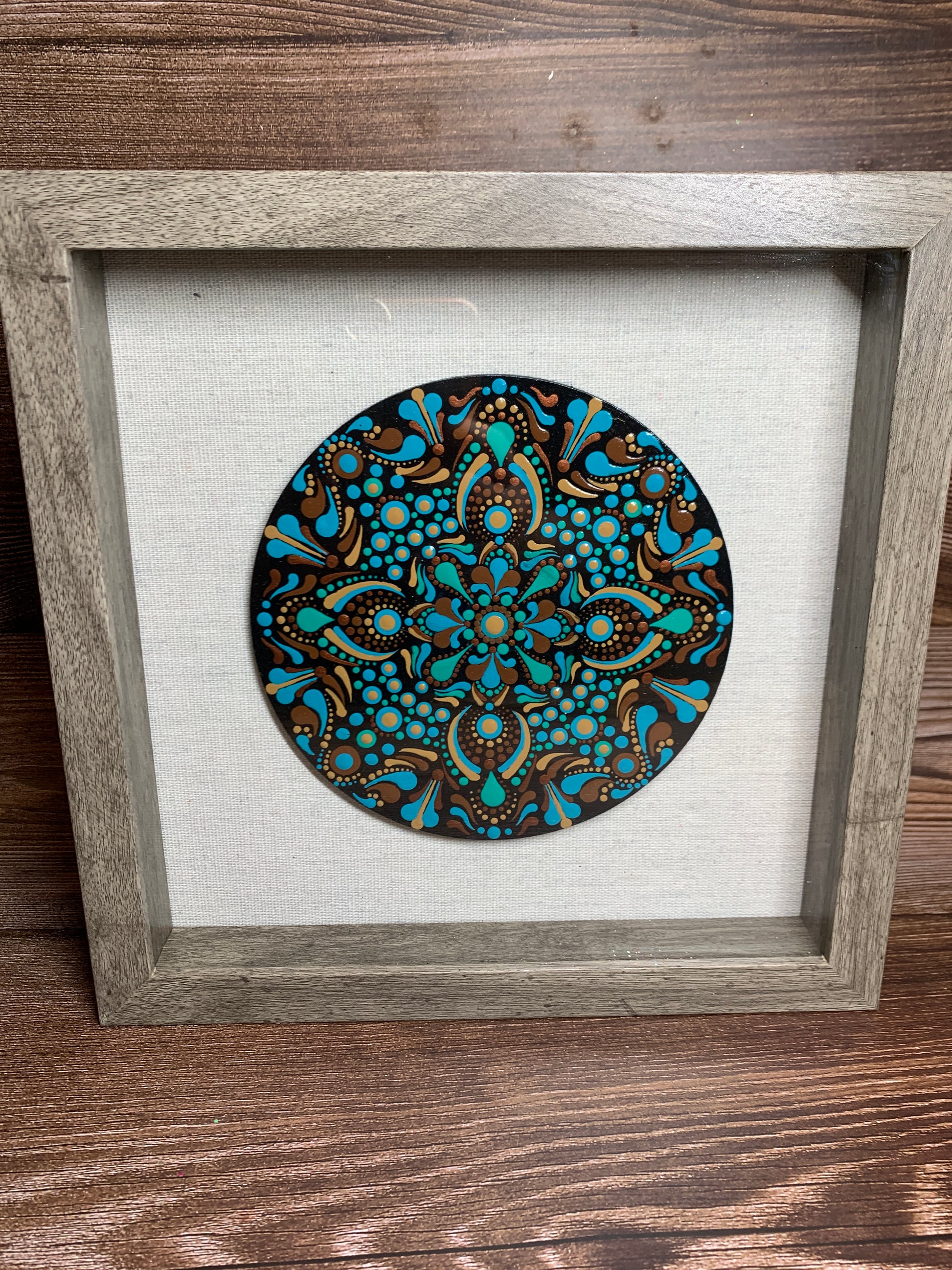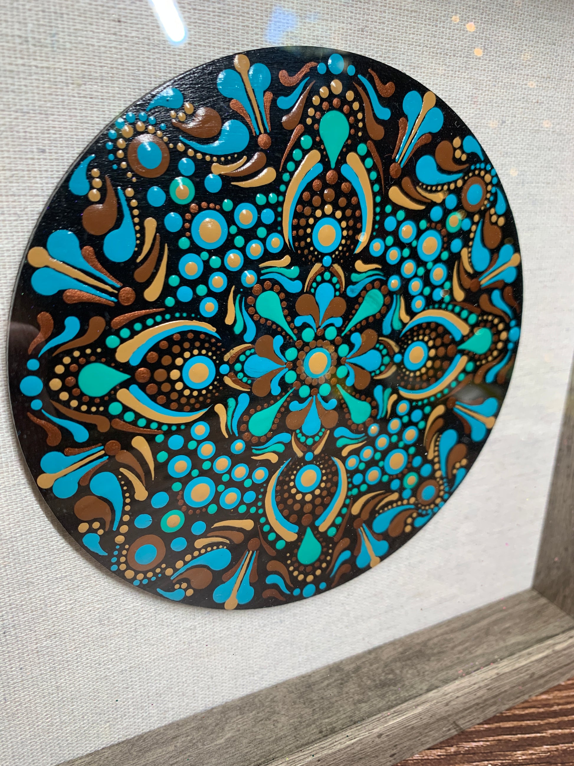 This hand painted dot mandala was designed on a 6" round wood blank in shades of brown, copper and teal on a black background, two coats of gloss varnish were added to protect the art.