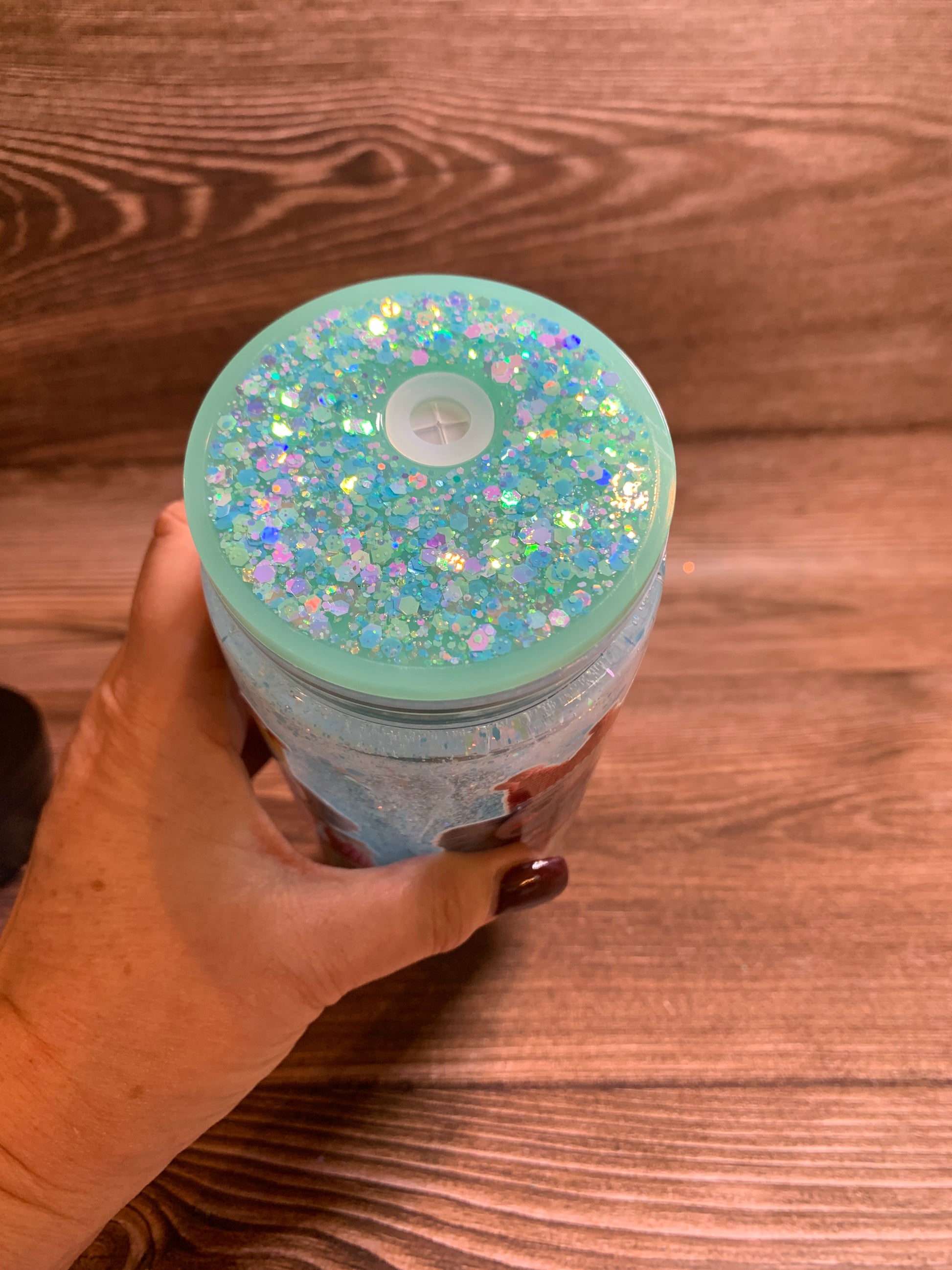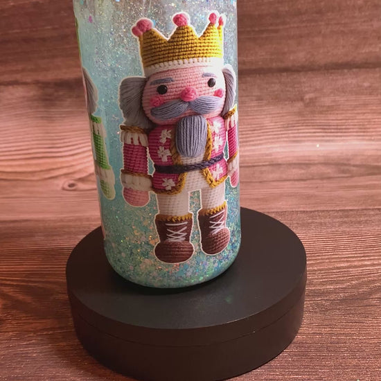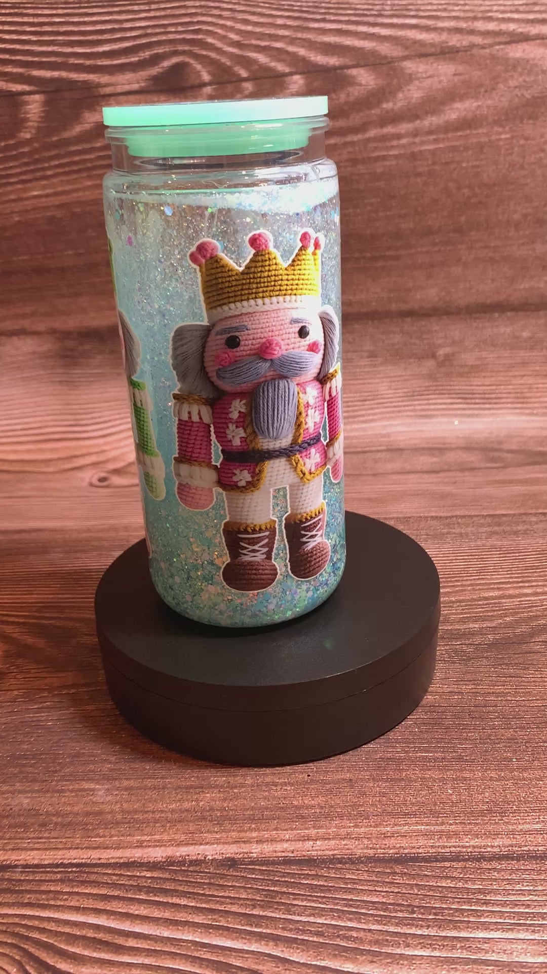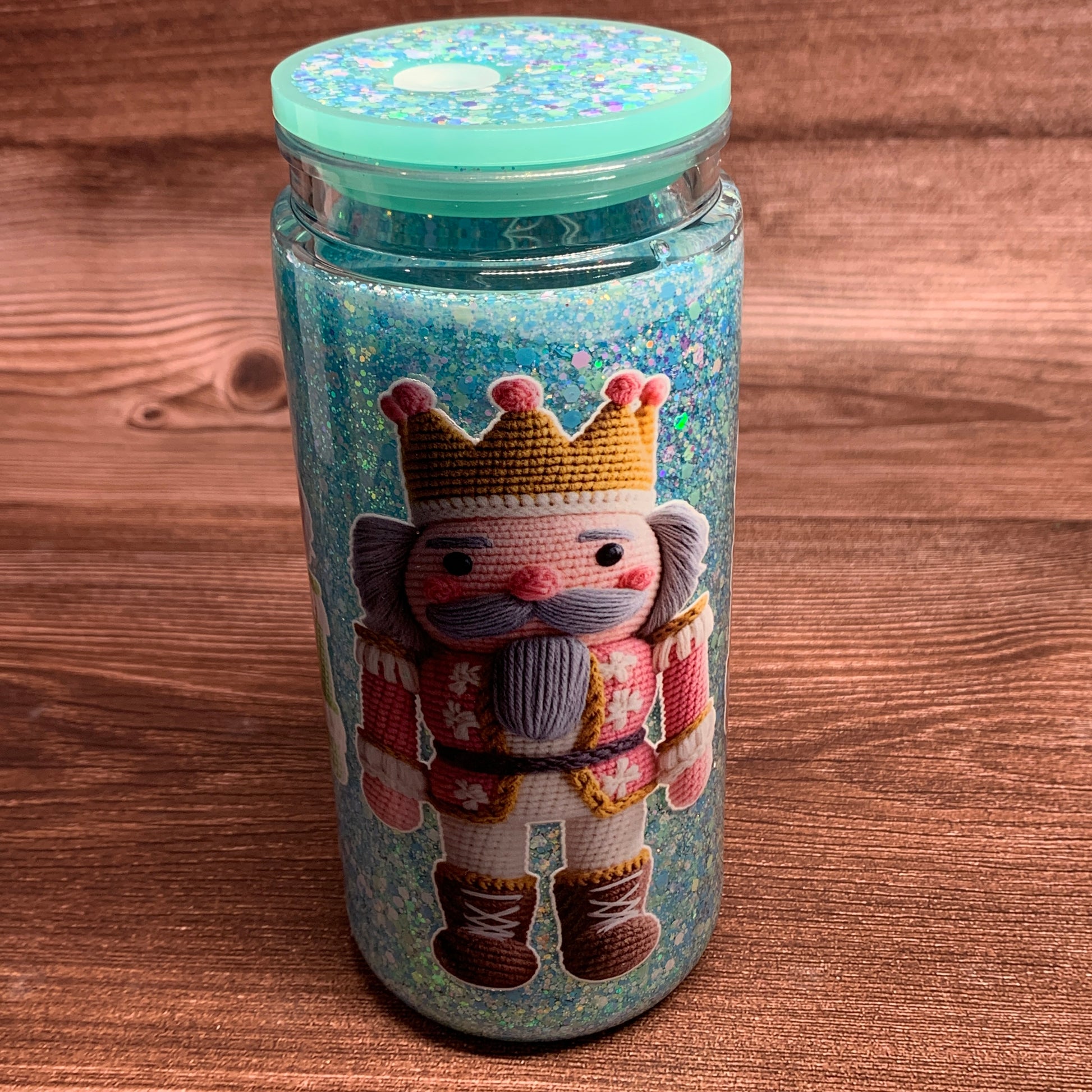 "They may not go to battle, but these Crochet Soldiers are ready to march into your tumbler! This 20 oz Snowglobe tumbler with Suspended matte Blue glitter and features a playful print of red, green, and pink "crocheted" toy soldiers. A must-have for any quirky drinkware collection. (No crochet skills required!)"