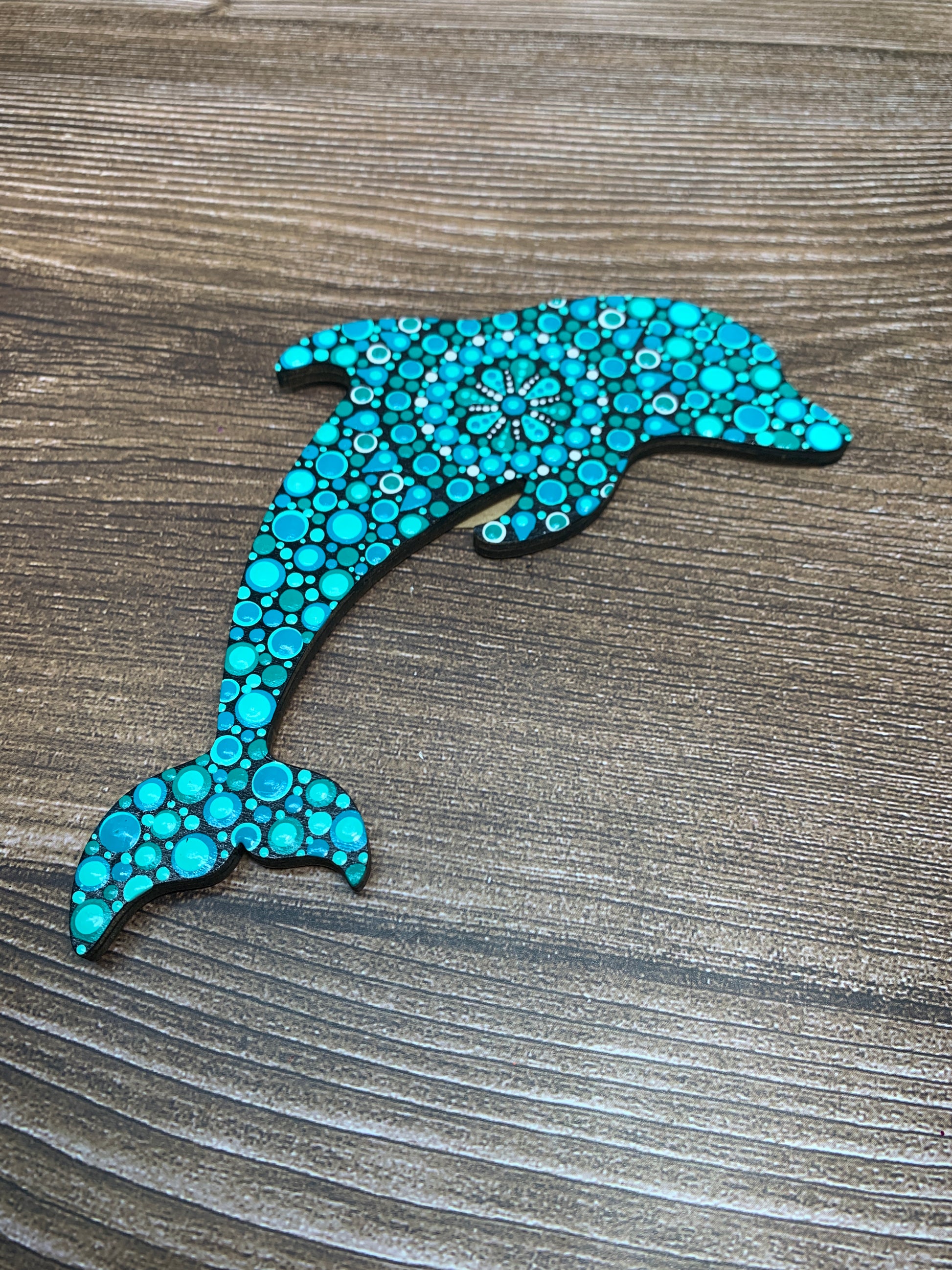 "Make your fridge feel like an aquatic paradise with this unique dolphin magnet! Painted in the Mandala dot art style, this eye-catching beauty will show off your style in any room. Remember to 'dolphinitely' pick one up today!"