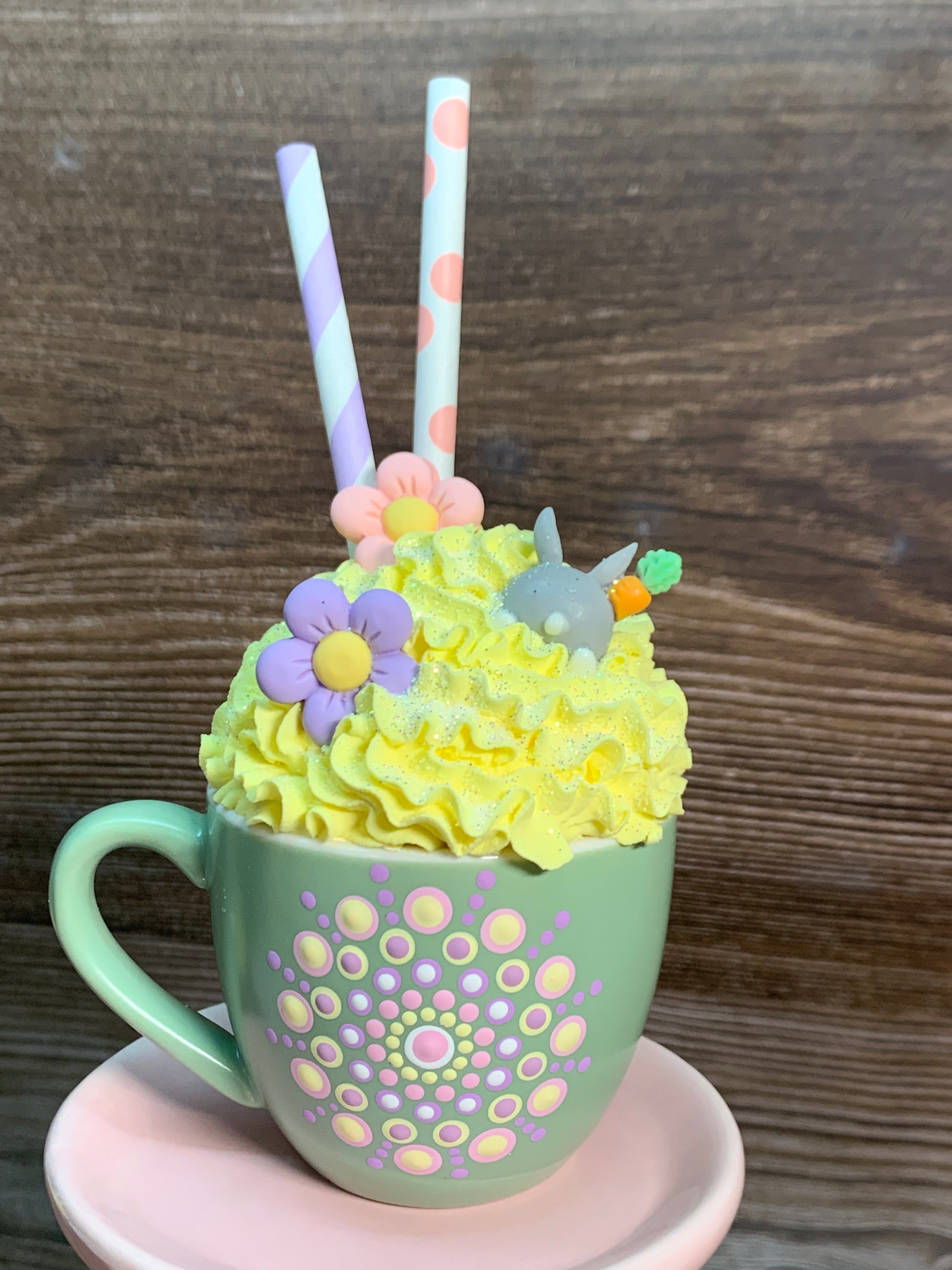 Satisfy your Easter cravings with our hand painted Easter Green Mini Mugs! These adorable mugs are filled with Faux Whipped Cream, adorned with festive Paper Straws, and topped with adorable Easter themed decorations. Perfect for a touch of whimsy and fun to your holiday celebrations!