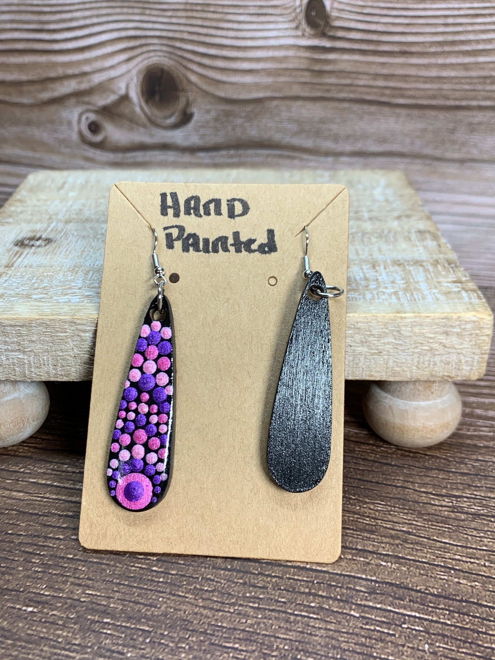 I Hand Dotted these 1/8" Wood Earrings using shades of Pink and Purple Metallic Acrylic paint.