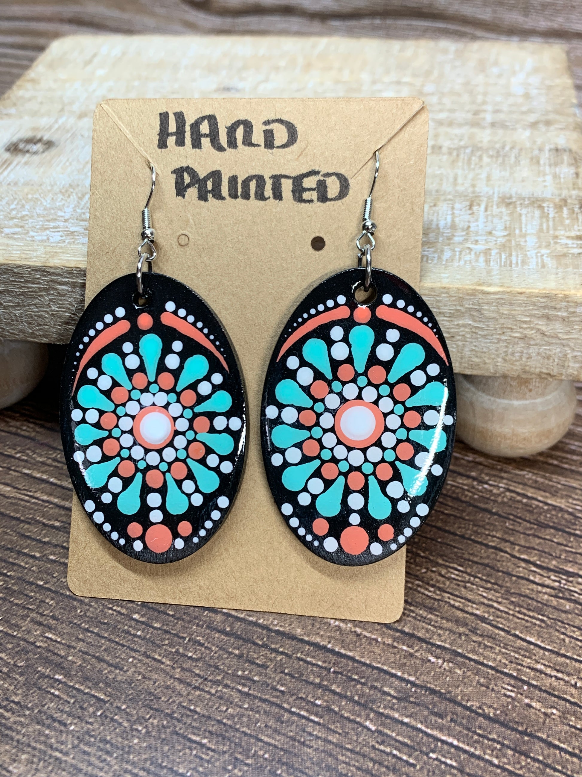 I Hand Dotted these 1/8" Wood Earrings using shades of Aqua, Coral and White Acrylic paint.