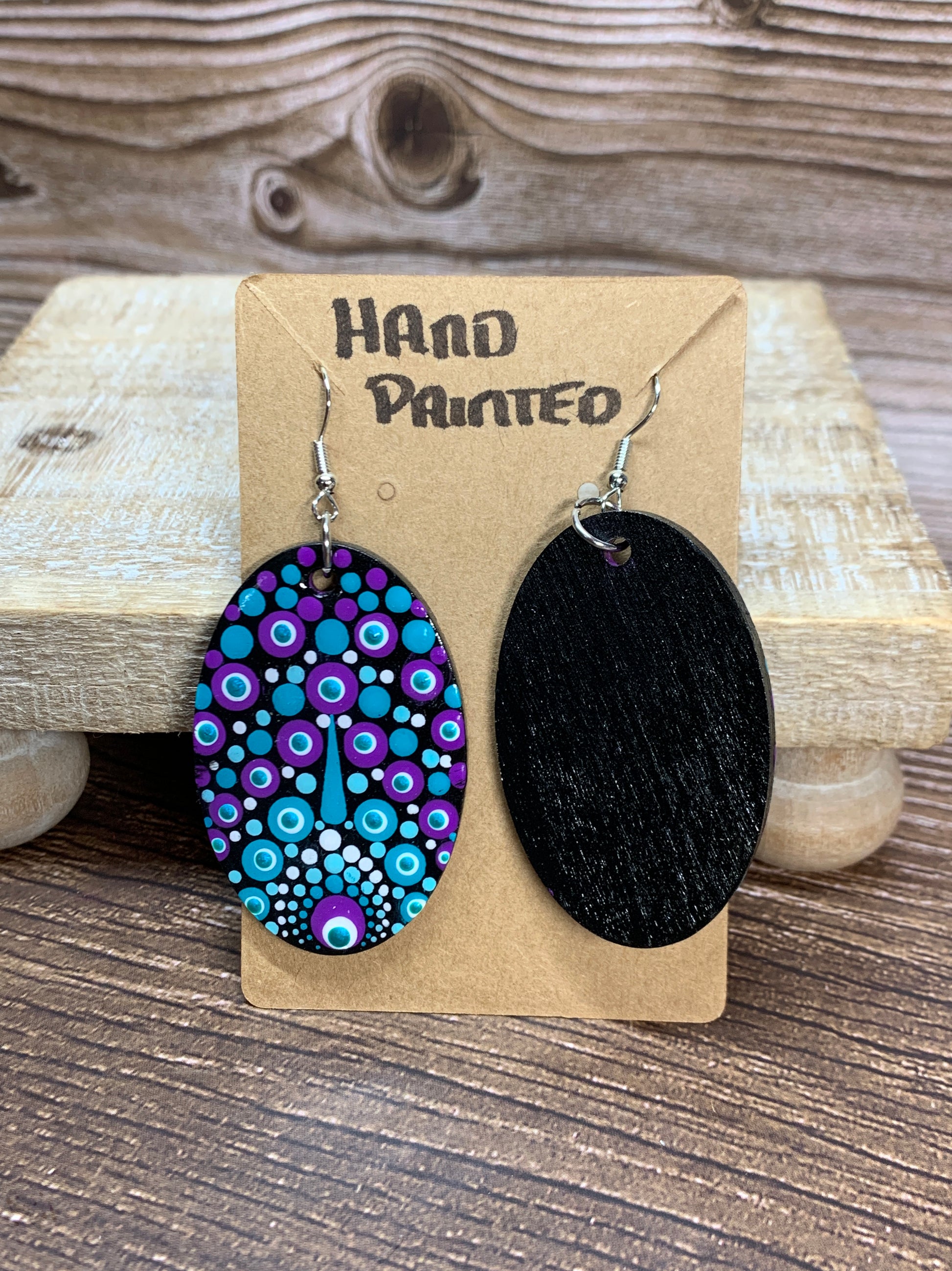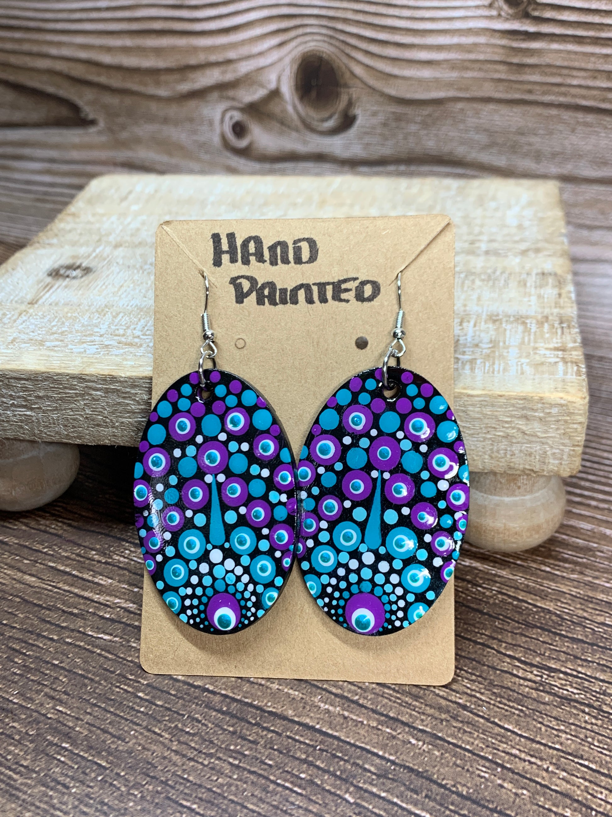 I Hand Dotted these 1/8" Wood Earrings using shades of Teal, Purple and White Acrylic paint.