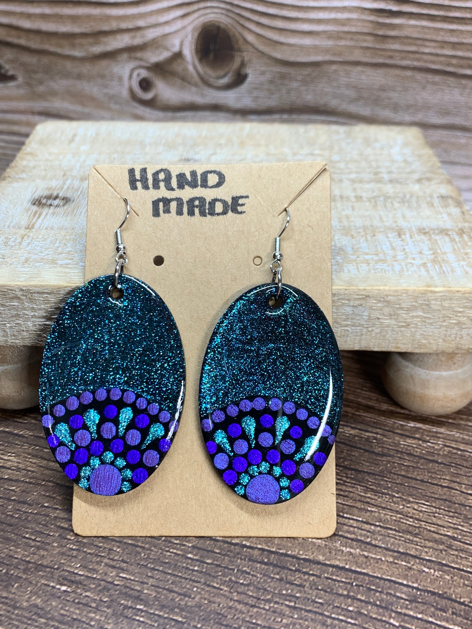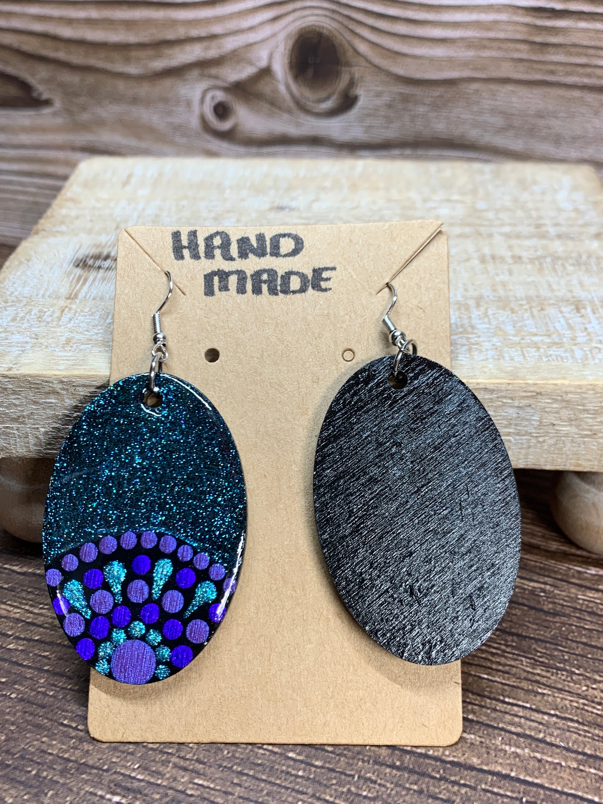 I Hand Dotted these 1/8" Wood Earrings a Blue Shimmer Background with light blue Shimmer and two shades of Purple Metallic Acrylic paint.