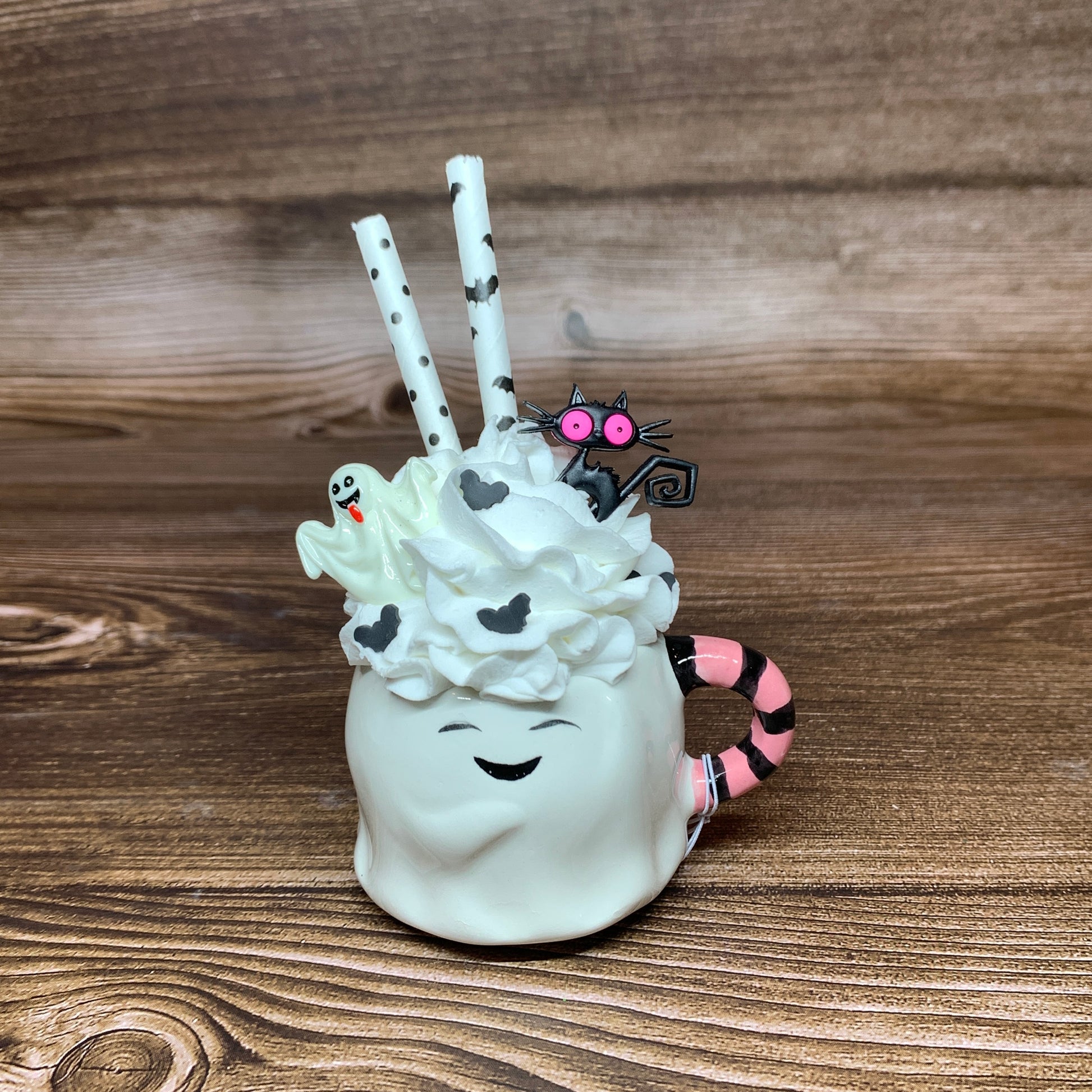 Introducing the Ghost Mini Mugs - perfect for your Halloween coffee bar! These spooky ceramic mugs are filled with faux whipped cream and adorned with frightful cats, making them the perfect tier tray decoration. Add some fun and fright to your morning routine!