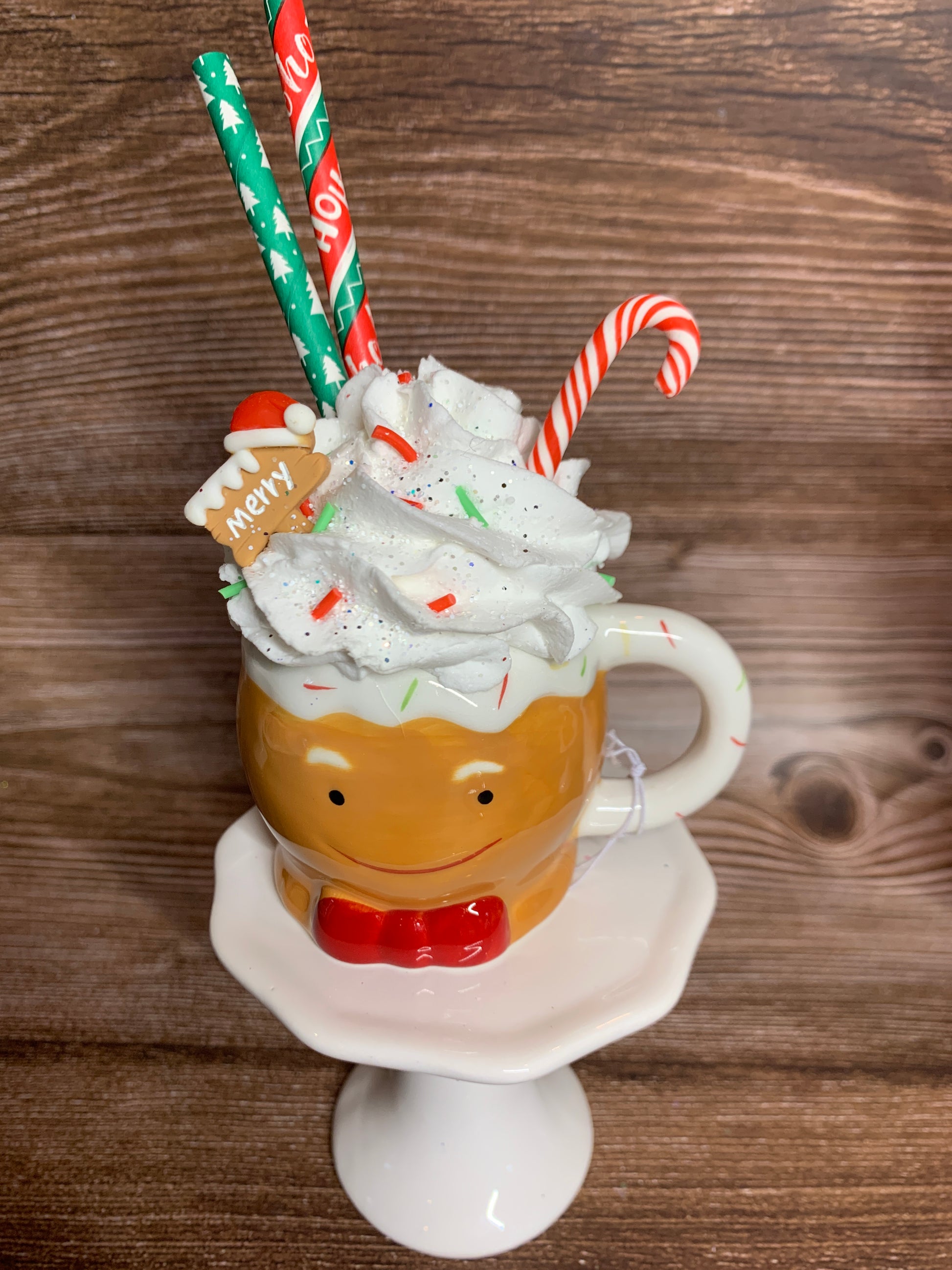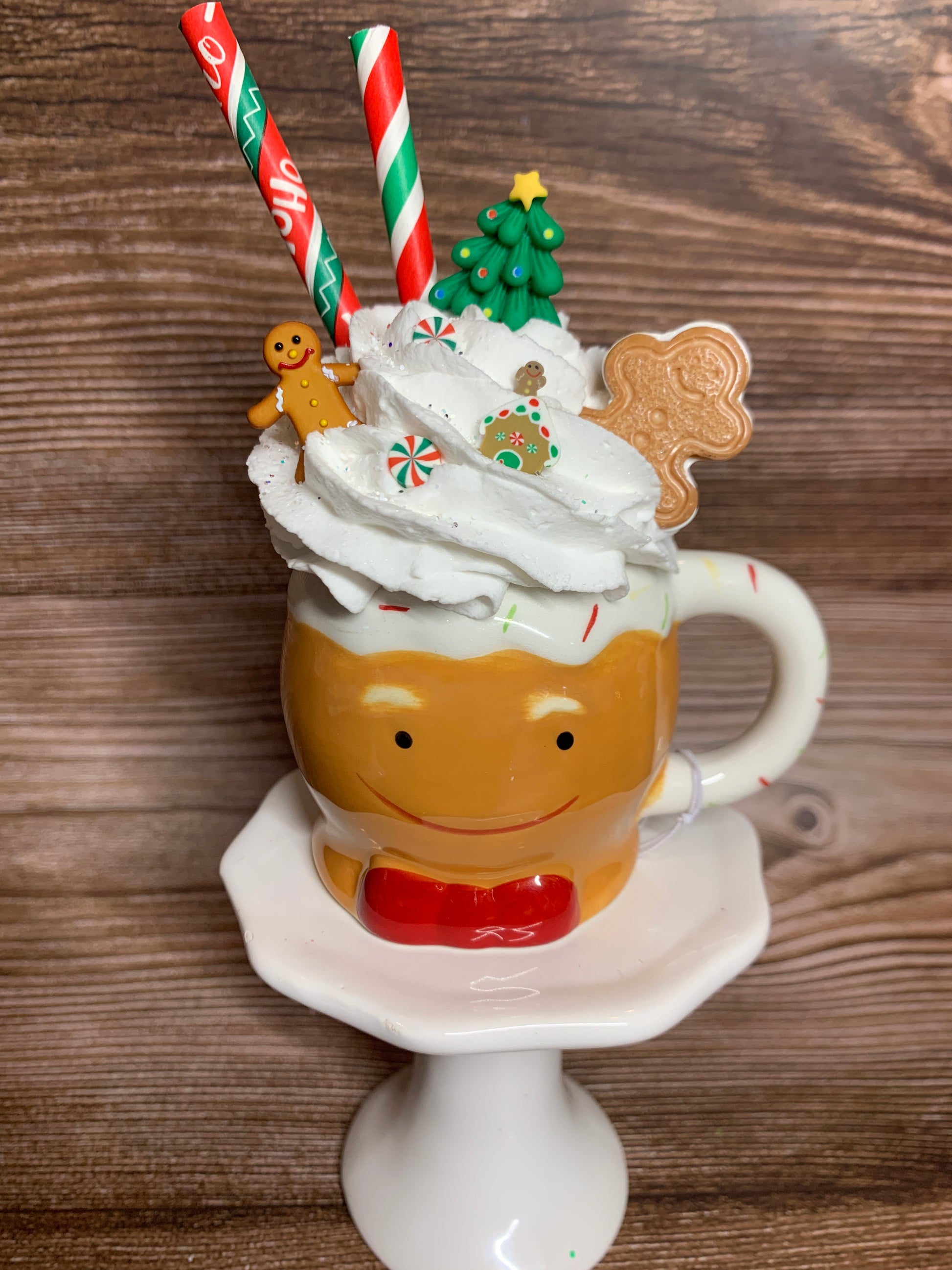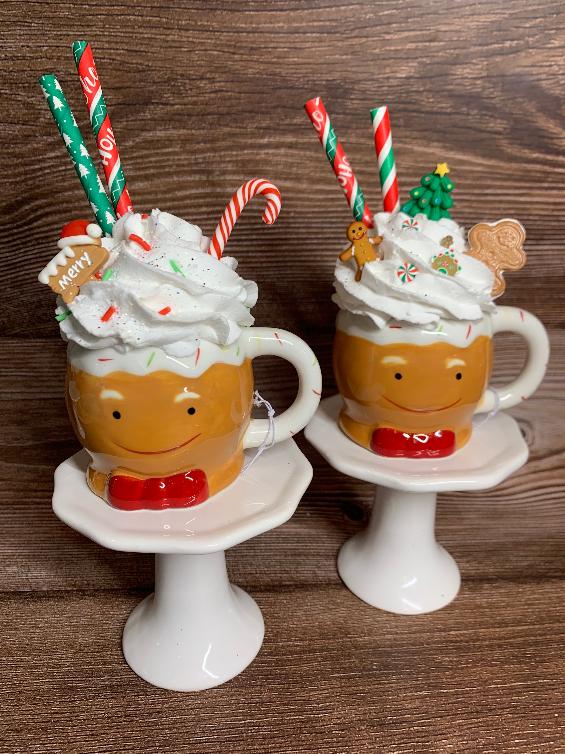 Indulge in festive fun with our Gingerbread Men Mini Mugs! These cute ceramic mugs come filled with faux whipped cream and adorned with polymer clay decorations and glitter. A sweet addition to your Christmas or tier tray decor. Have a ho-ho-happy holiday season!