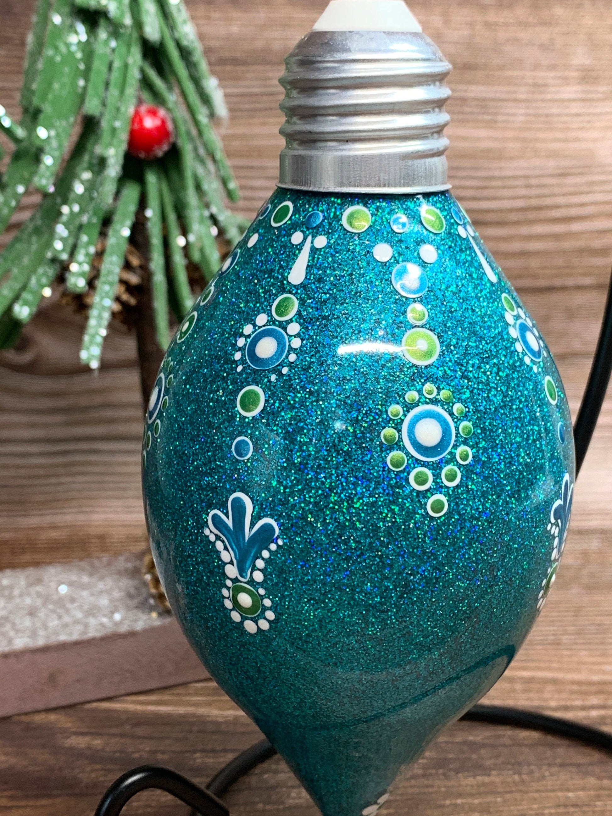 I coated the inside of this Lightbulb Shaped Ornament with a fine teal Glitter then painted the design with white green and blue metallic paints
