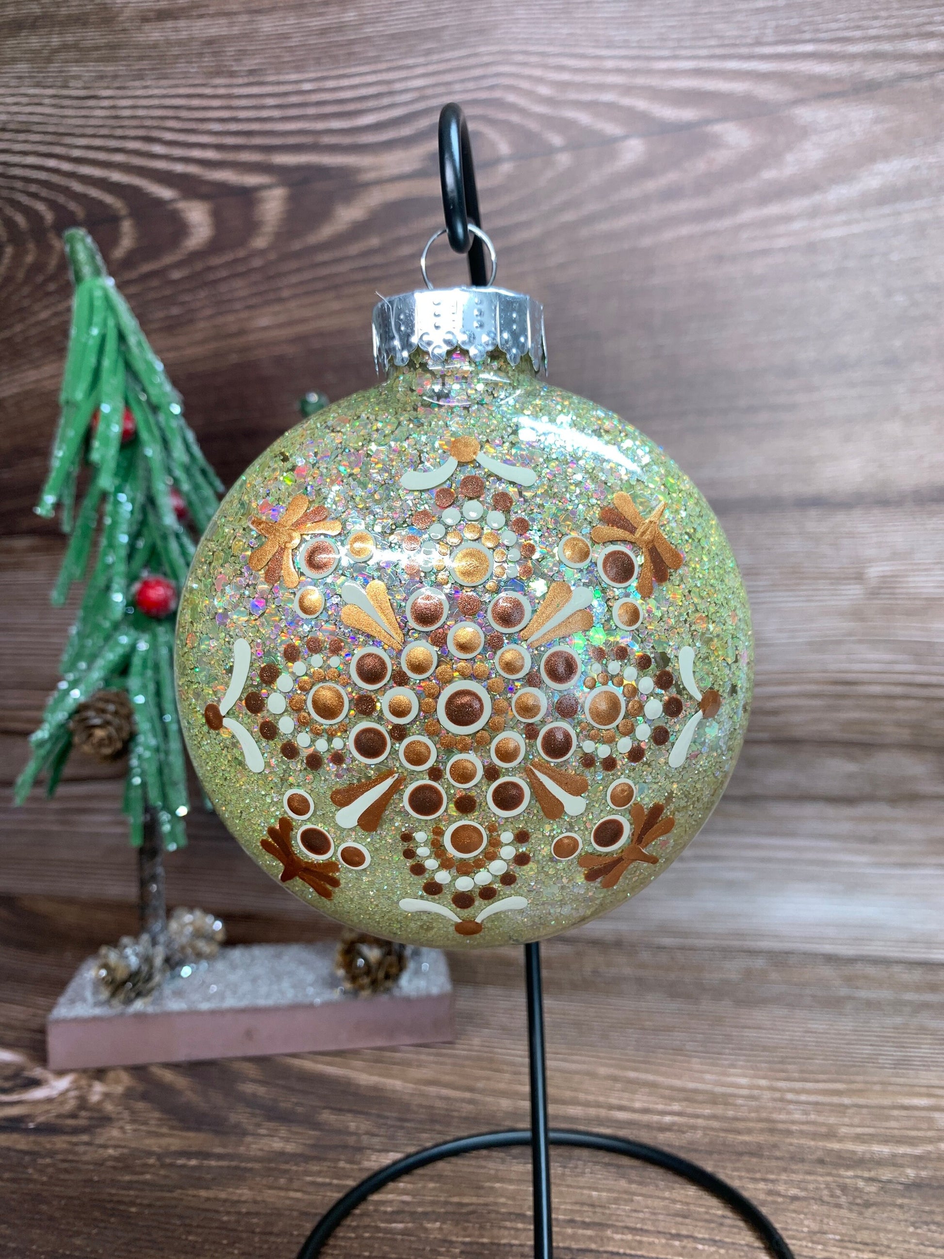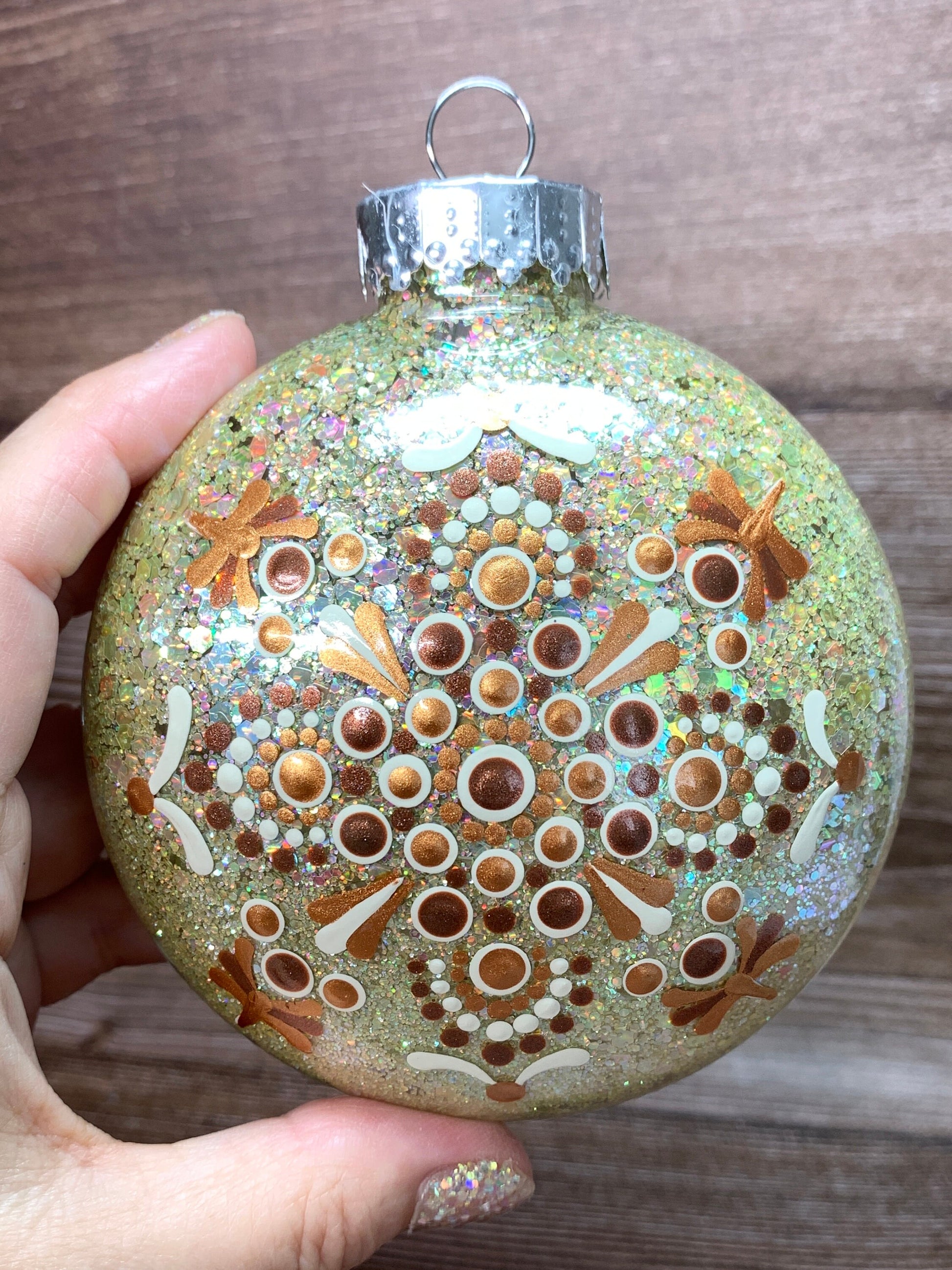 This Mandala Ornament has been Hand Glittered and Painted using the technique formally called Pointillism or Dotted Art.