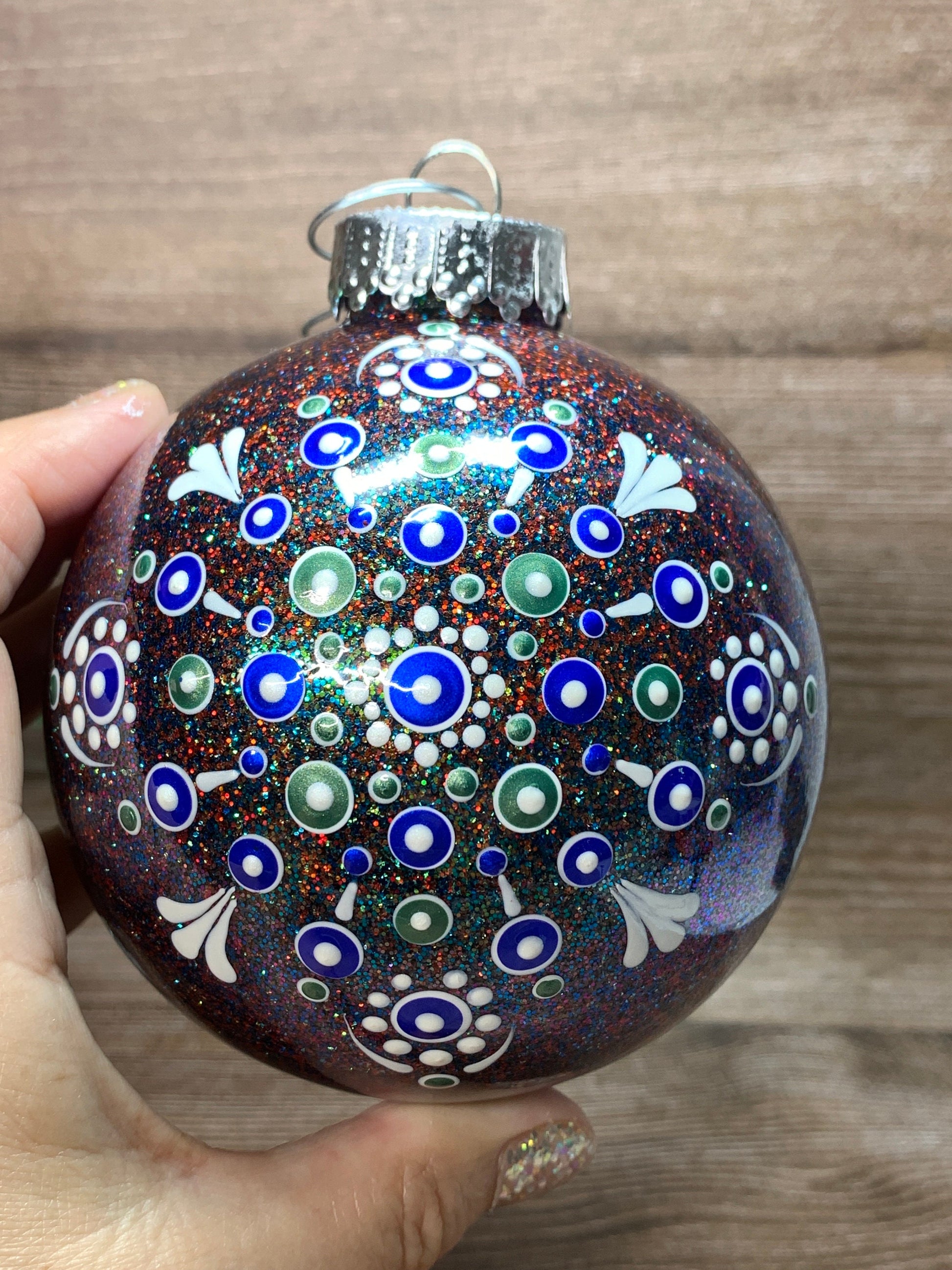 This Mandala Ornament has been Hand Glittered and Painted using the technique formally called Pointillism or Dotted Art.