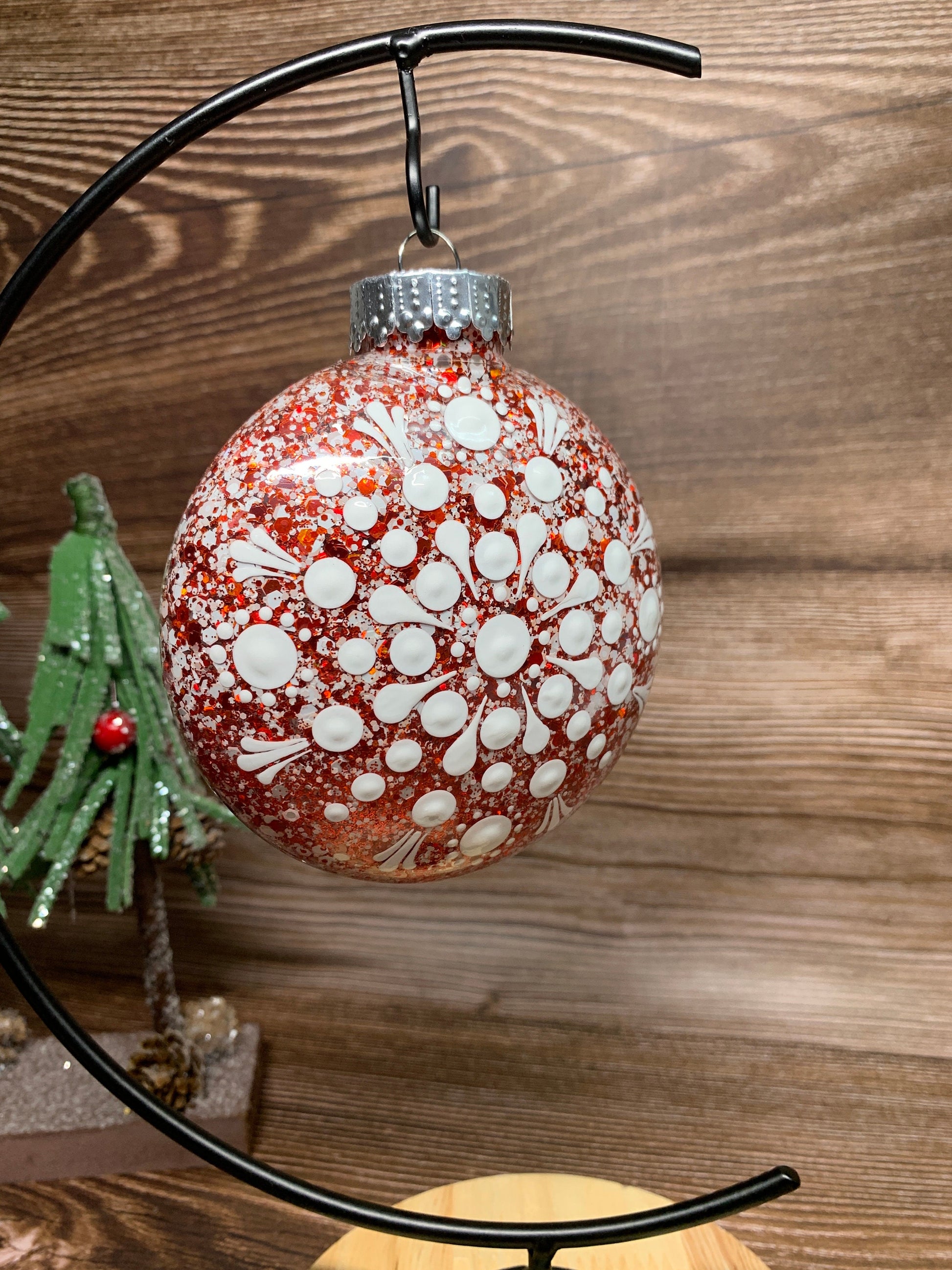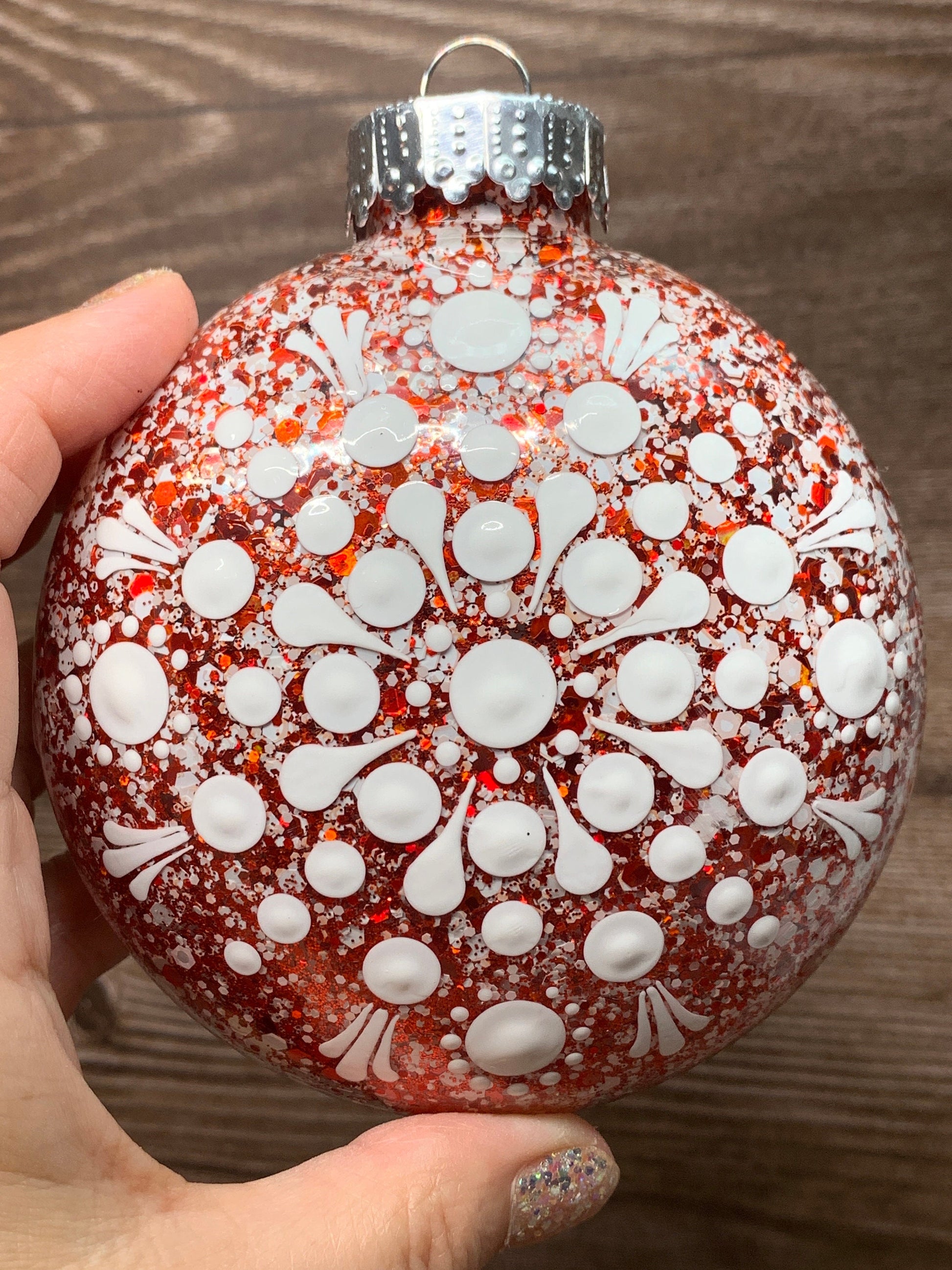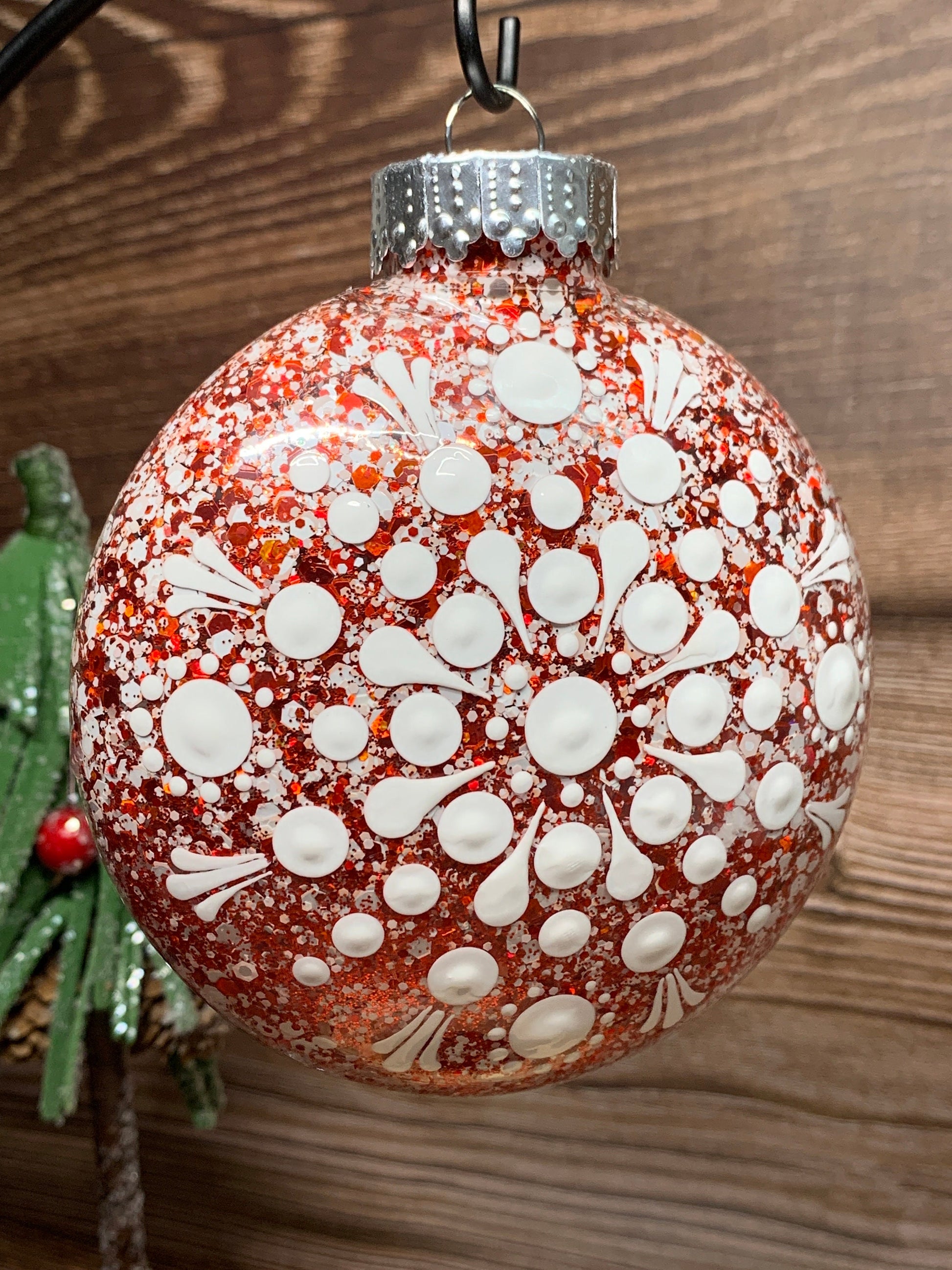 I coated the inside of this Disc Ornament with a Chunky red and white Glitter then painted the ornament with glossy white paint