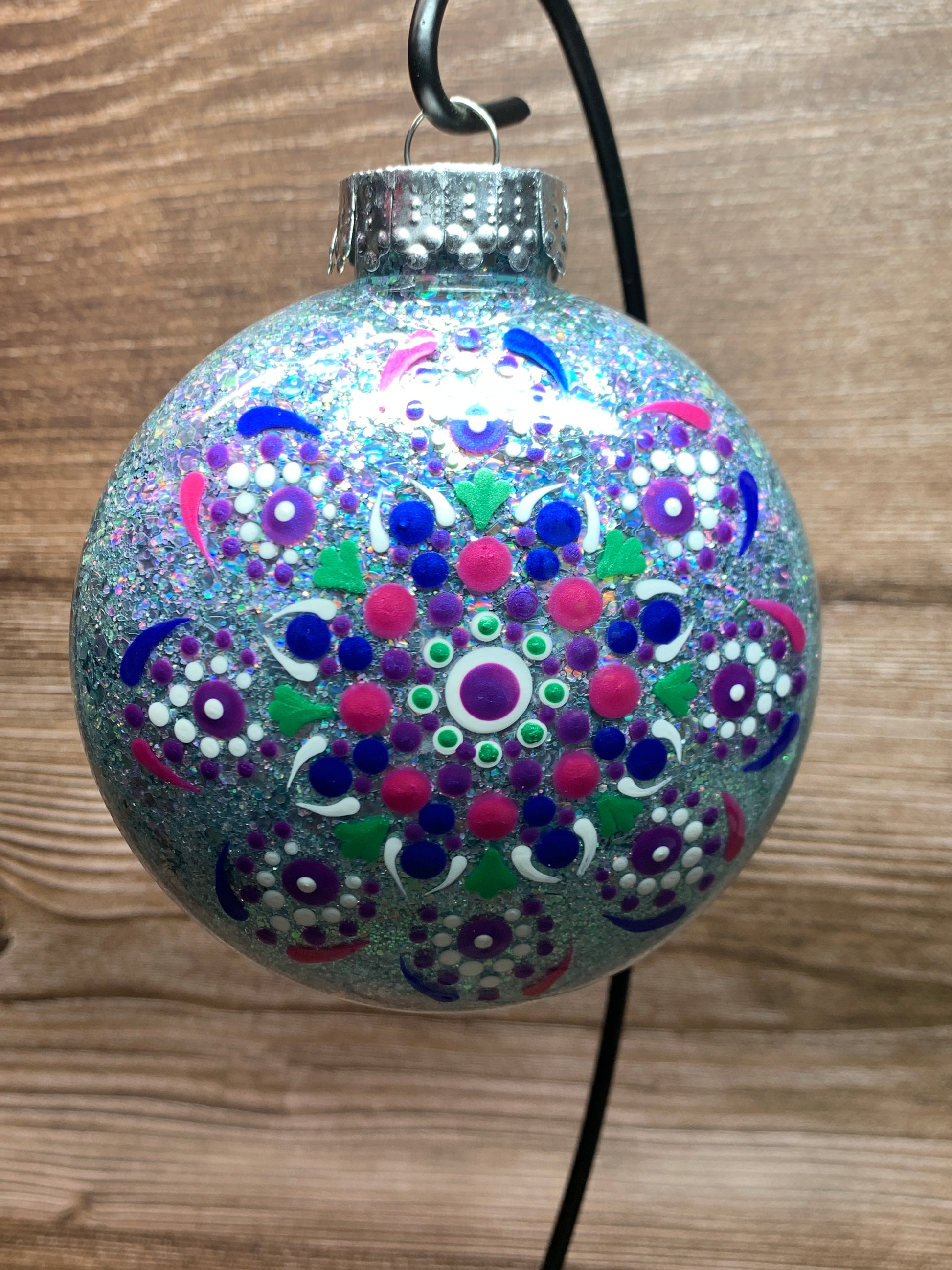 This Mandala Ornament has been Hand Glittered and Painted using the technique formally called Pointillism or Dotted Art.