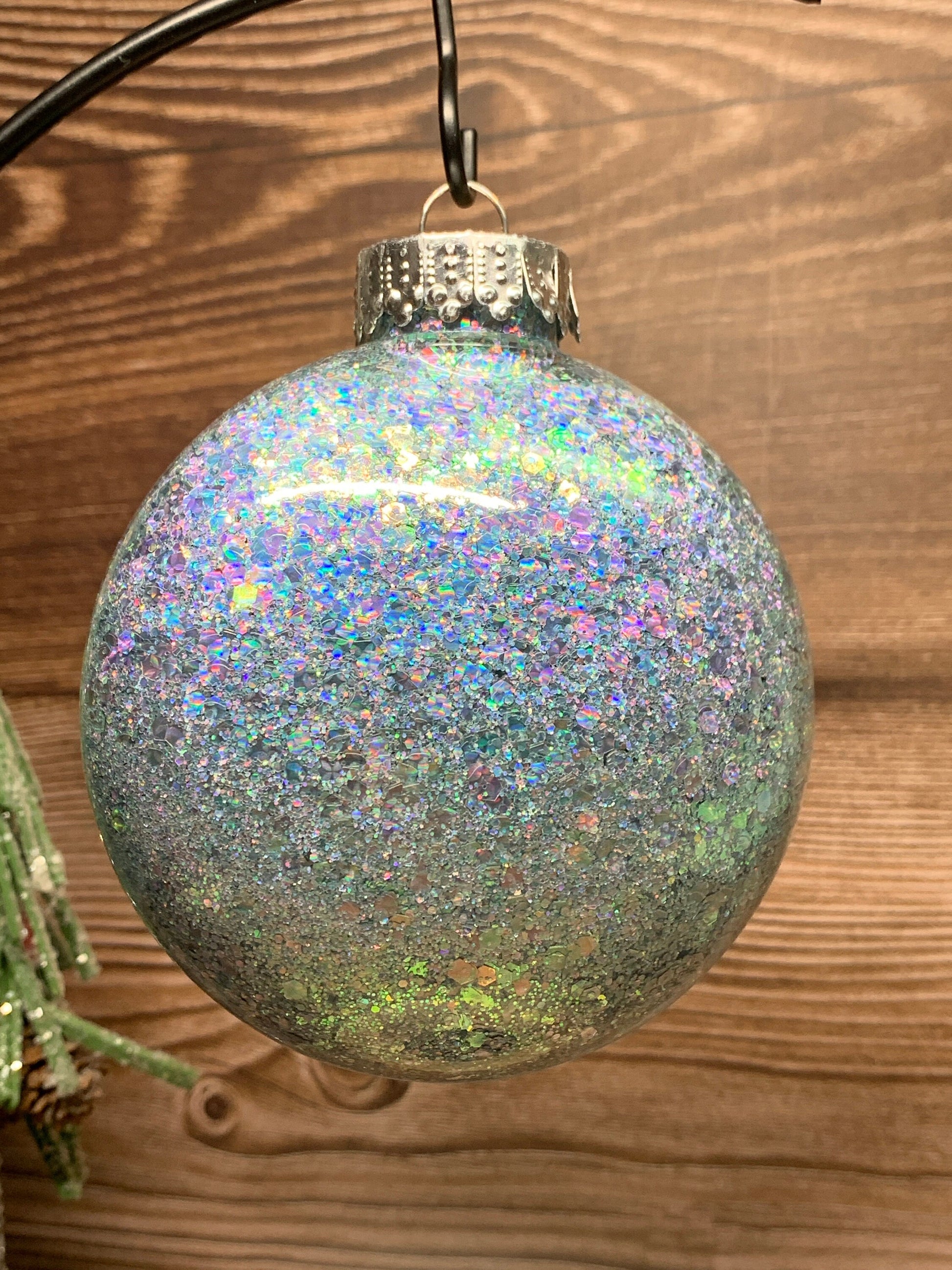 I coated the inside of this Disc Ornament with a Chunky Blue Glitter with a purple pink shift then painted the ornament with White, Blue, Fuschia, Green and Purple paint
