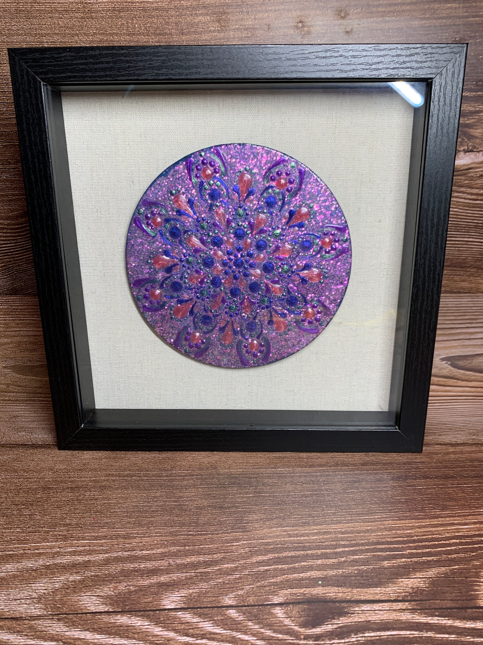 This hand painted dot mandala was designed on a 6" round wood blank. Color shifting semi-translucent dimensional paints in shades of pink, purple & green were used on a highly glittered pink/purple background, two coats of gloss varnish were added to protect the art.