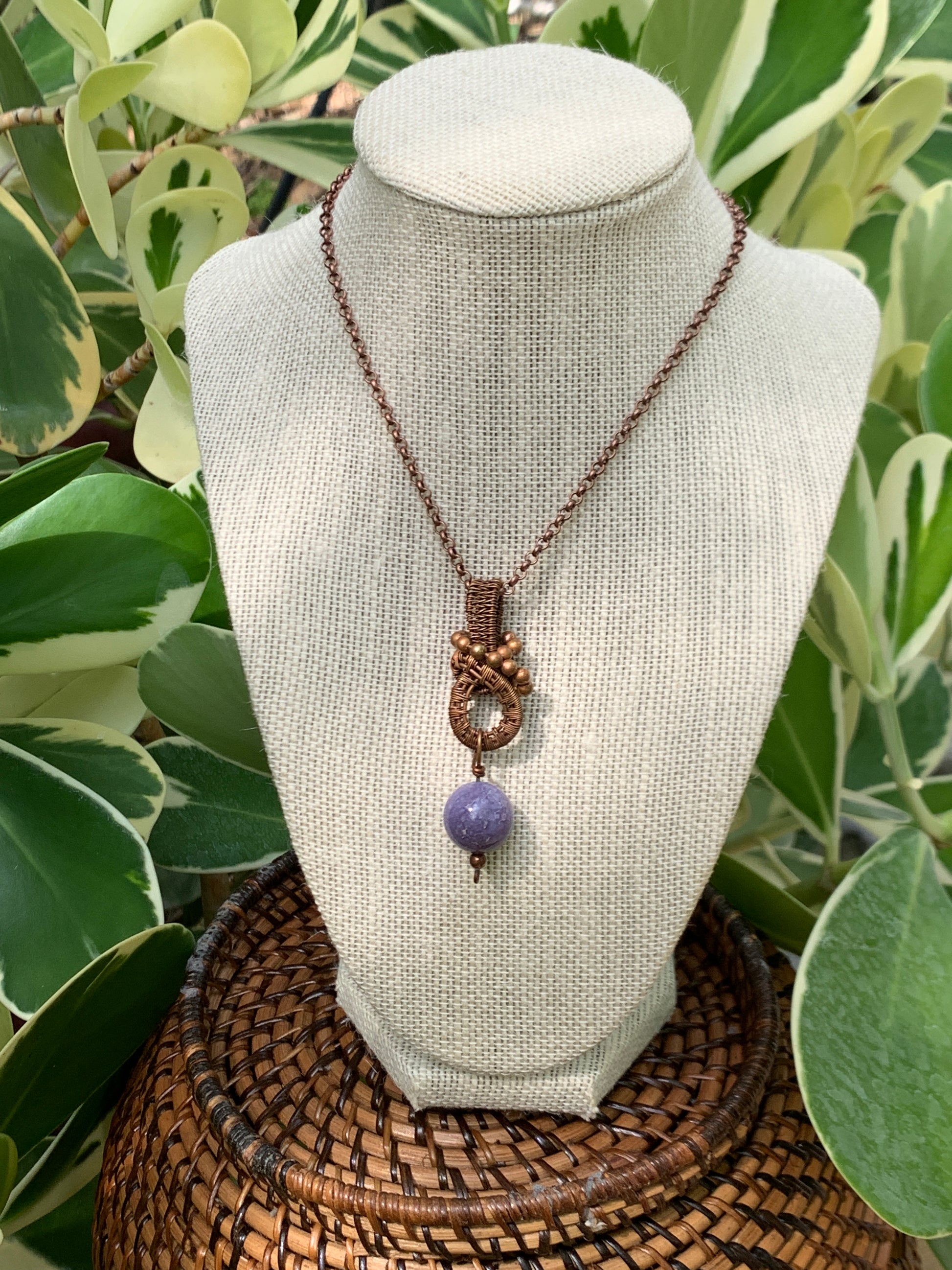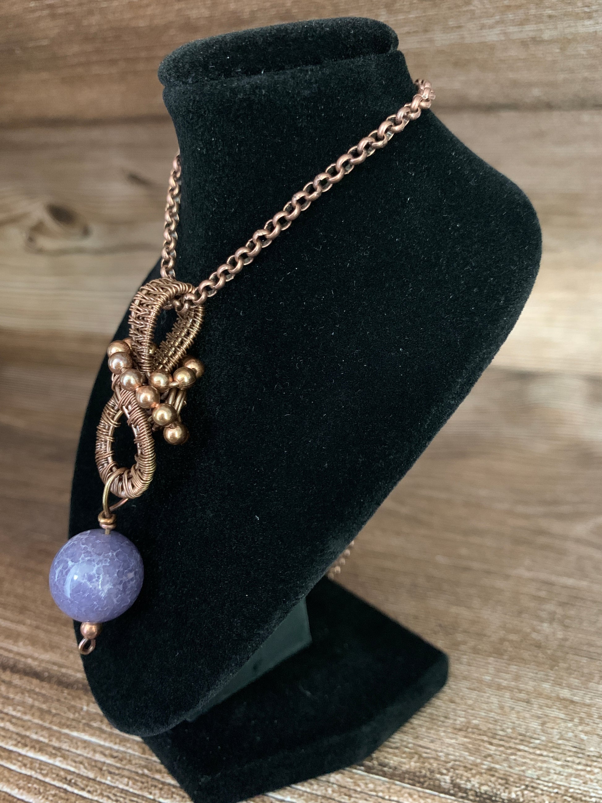 A Grape Agate bead dangles from a pendant that has been woven in copper wire.