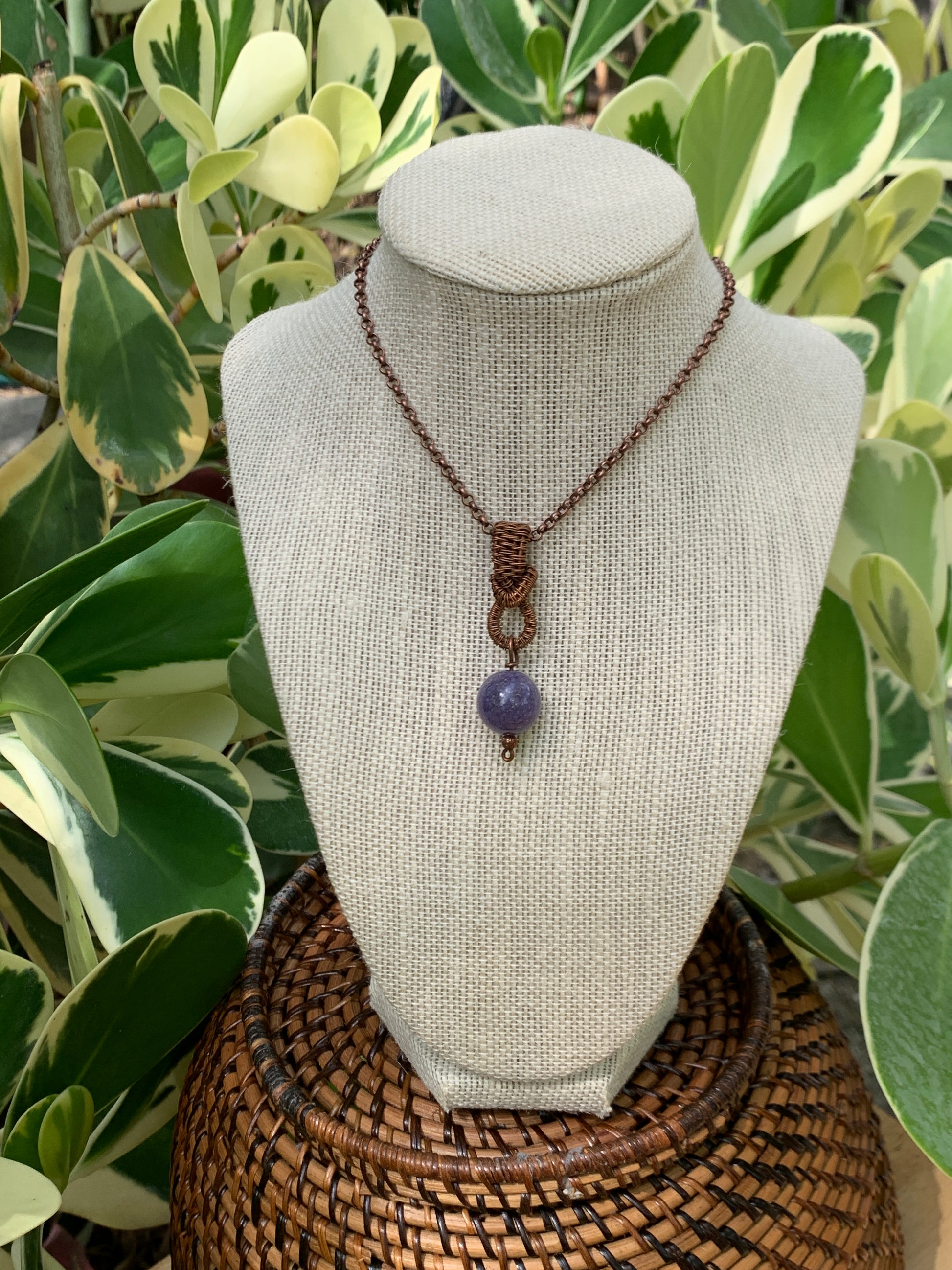 A Grape Agate bead dangles from a pendant that has been woven in copper wire.