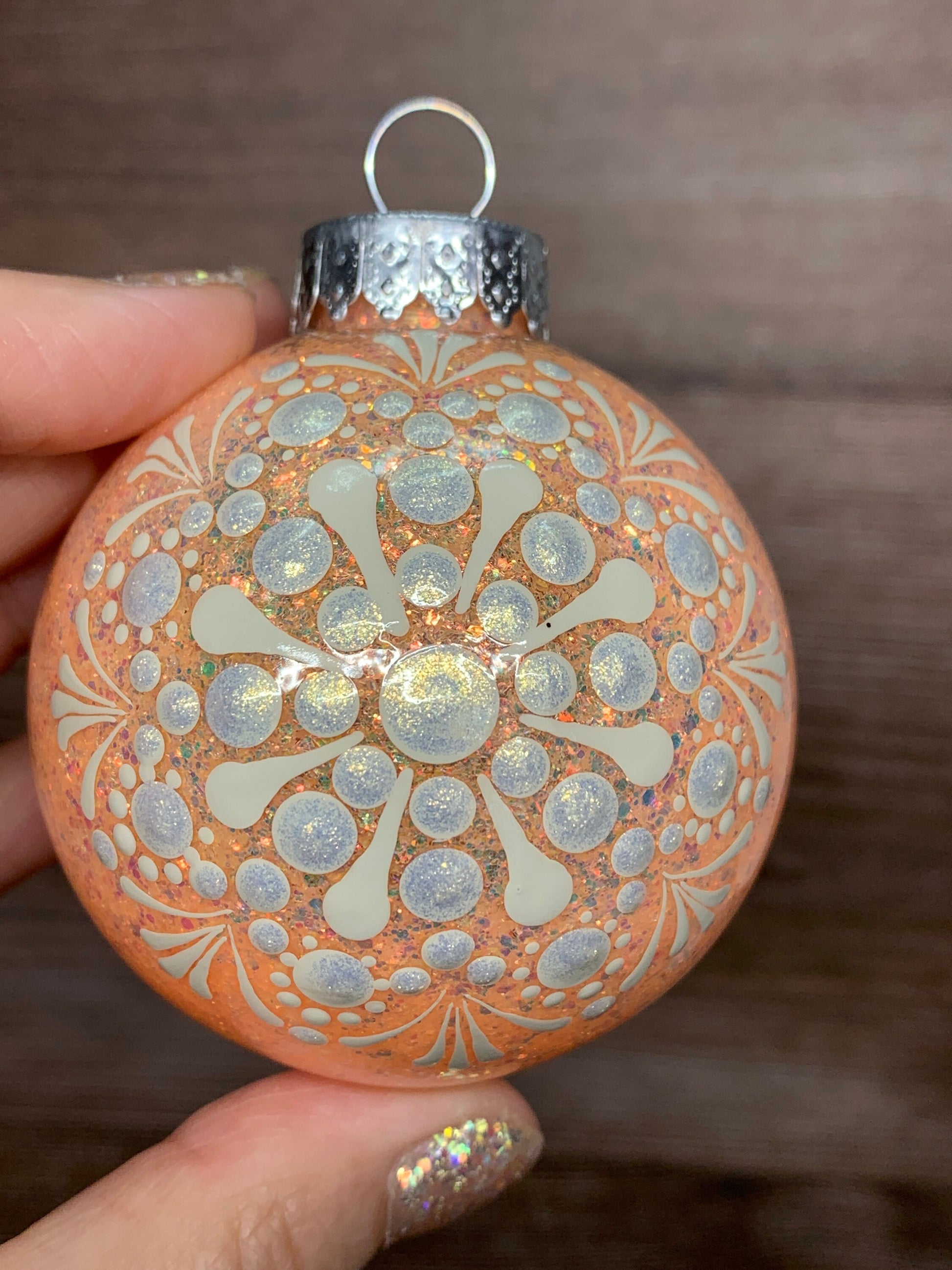 This Mandala Ornament has been Hand Glittered and Painted using the technique formally called Pointillism or Dotted Art.