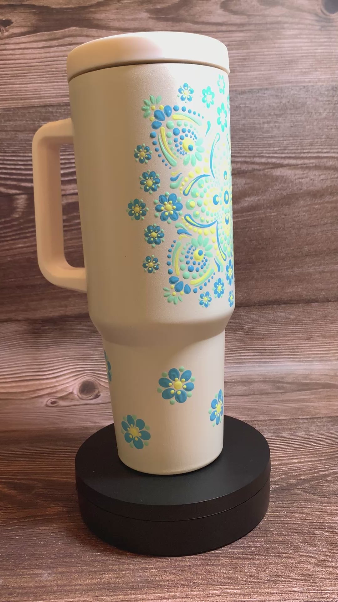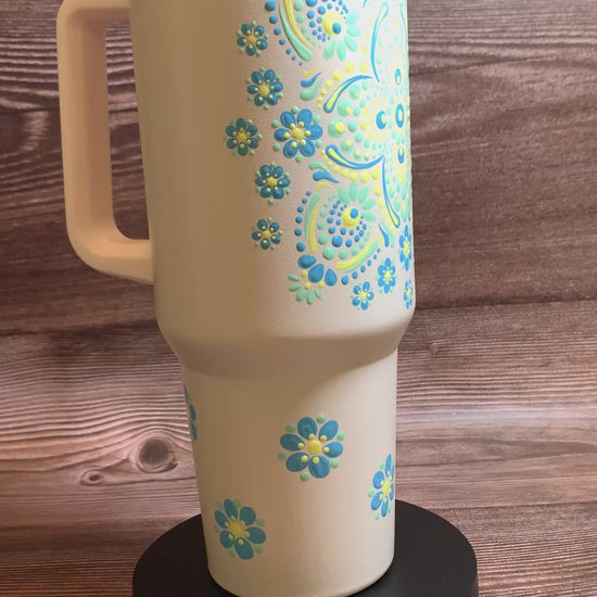 Stay stylishly hydrated with our Handled Tumbler! This large cream-colored tumbler features a unique handpainted design in turquoise, mint green, and yellow with charming flowers and a mandala. Its convenient handle makes it easy to carry on the go. Stay hydrated in style!