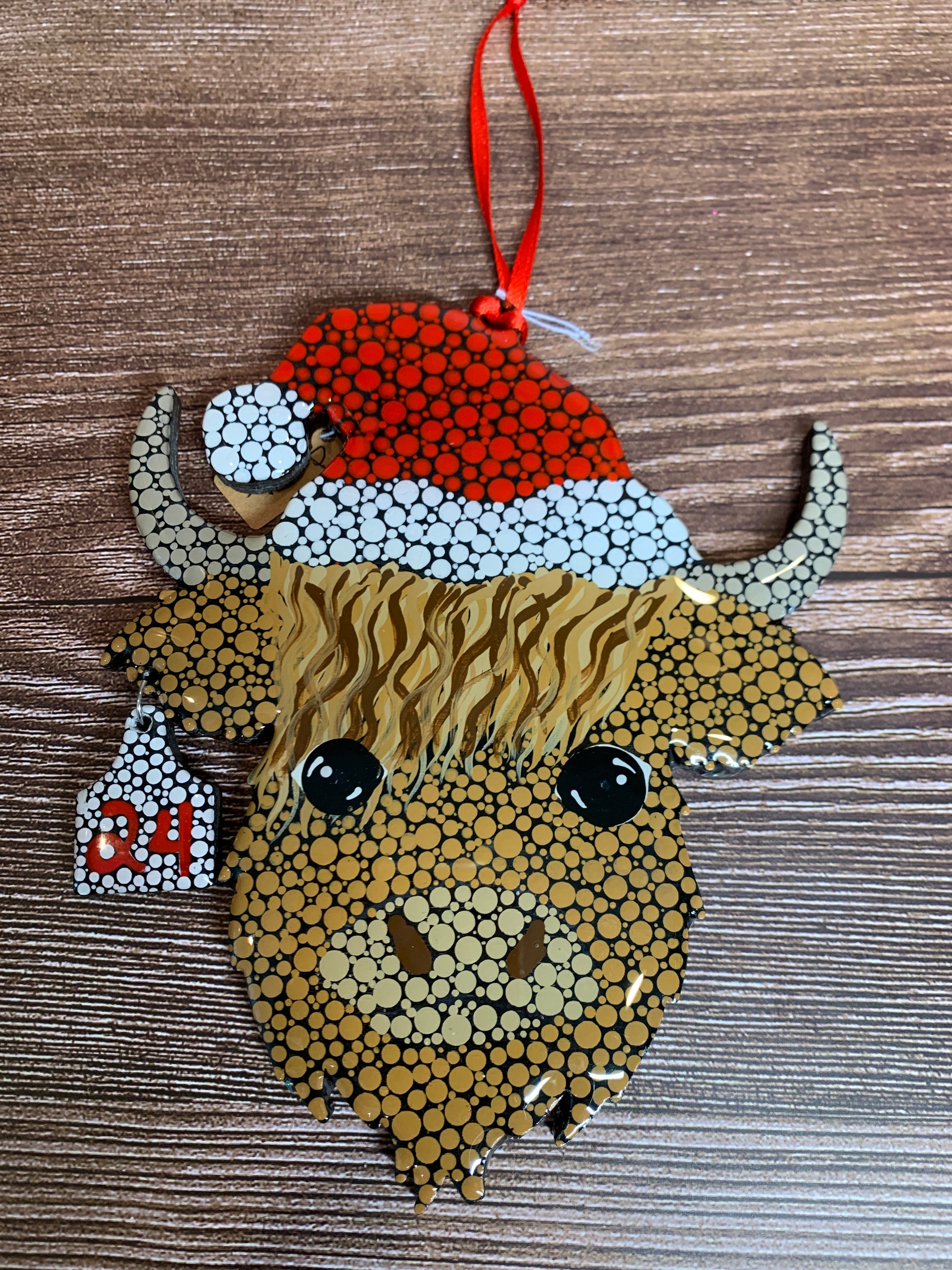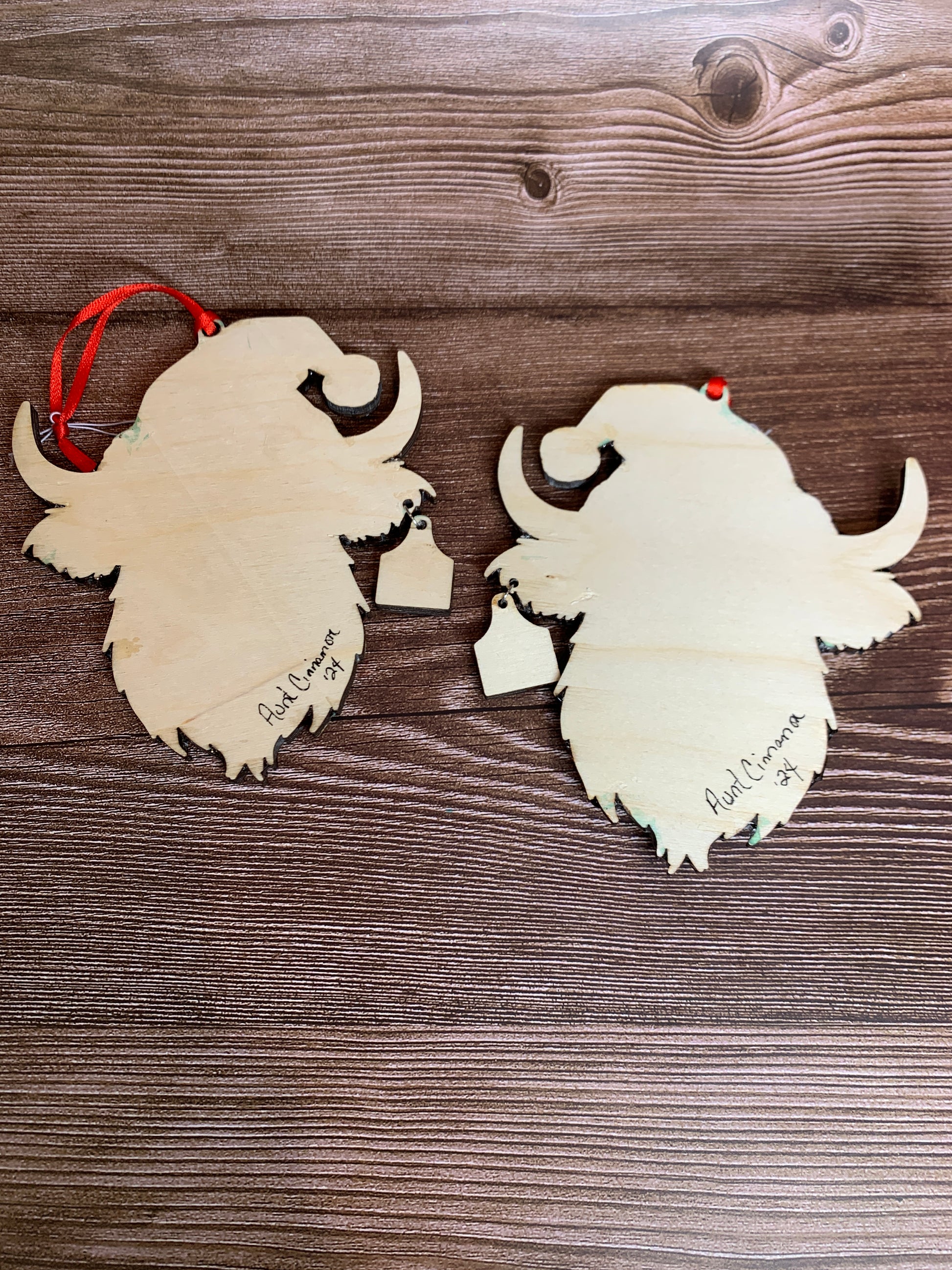 These adoreable highland cow ornaments were cut from 1/4” Baltic birch plywood on a laser cutting machine. I then hand painted them with various shades of brown, white, red and black. Once dry two coats of epoxy resin was applied to protect the art and give it depth and shine.